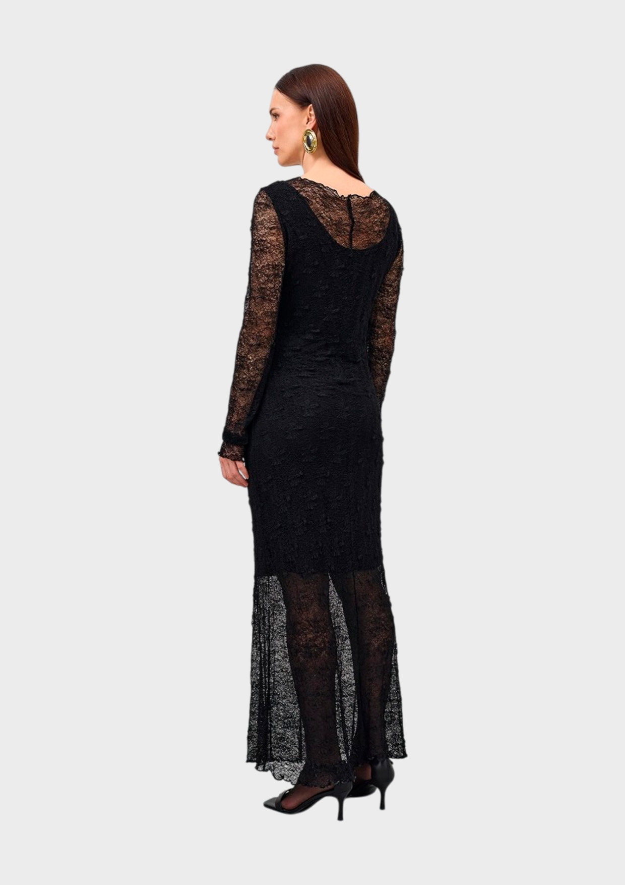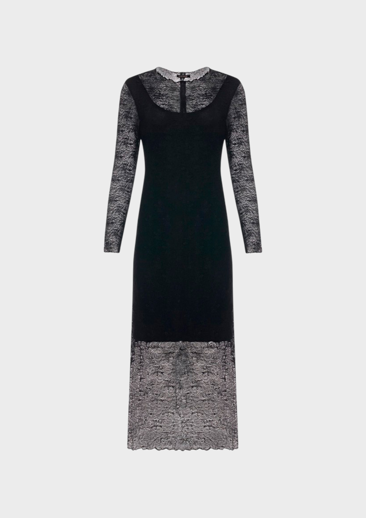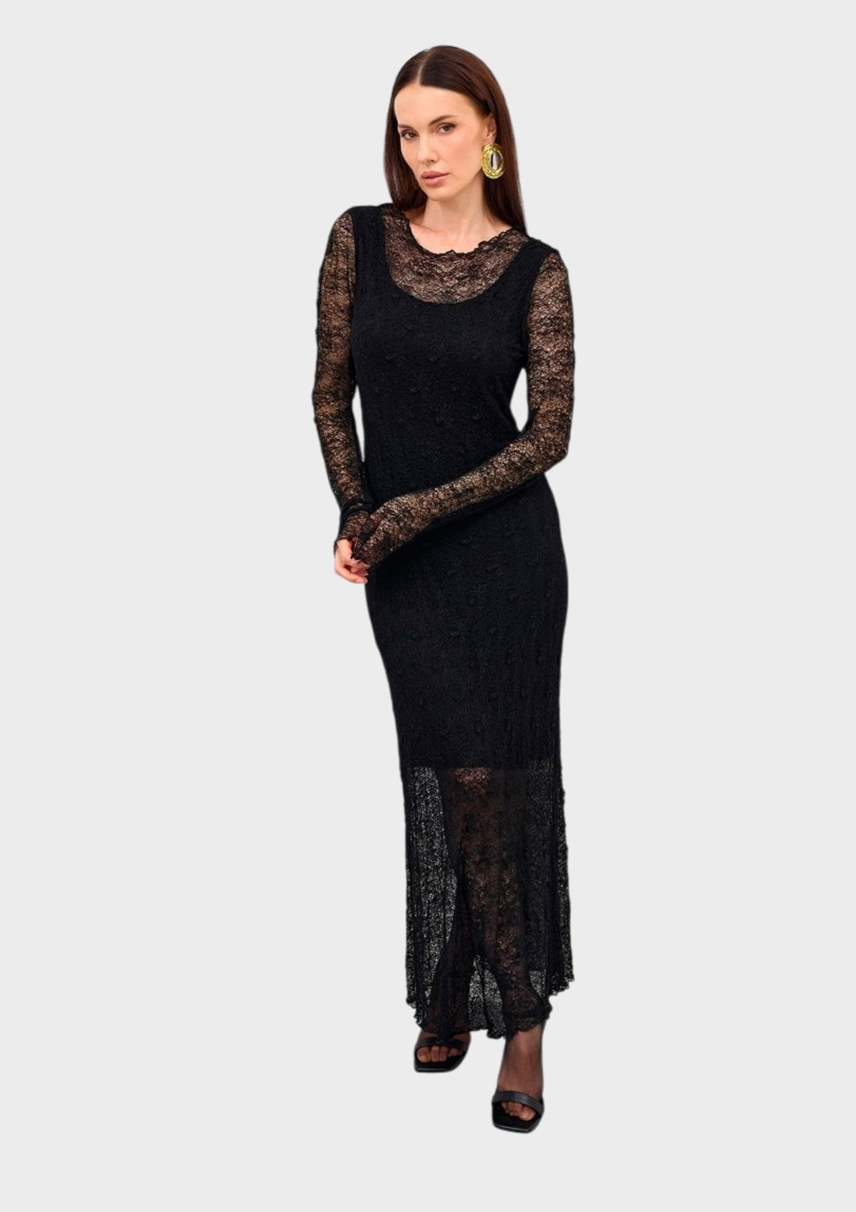 Кружевное полупрозрачное платье-макси. Полуприталенный силуэт. Круглый вырез. Подкладка из 100% вискозы.