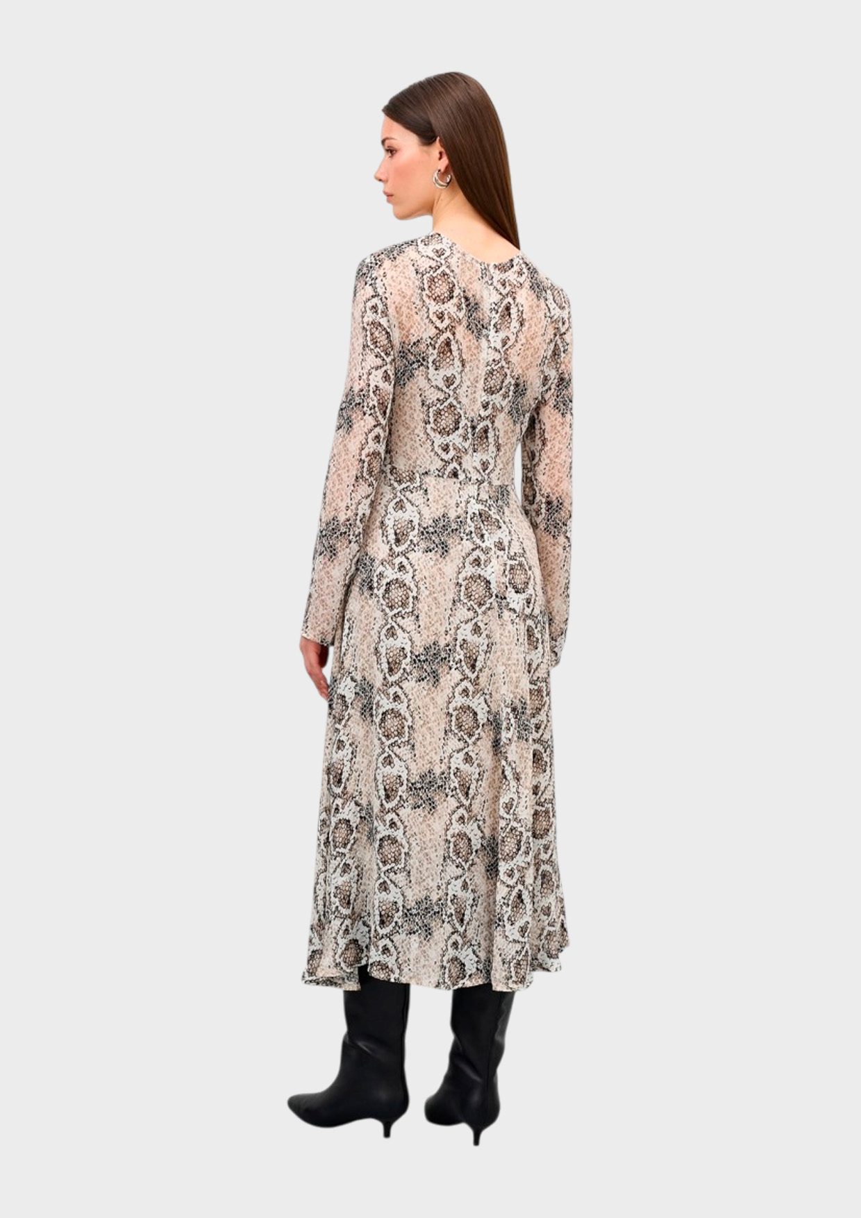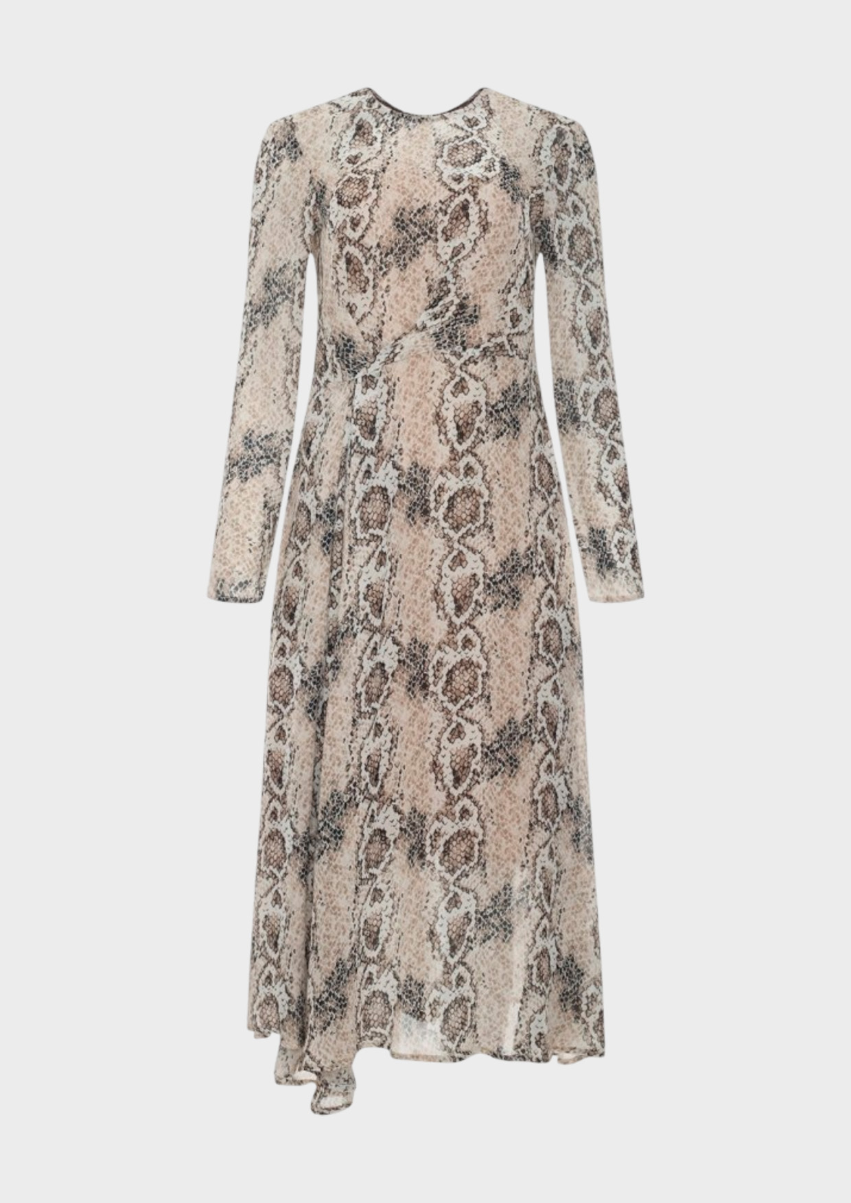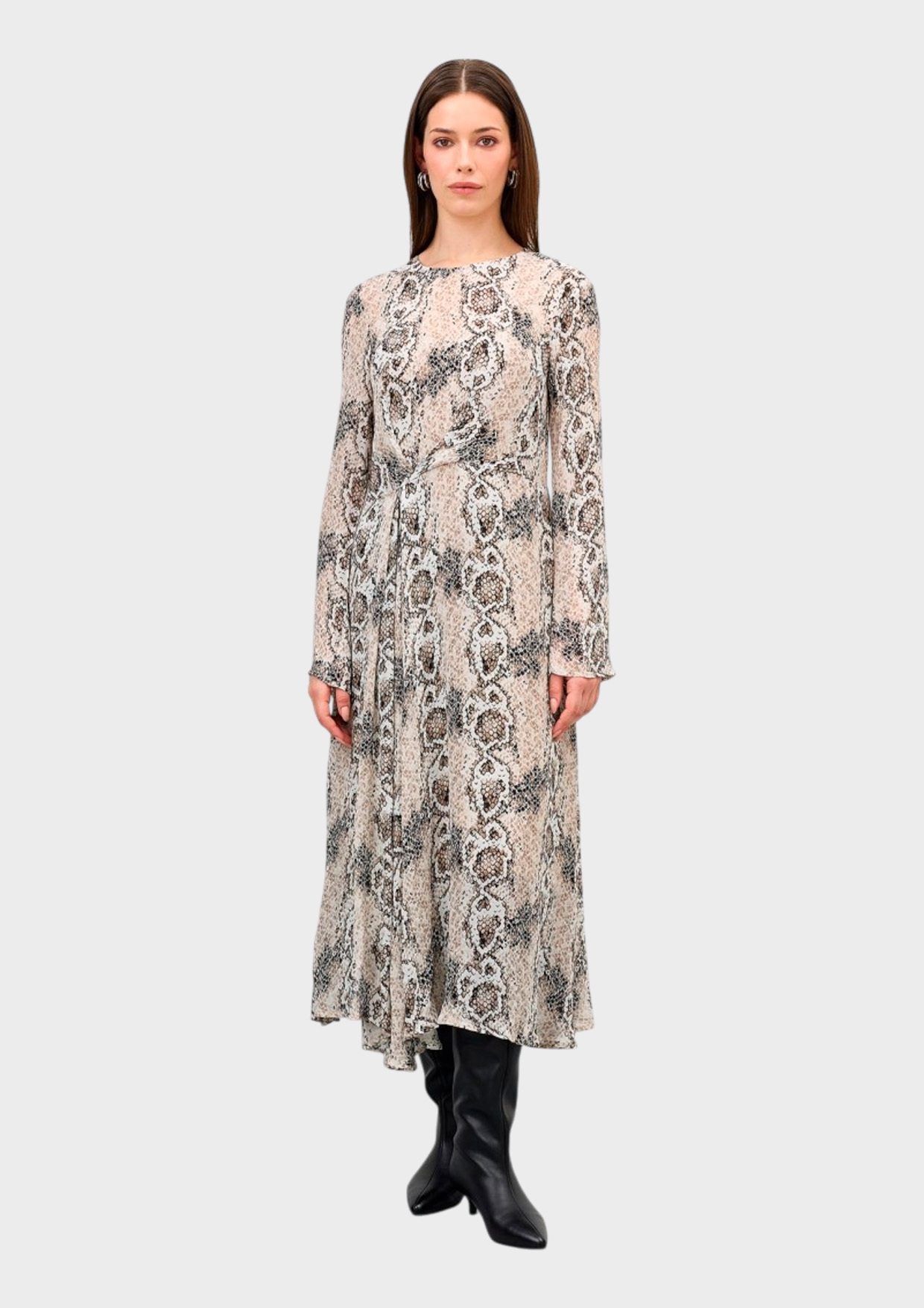 Платье-макси из 100% вискозы с анималистичным принтом. Полуприталенный силуэт. Круглый вырез. Длинные рукава. Асимметричные складки спереди. Застежка на потайную молнию. Платье на подкладке.