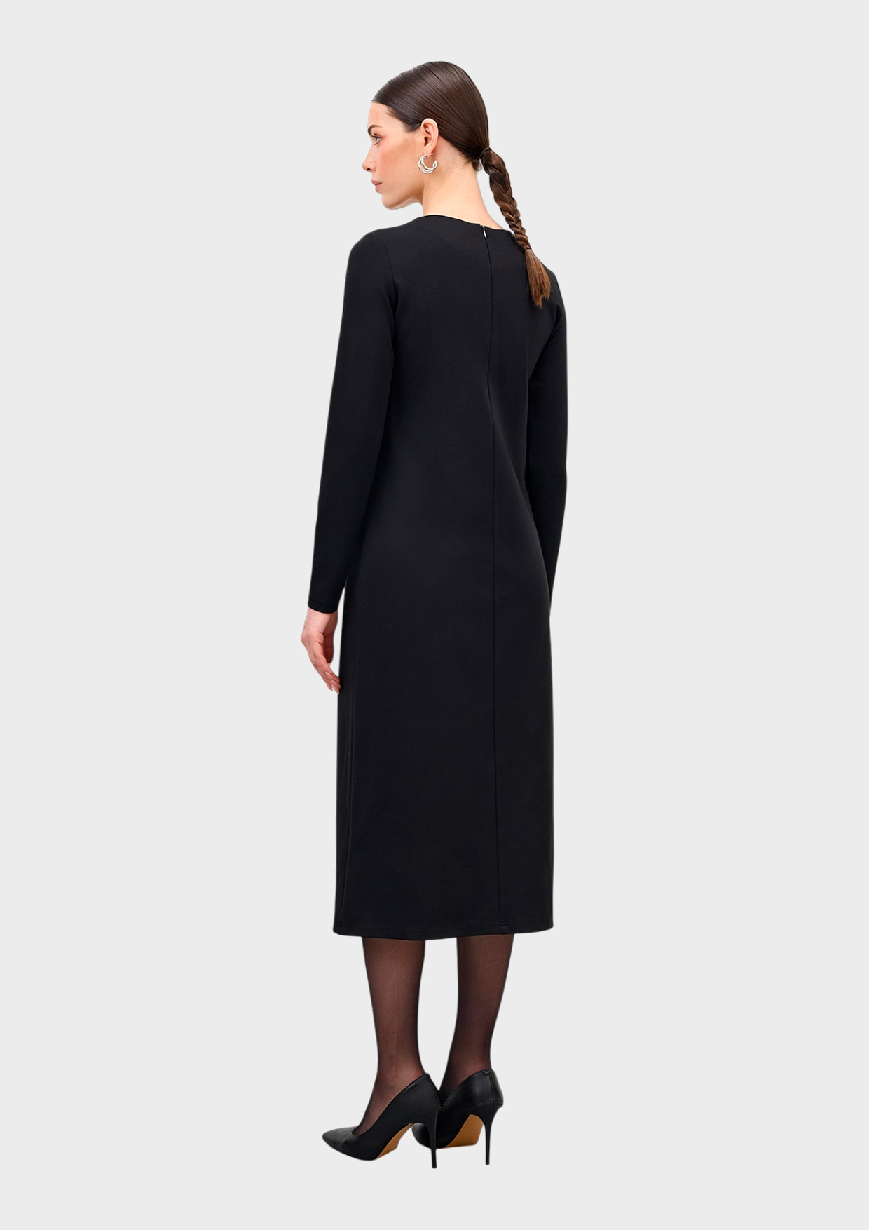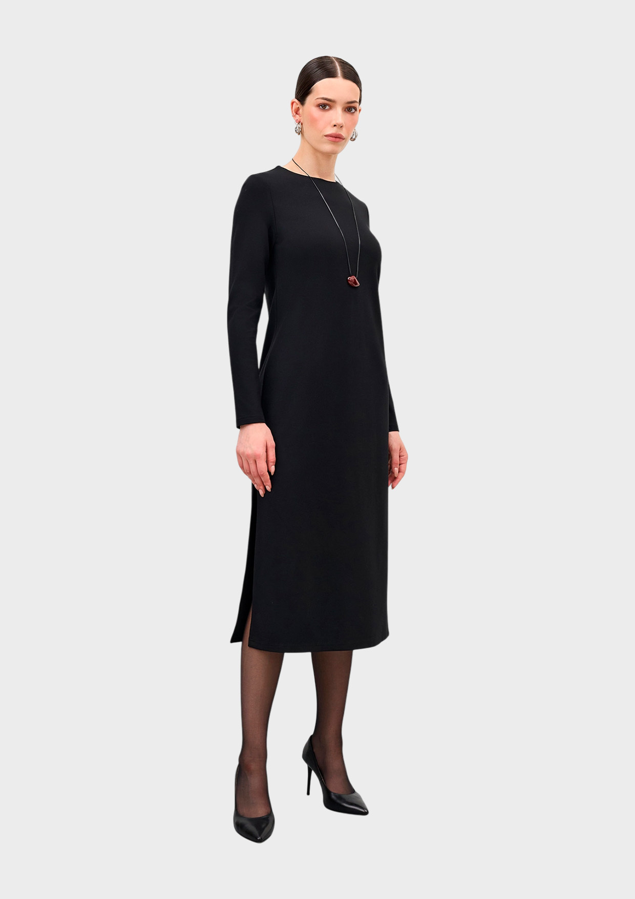 Элегантное платье-миди с боковыми разрезом в шве. Прилегающий силуэт. Круглый вырез. Застежка на потайную молнию. В составе вискоза.