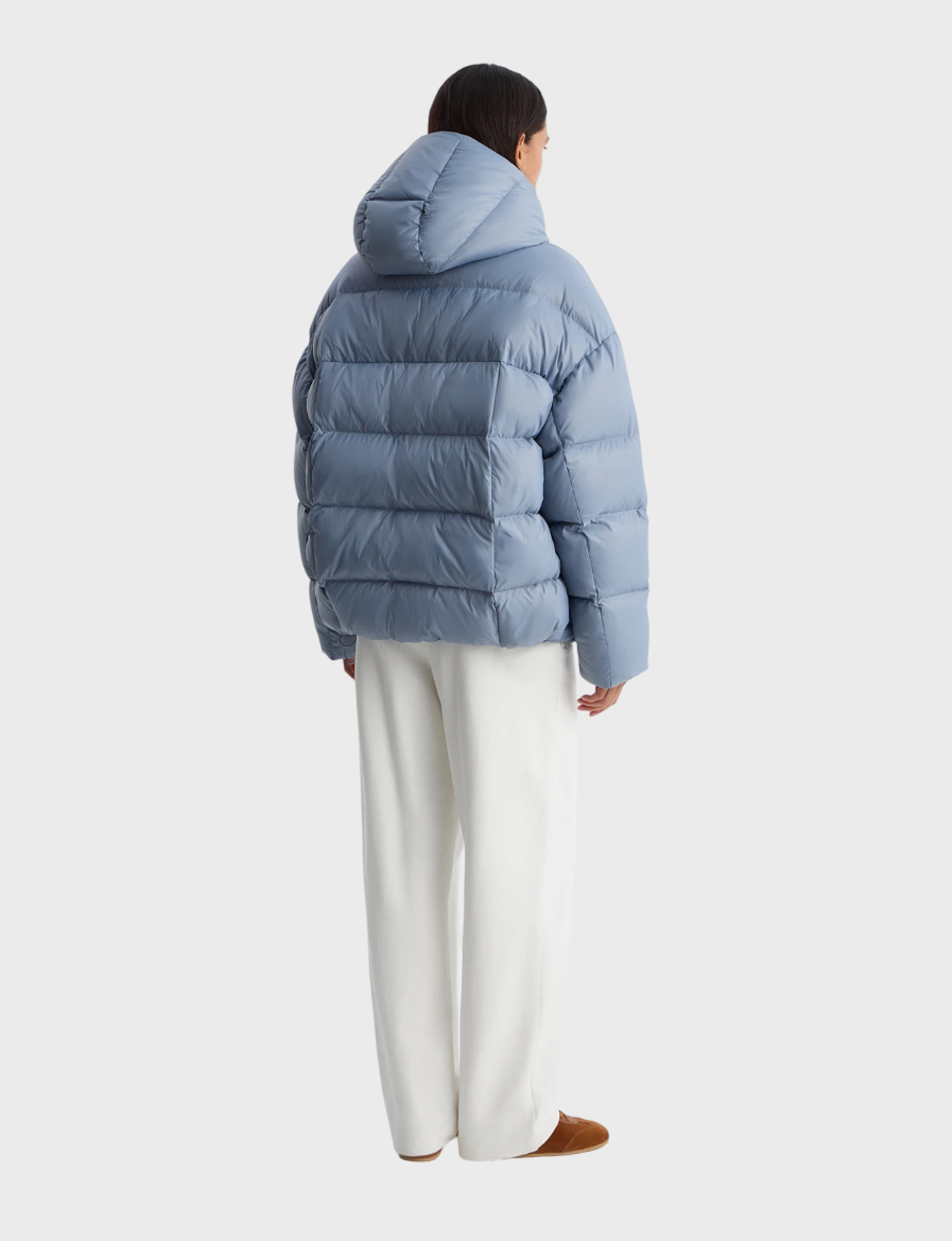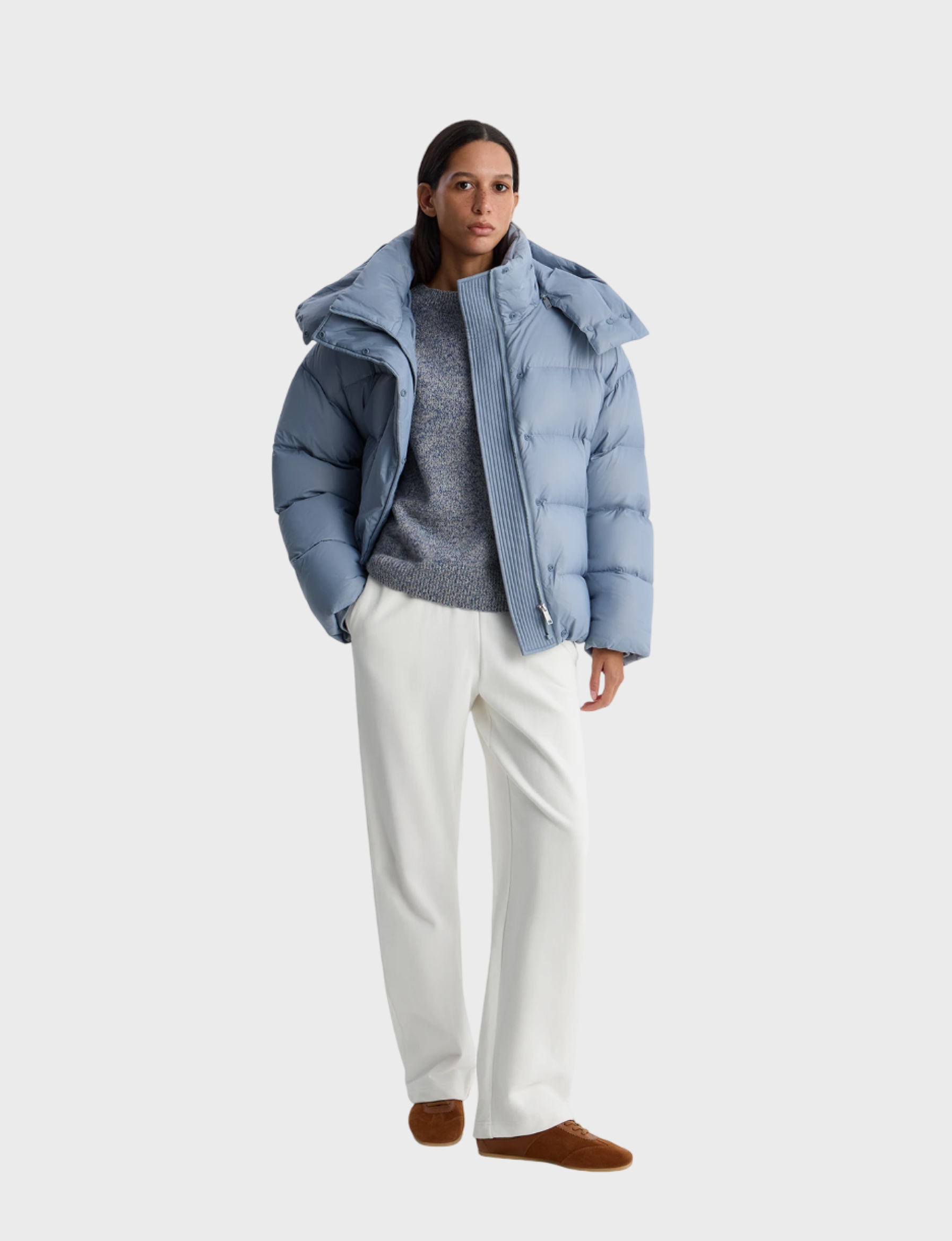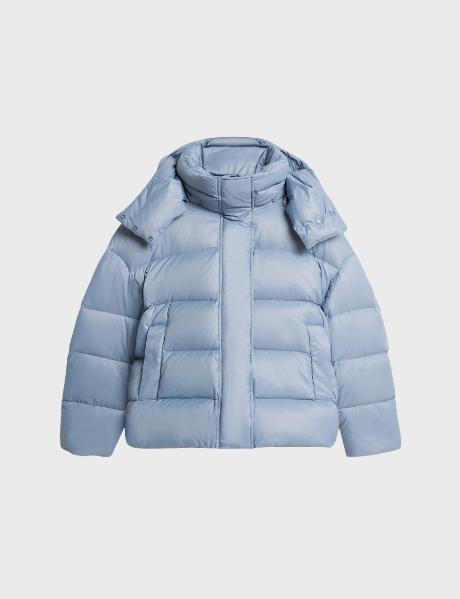 Объемный пуховик с высоким воротником-стойкой, однотонным капюшоном, который при необходимости можно отстегнуть, и округлым спущенным плечом. Укороченная модель отлично защищает от холода благодаря трикотажным манжетам по низу рукавов, ветрозащитной планке на потайных кнопках и карманам с утепленной подкладкой из мягкого флиса. Детали: брендированные патч, подкладка и фурнитура.