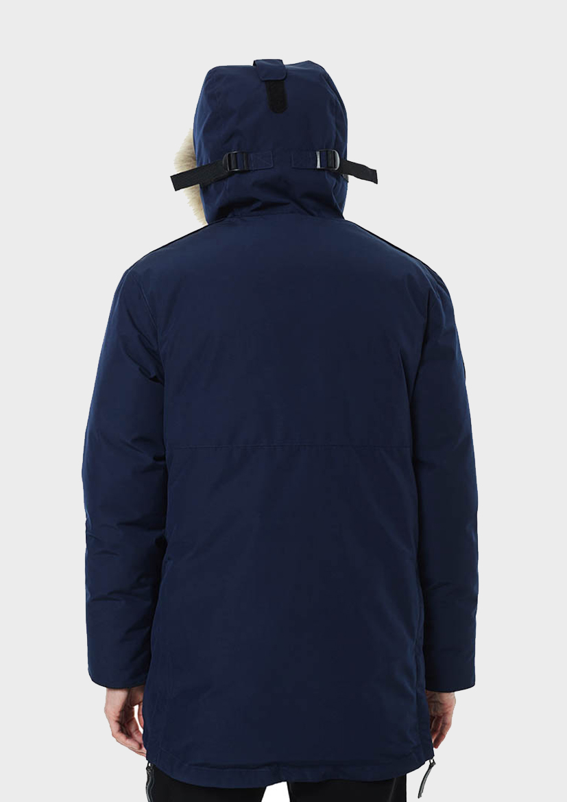 Базовая мужская пуховая парка Полюс выполнена из мембранной ткани  6000/6000 с обработкой WR.  Утепленные внешние карманы; внутренние теплые манжеты; капюшон с опушкой из натурального меха (отстегивается); утяжки на капюшоне и талии; дополнительные молнии по бокам изделия для доступа во внутренние карманы брюк и удобства при вождении автомобиля