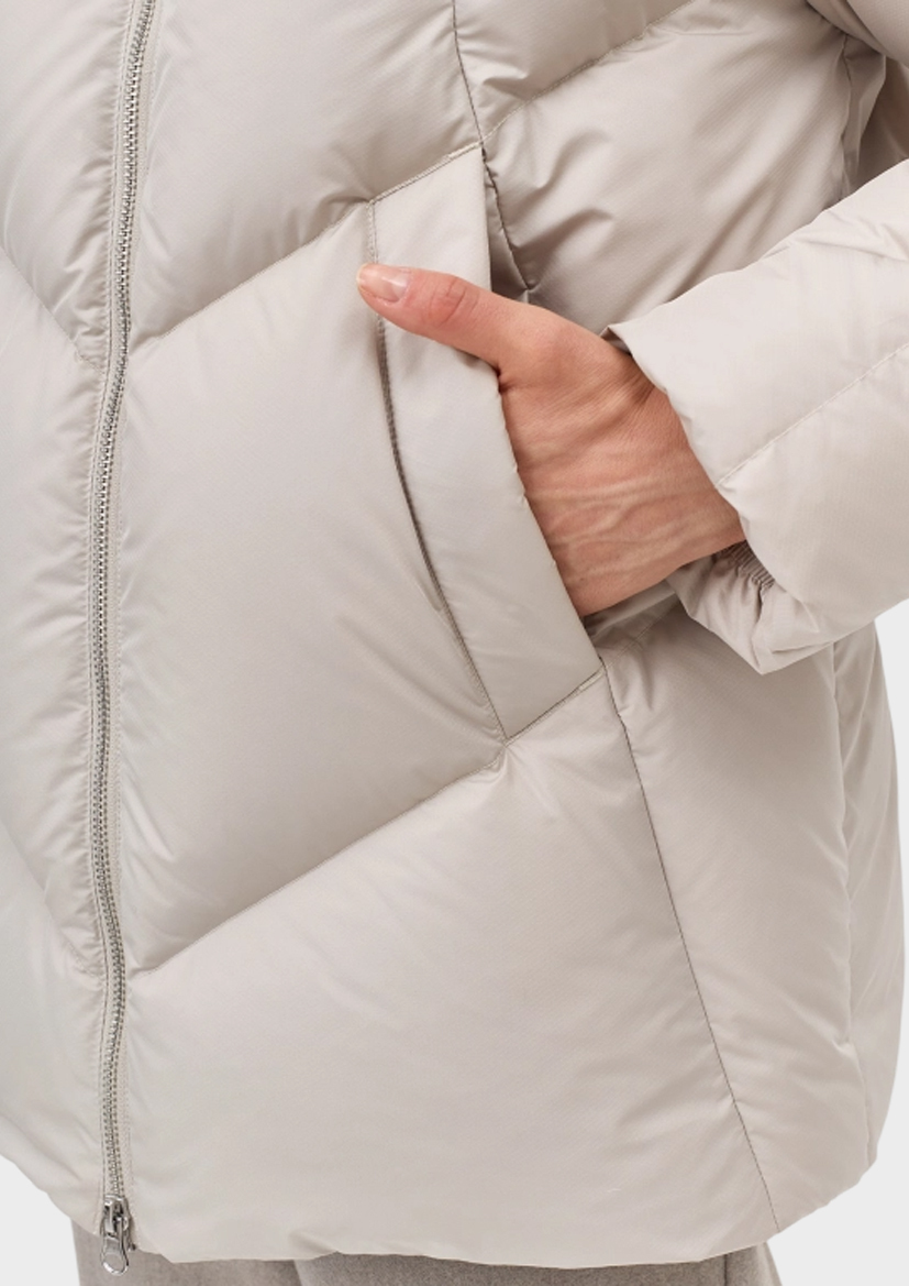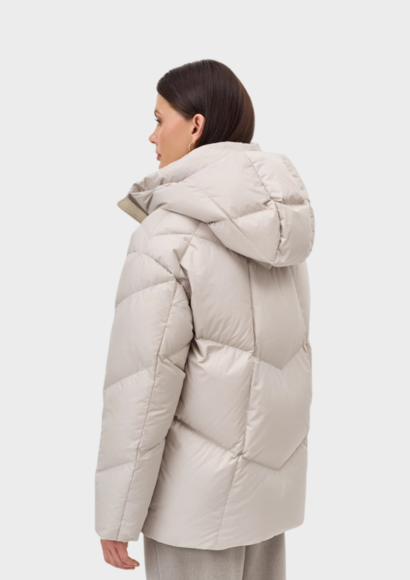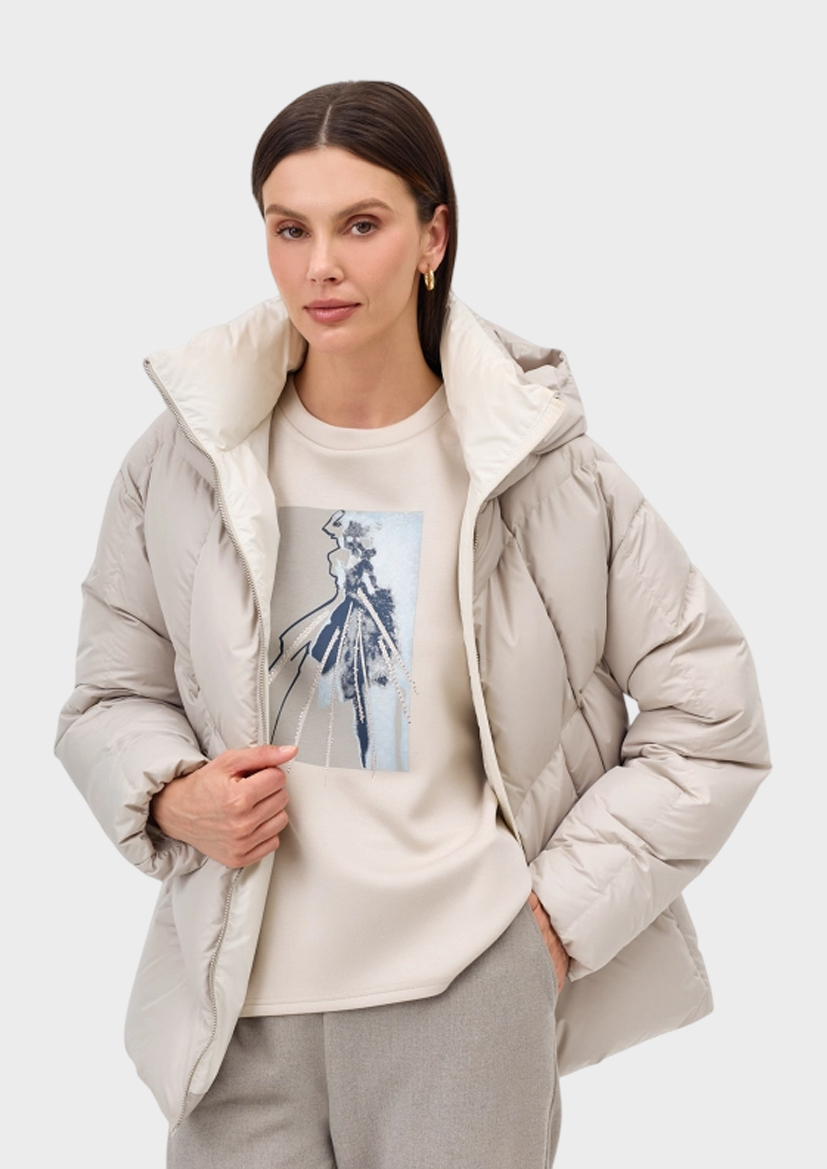 Объемная куртка на натуральном утеплителе с радиальной стежкой. Свободный силуэт. Спущенная линия плеч. Высокий воротник стойка дополнен капюшоном с контрастной подкладкой. Застежка на молнию. Боковые карманы с листочками. Кулиса по низу изделия для защиты от ветра. В качестве утеплителя натуральный пух.