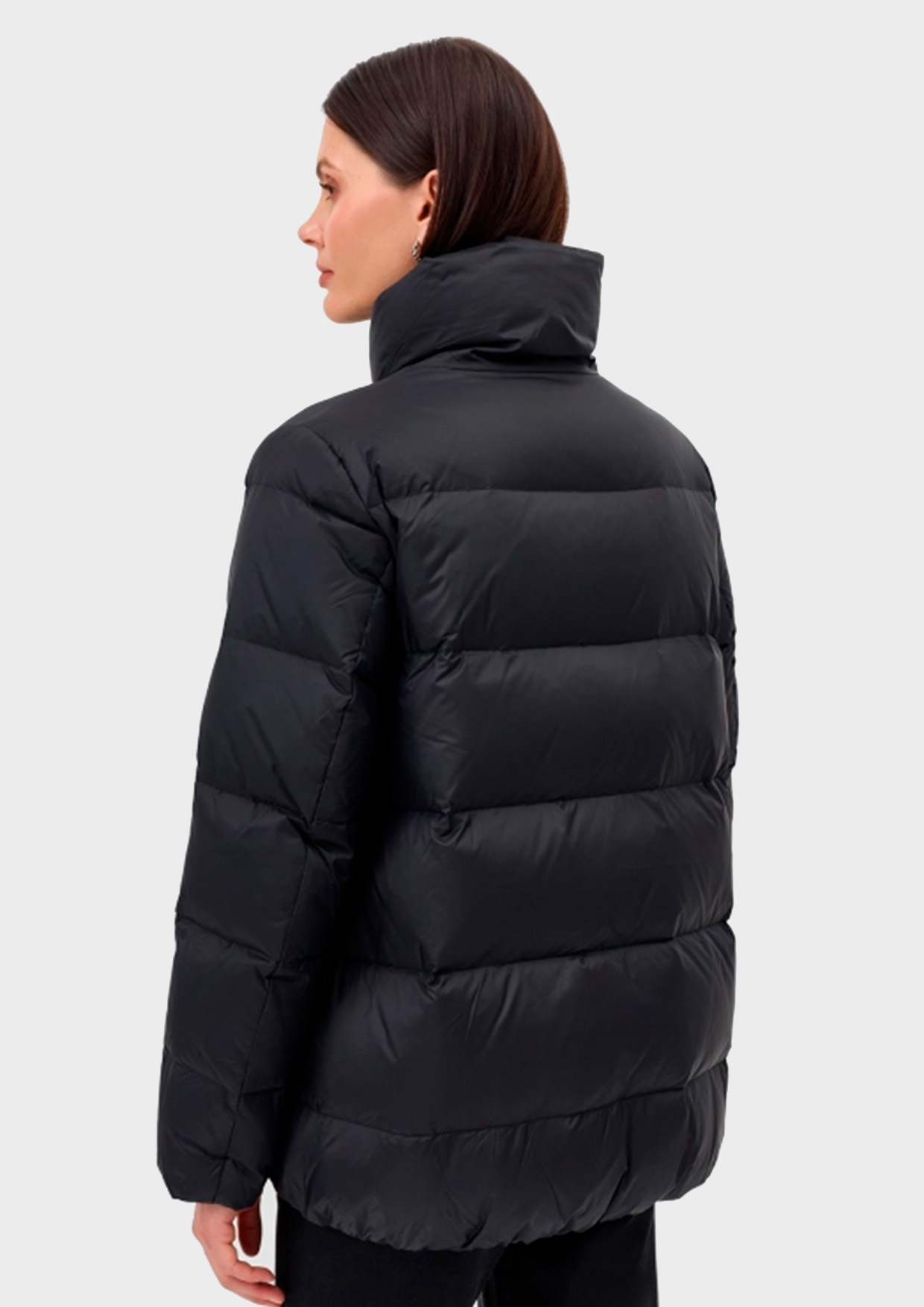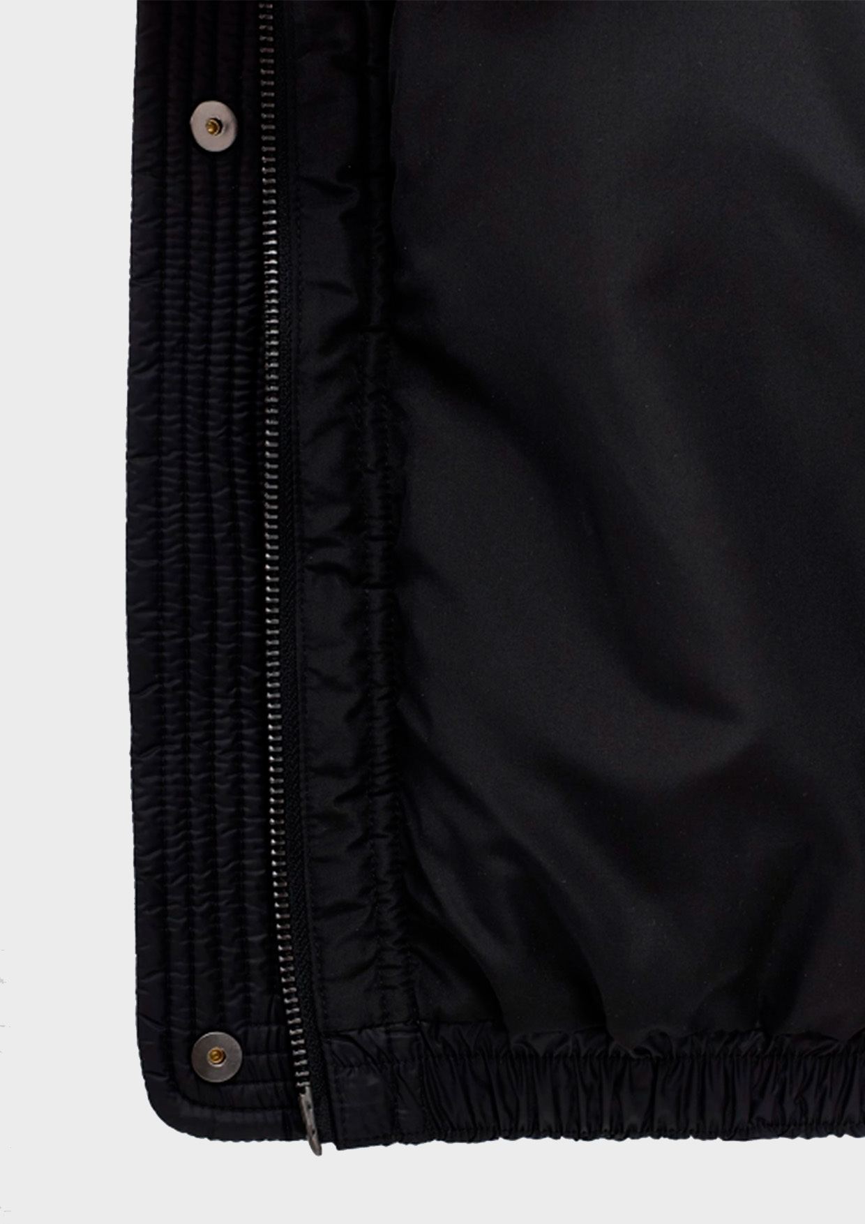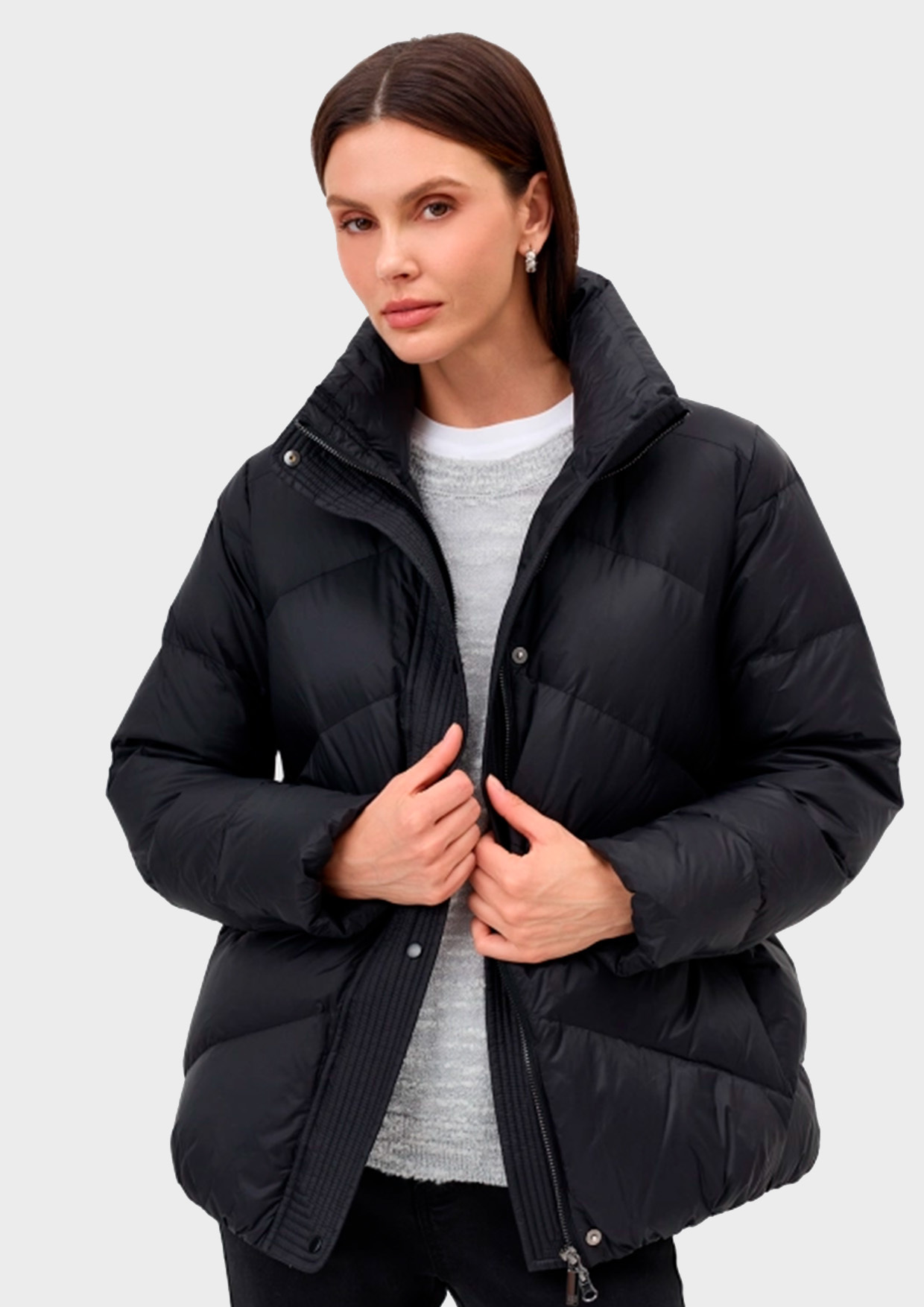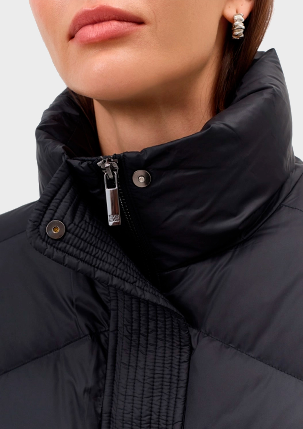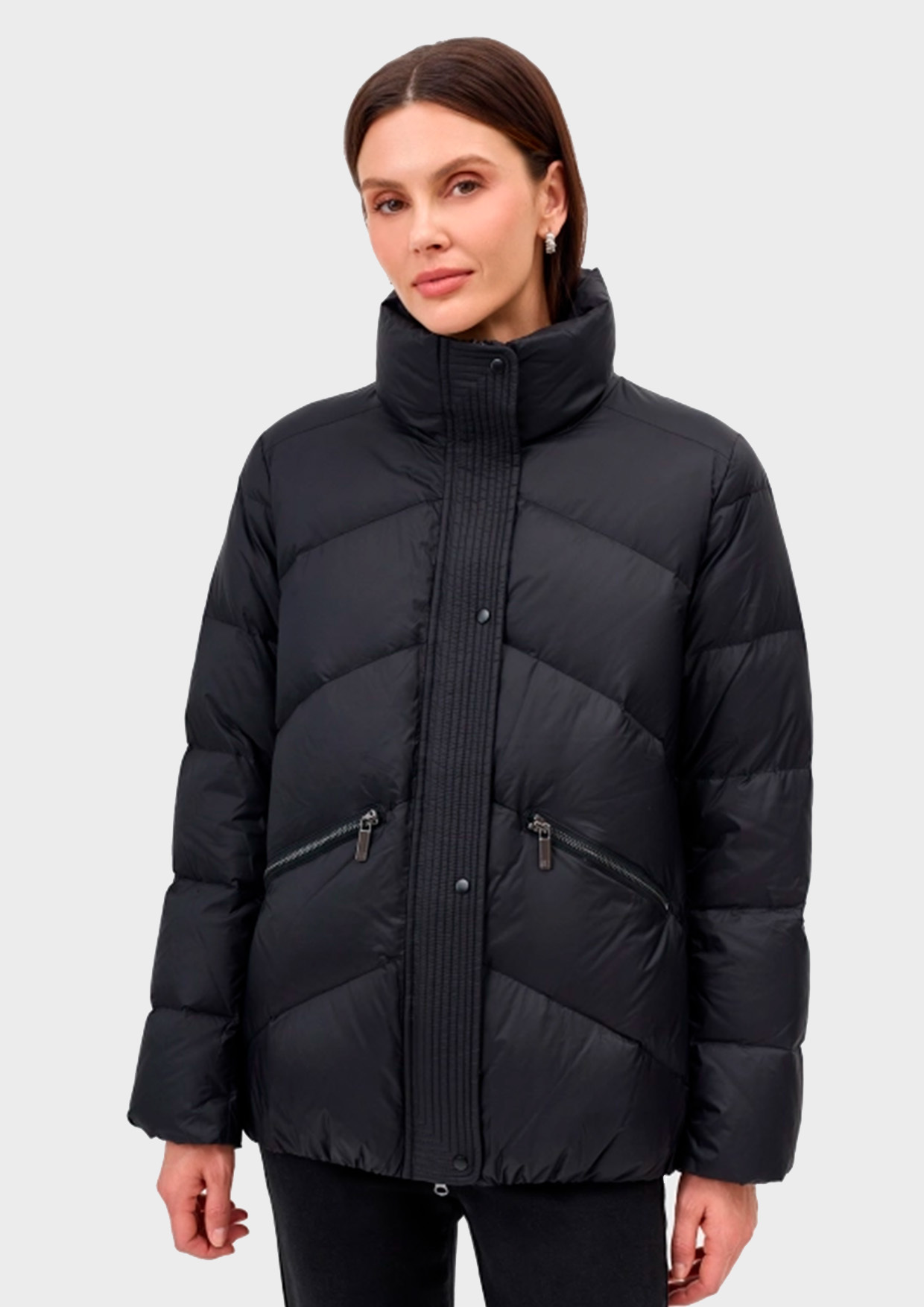 Стеганная куртка из нейлона с натуральным утеплителем. Сочетание диагональной и горизонтальной стежки. Прямой силуэт. Воротник стойка. Застежка на молнию и стеганную планку на кнопках. Боковые карманы на молнии. Кулиса по низу изделия для защиты от ветра. В качестве утеплителя натуральный пух.