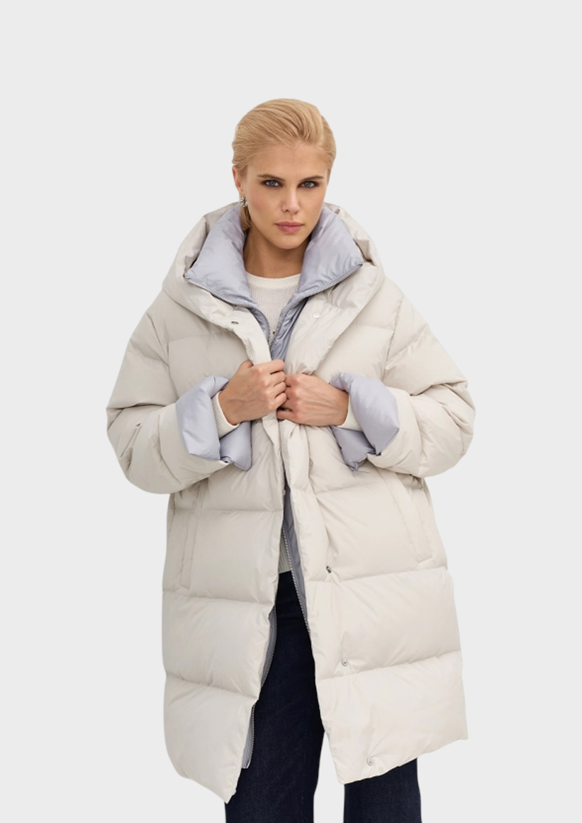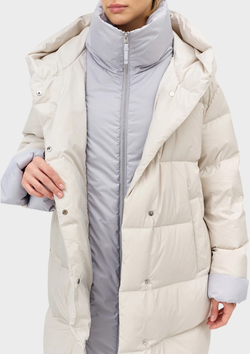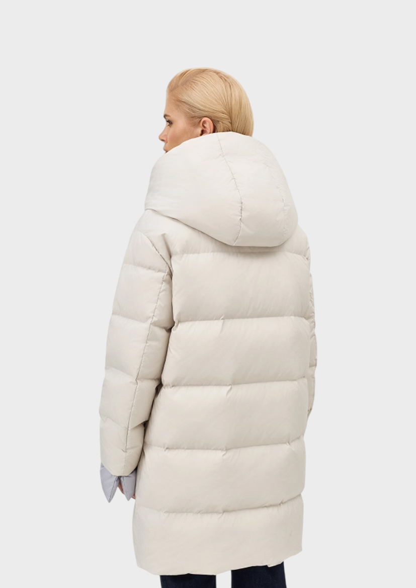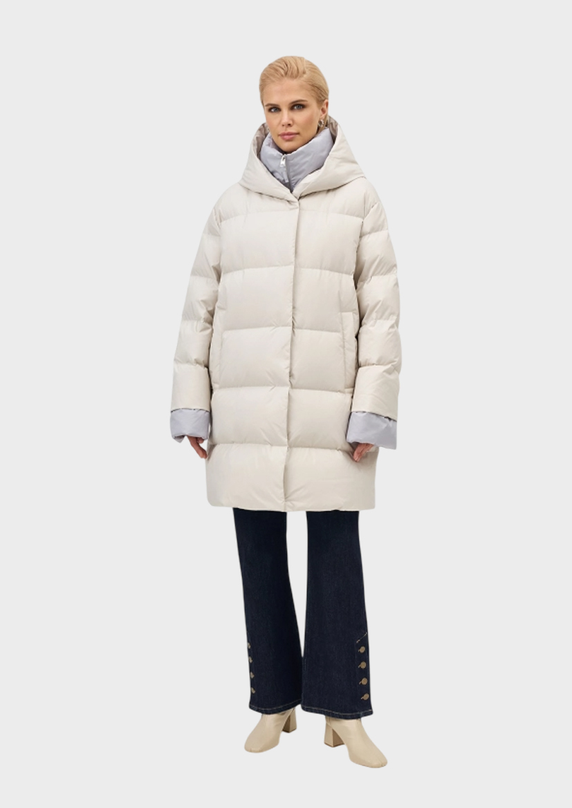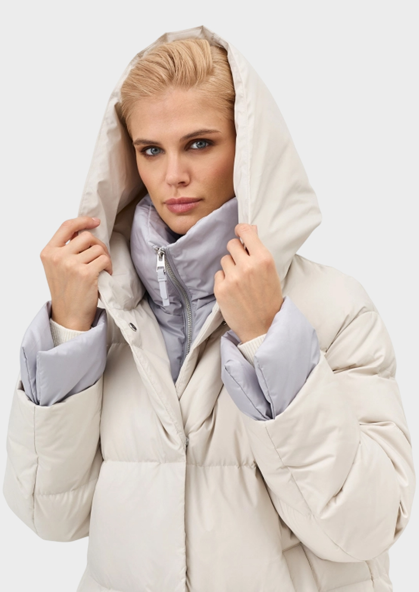 Укороченный пуховик с контрастной манишкой и отделкой по низу рукавов. Свободный силуэт. Спущенная линия плеч. Боковые карманы с листочками на магнитных кнопках. Воротник стойка дополнен капюшоном. Застежка на кнопки. Внутренняя контрастная манишка с воротником стойкой на молнии. Контрастные манжеты по низу рукавов. В составе натуральный утеплитель.
