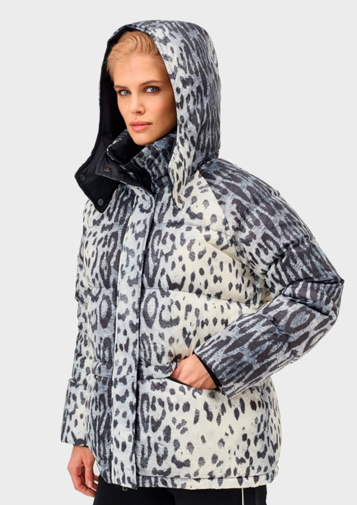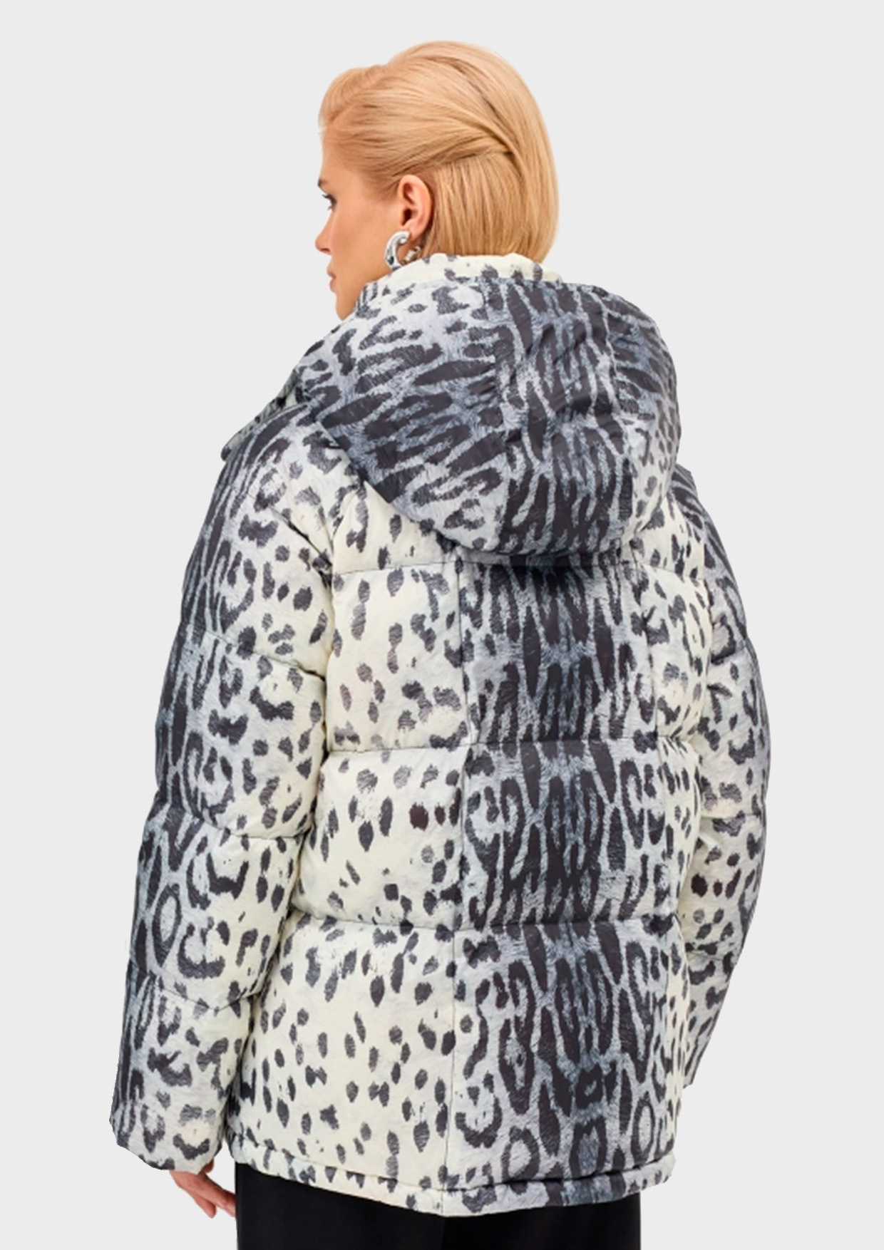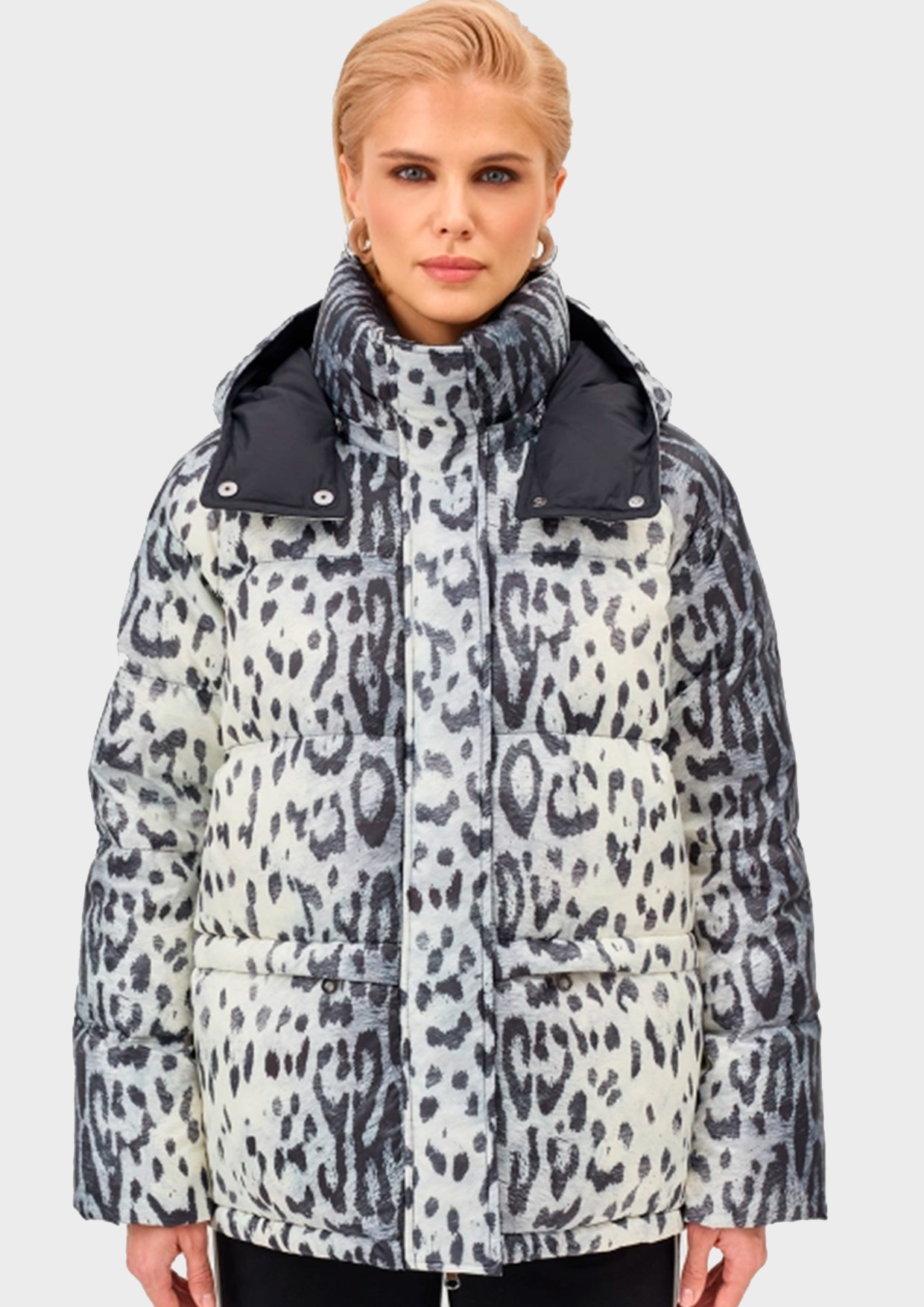 Теплая куртка-пуховик с монохромным анималистичным принтом. Свободный силуэт. Воротник стойка дополнен съемным капюшоном на кнопках с контрастной подкладкой. Застежка на молнию и планку с потайными кнопками. Боковые карманы на молниях. Рукава реглан с трикотажными манжетами по низу. Кулиса по низу для защиты от ветра. В качестве утеплителя натуральный пух.