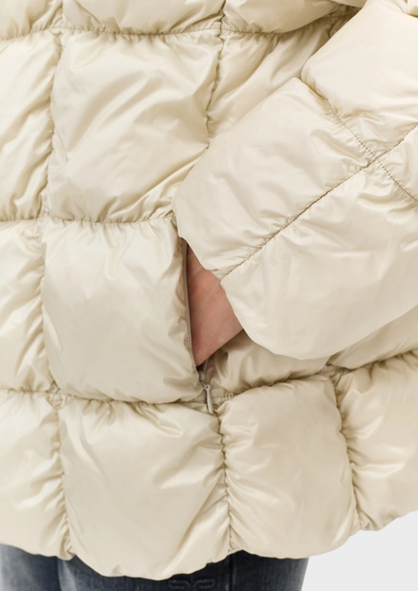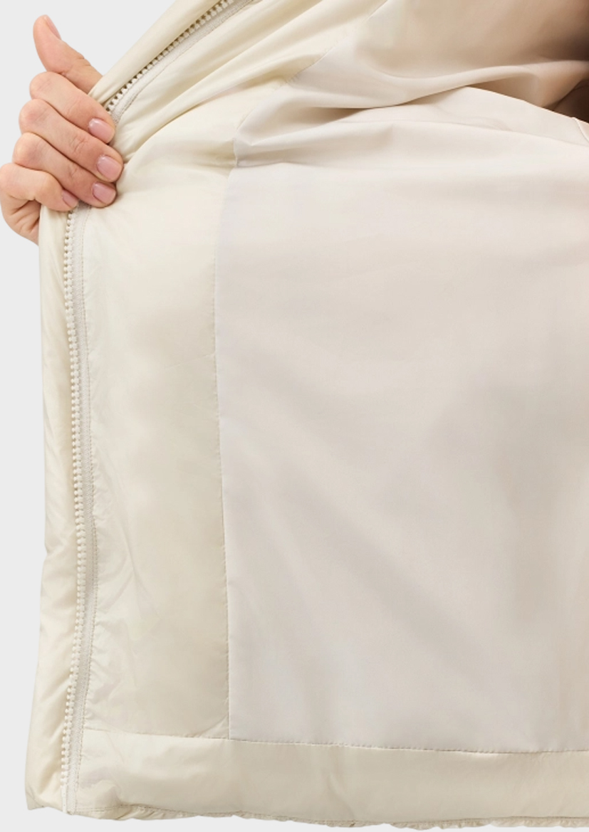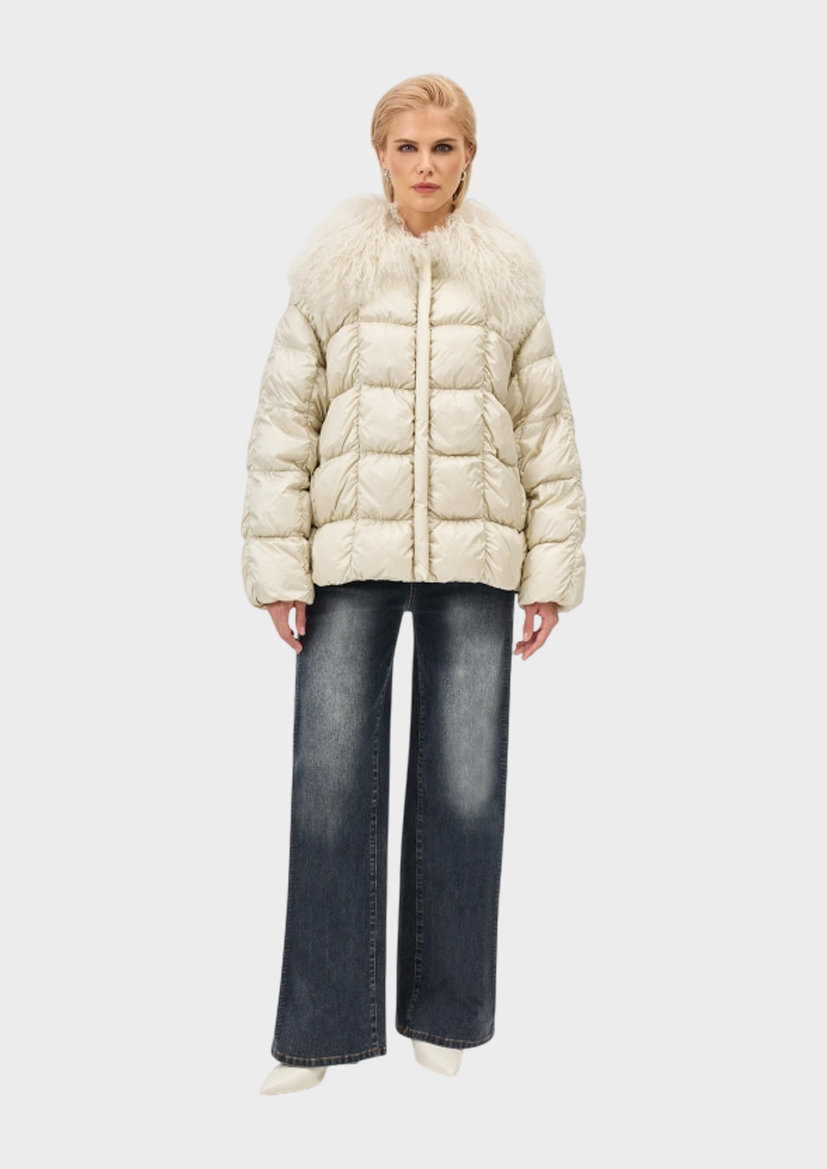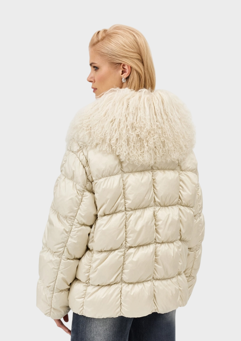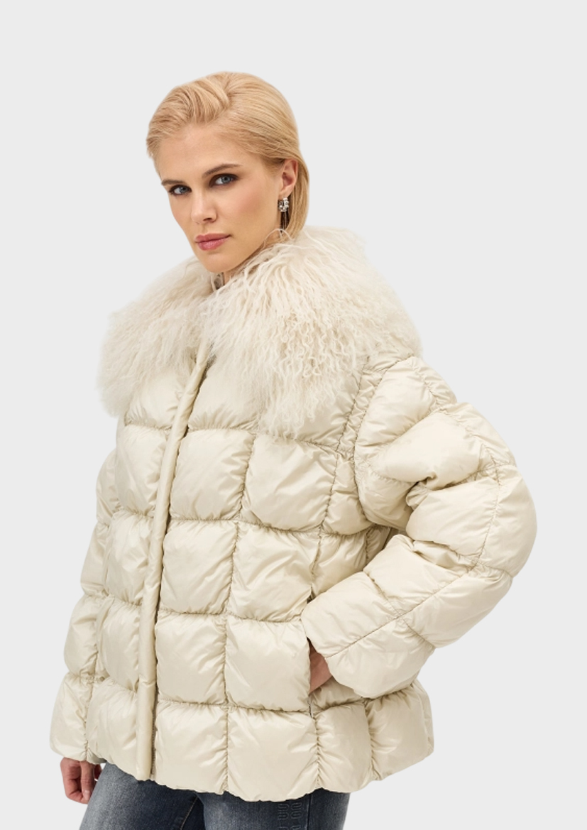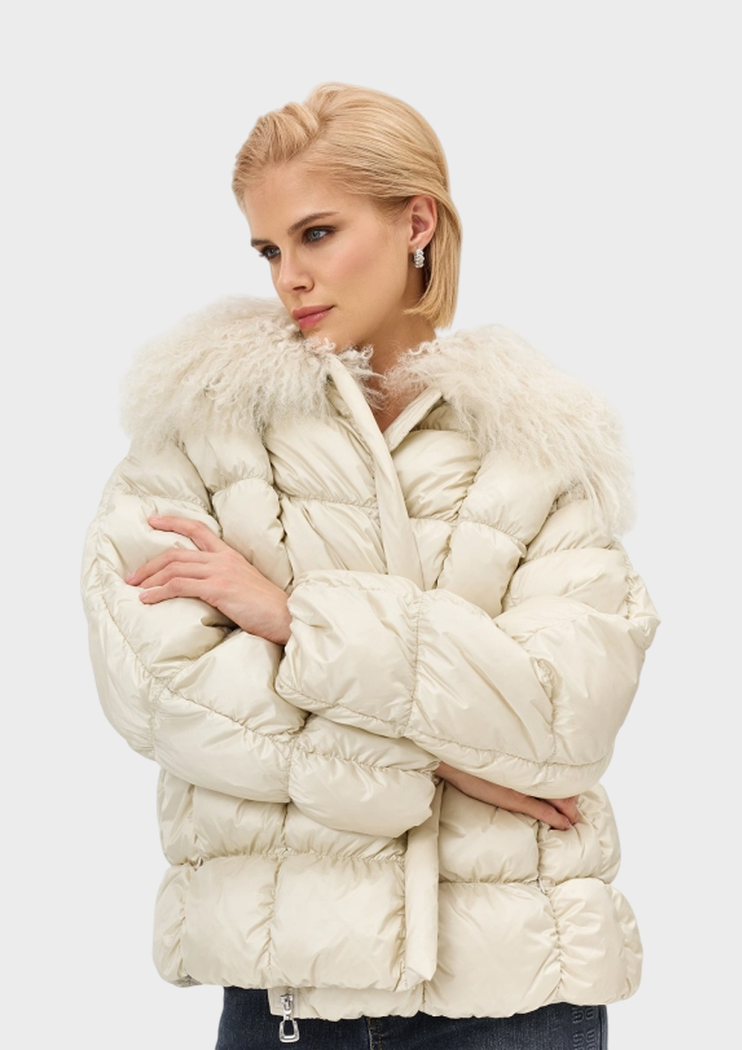Стеганая куртка со съемным отложным воротником из овчины. Свободный силуэт. Спущенная линия плеч. Ткань верха из 100% нейлона. Боковые карманы на потайной молнии. Утяжники по низу изделия для защиты от ветра. Застежка на молнию. В качестве утеплителя натуральный пух.