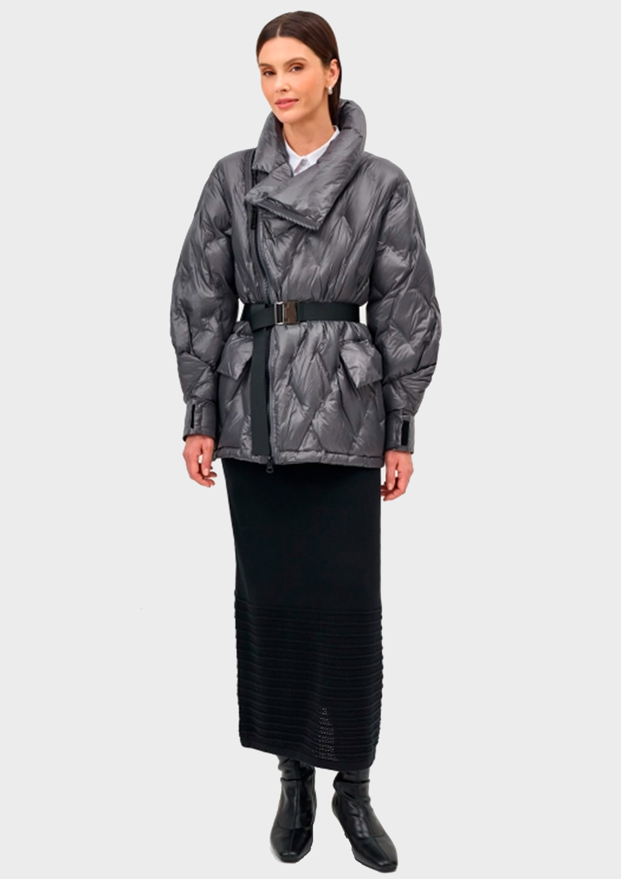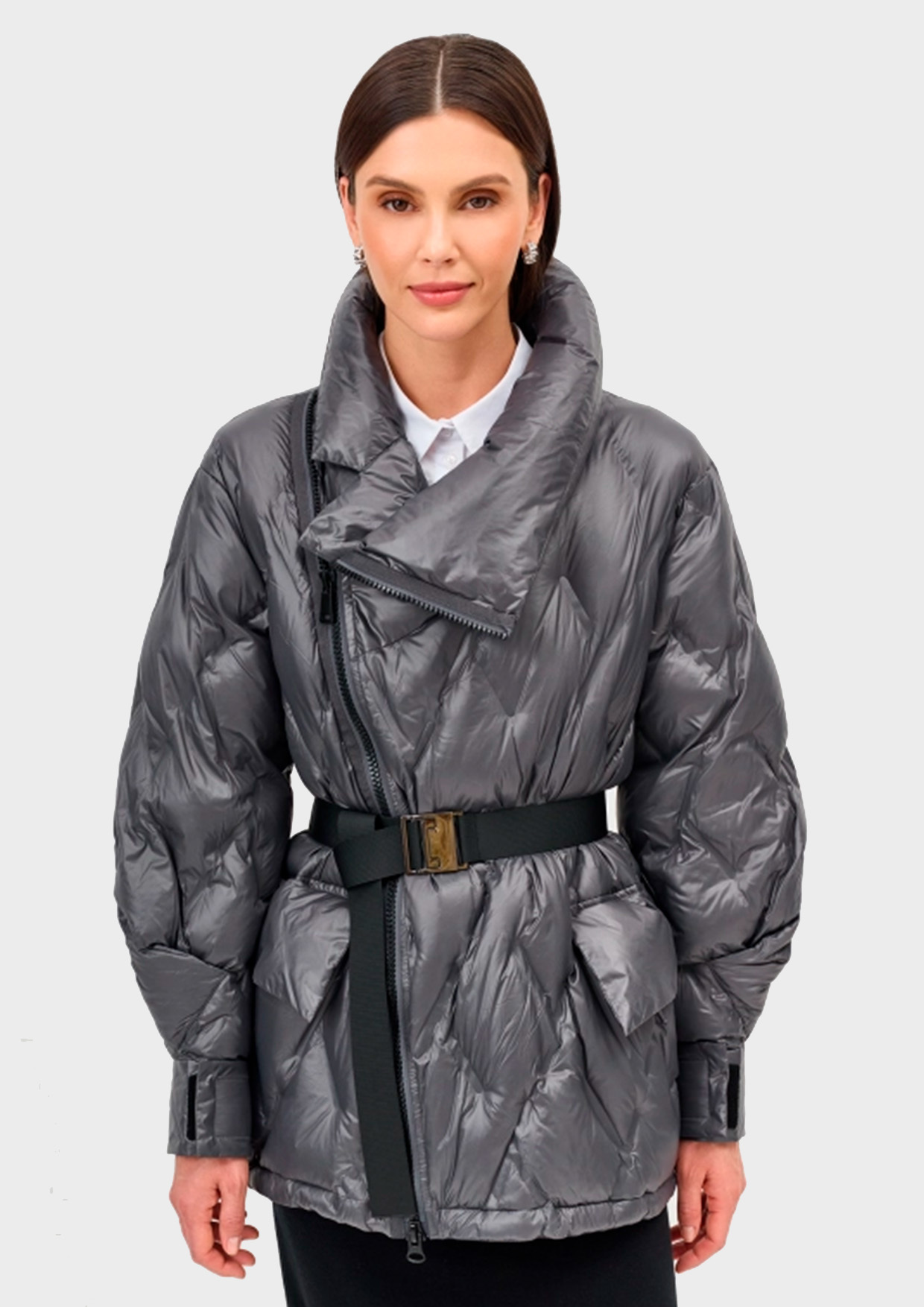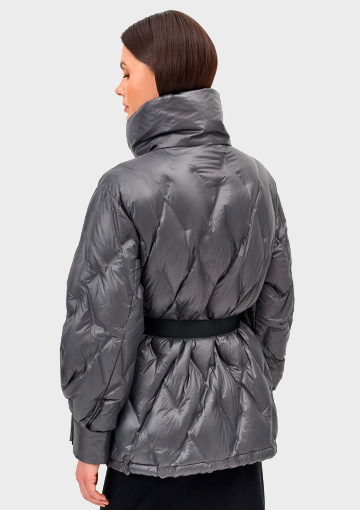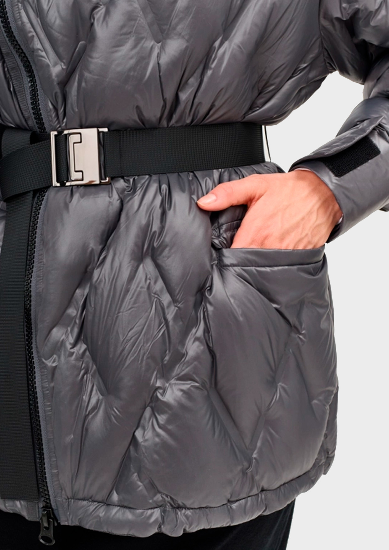 Куртка из глянцевого нейлона с ромбовидной термо стежкой. Свободный силуэт можно приталить съемным поясом. Воротник стойка меняется на асимметричный отложной воротник. Застежка на молнию. Накладные боковые карманы с акцентными клапанами. Манжеты на липучках по низу рукавов. Кулиса по низу для защиты от ветра. Подкладка из 100% нейлона. В качестве утеплителя натуральный пух.