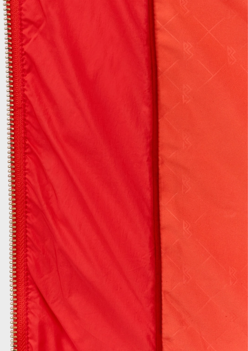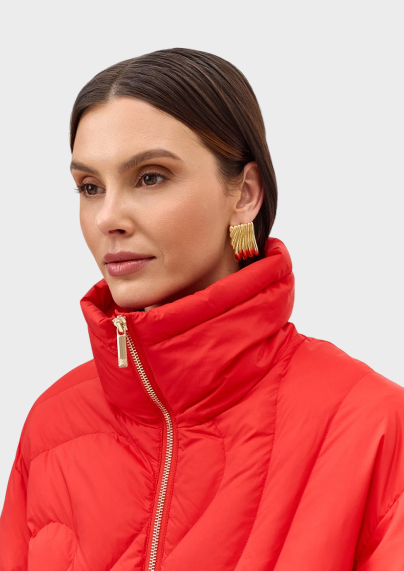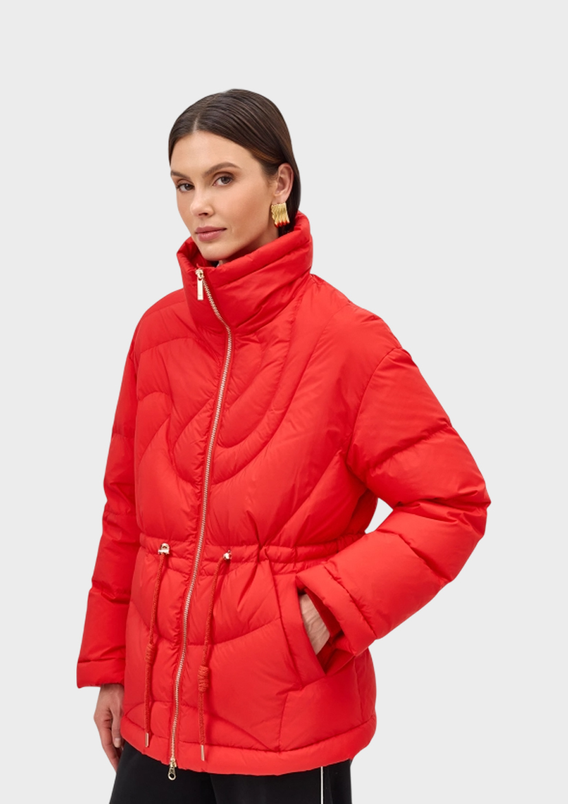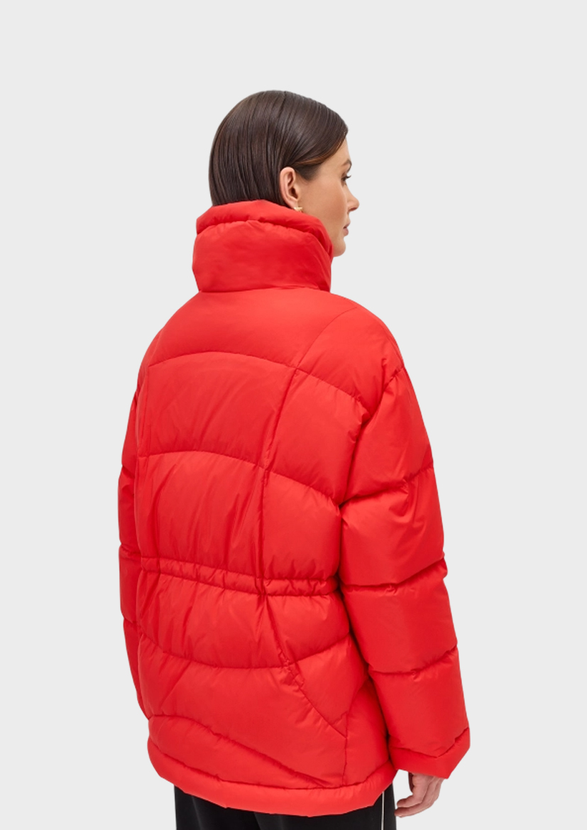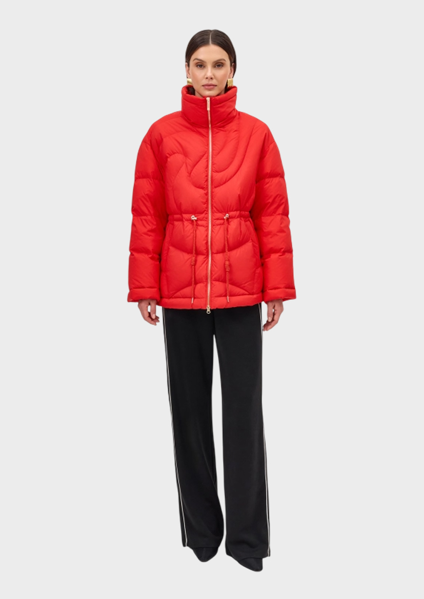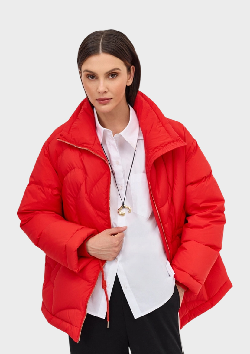 Яркая пуховая куртка из легкого нейлона с фантазийной стежкой. Свободный силуэт можно приталить с помощью кулисы по линии талии. Спущенная линия плеч. Застежка на молнию. Воротник стойка меняется на отложной. Кулиса по низу изделия для защиты от ветра. Боковые карманы с листочками. Золотистая металлическая фурнитура. В качестве утеплителя натуральный пух.