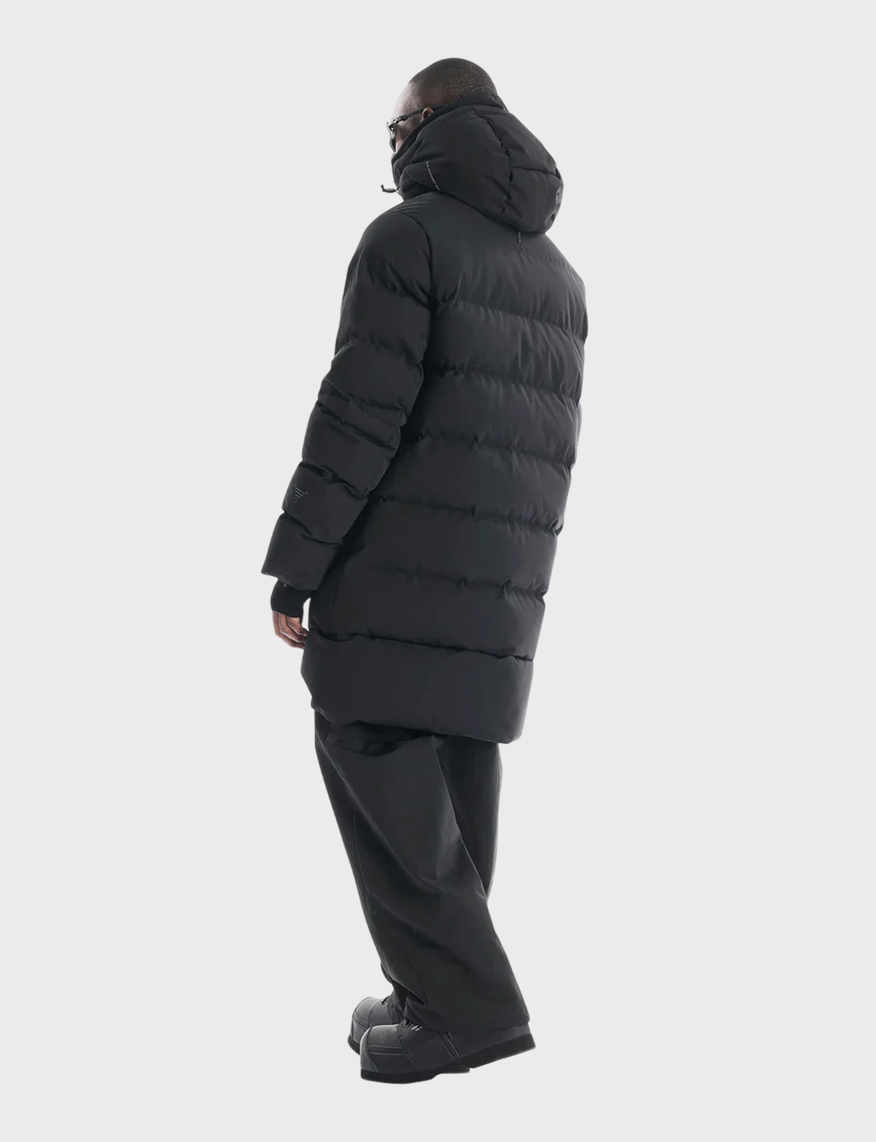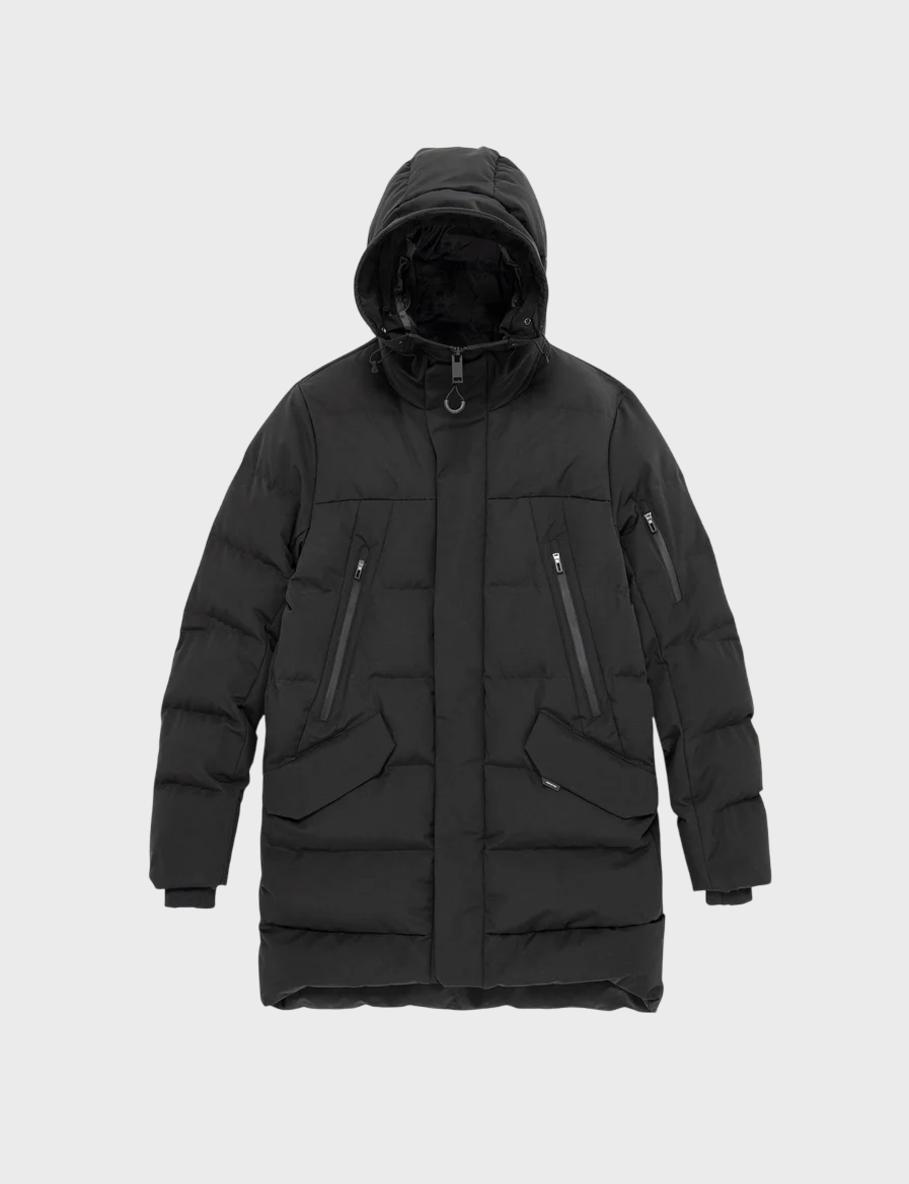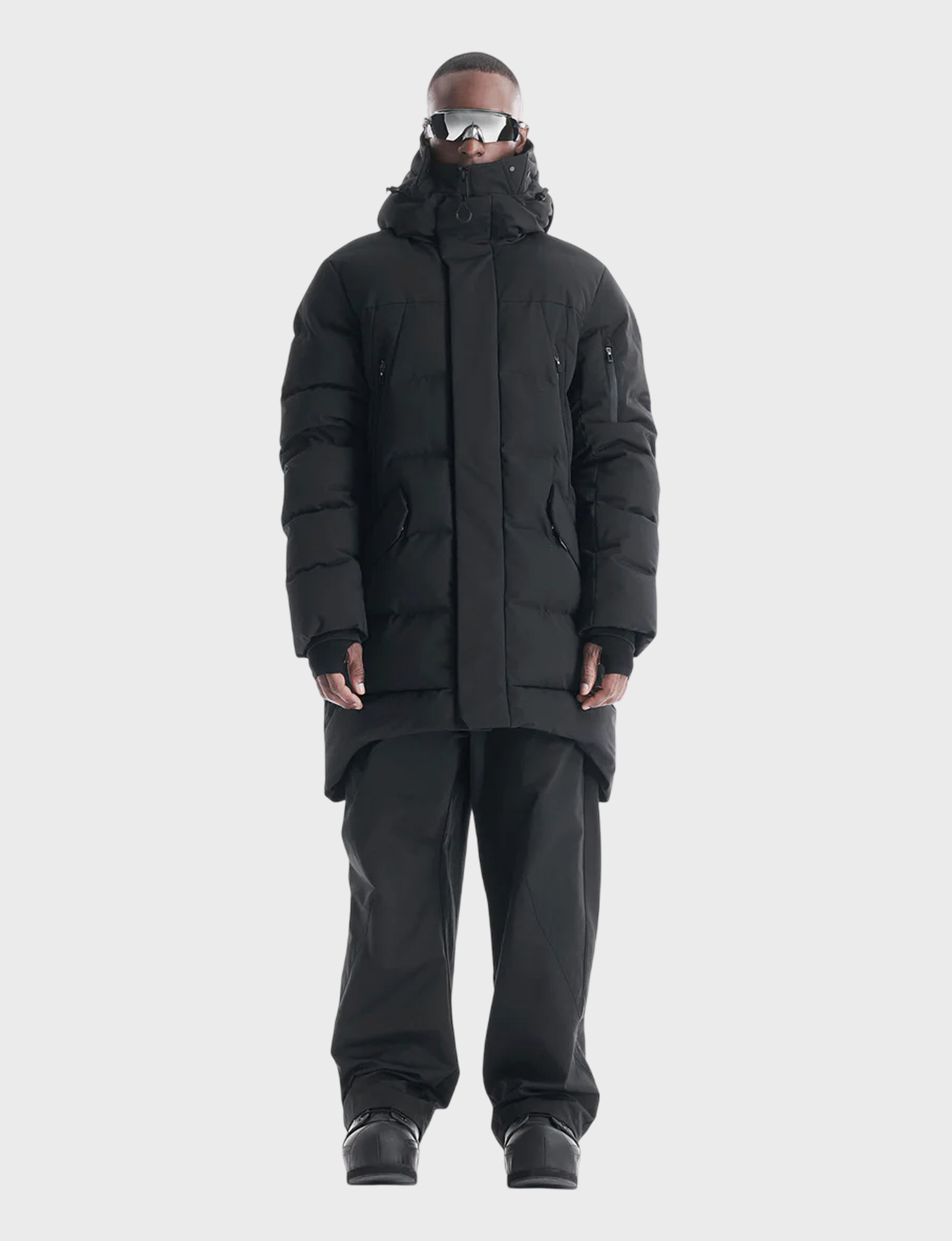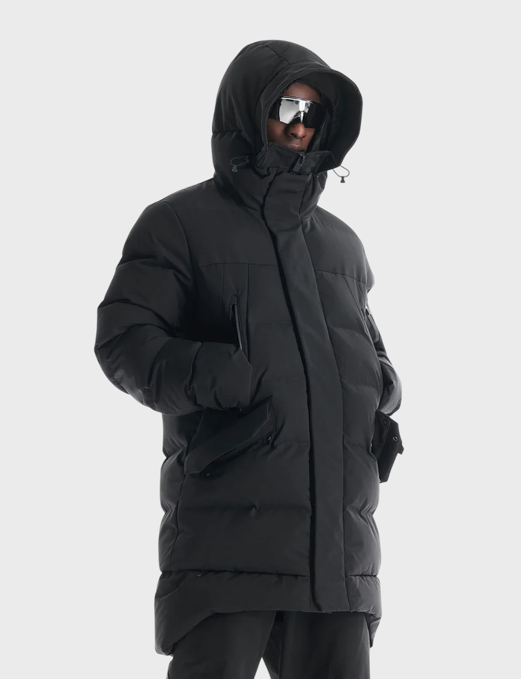 Удлинённый пуховик STROFO из функциональной водостойкой ткани. Утеплитель сочетает натуральный пух и синтетическое волокно — лёгкий, тёплый, устойчивый к влаге и сохраняет форму. Капюшон с дополнительной защитой лба, карманы с двойными клапанами, смарт-карман на рукаве и встроенные стропы для ношения за плечами — каждый элемент рассчитан на надёжность, посадку и удобство в движении.