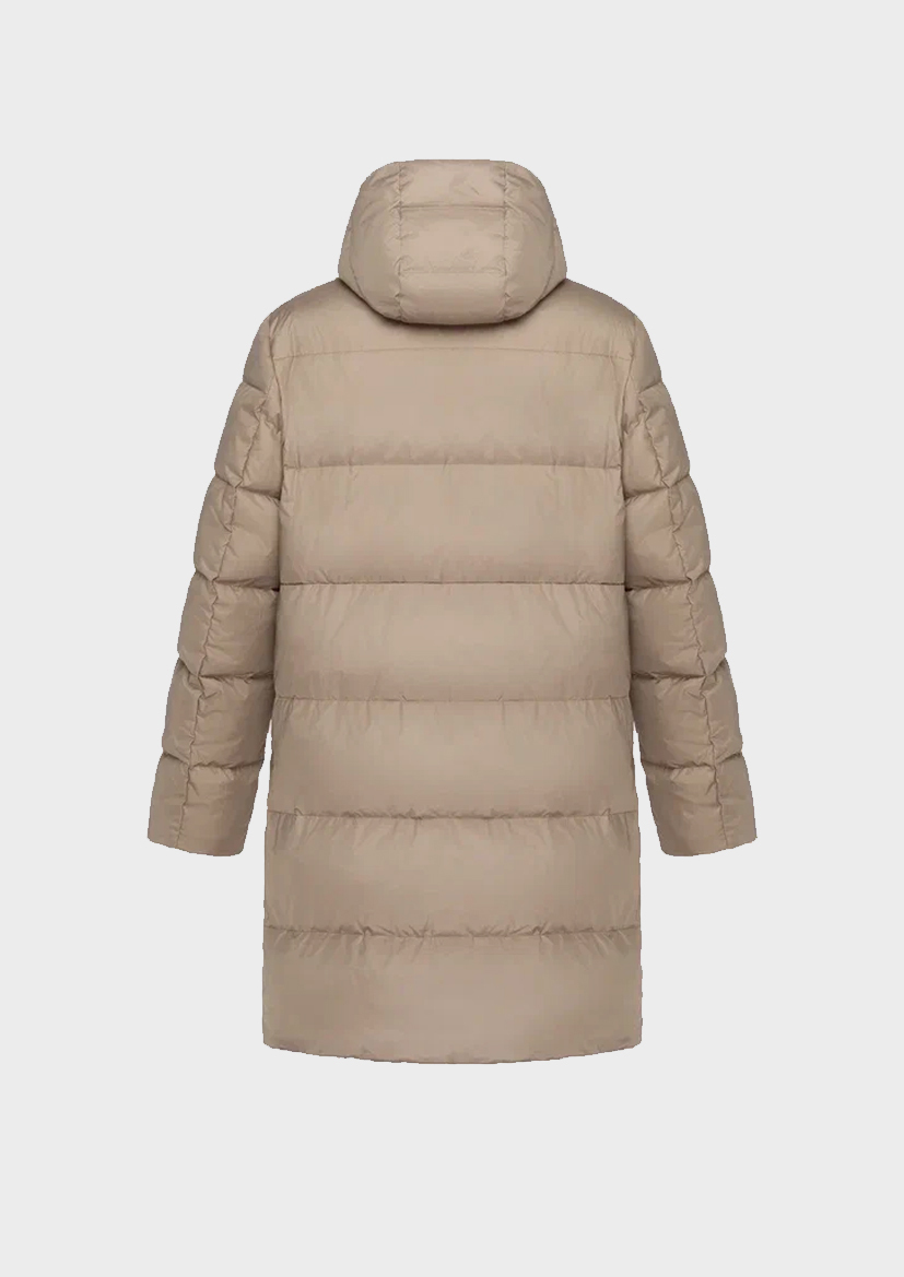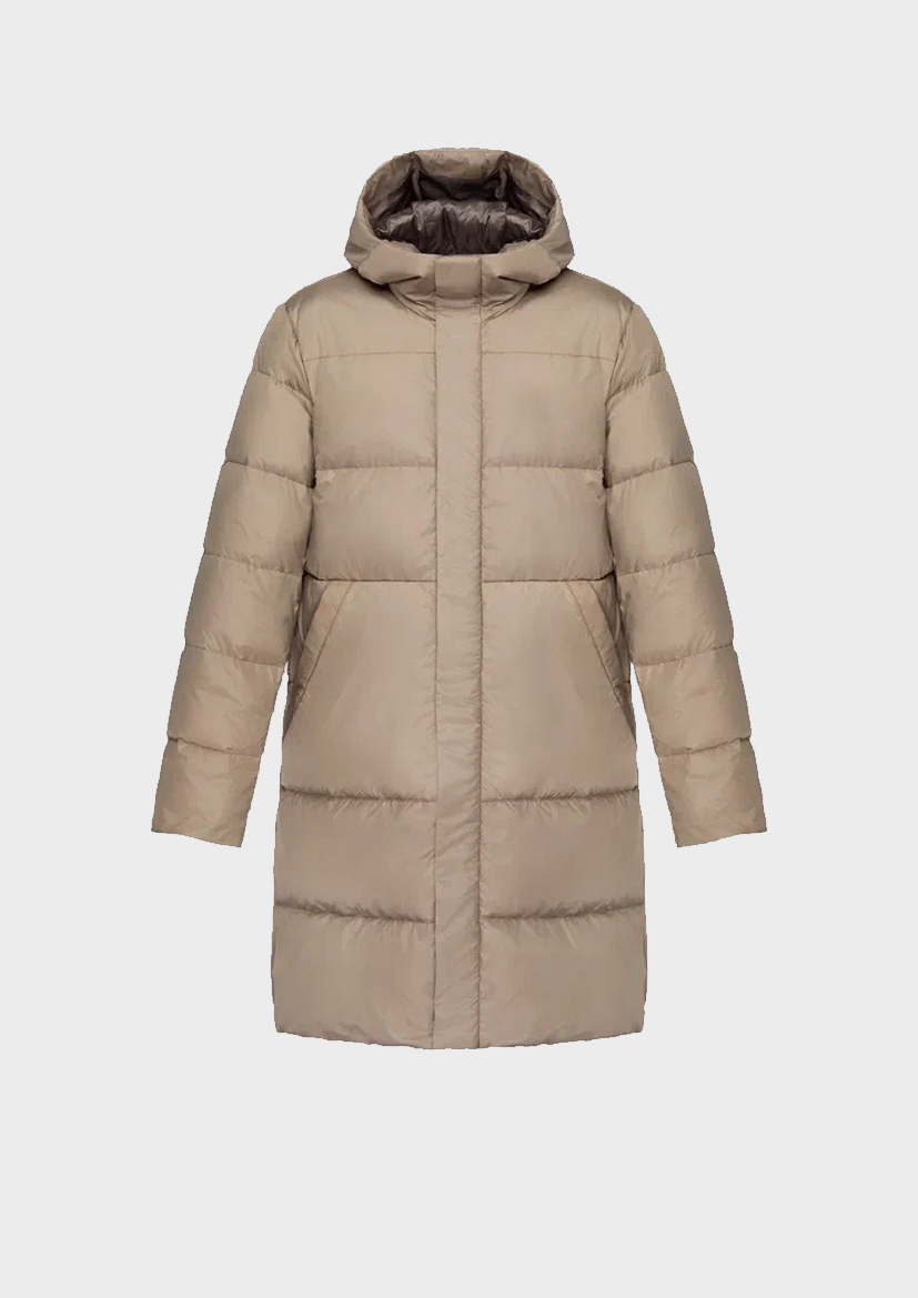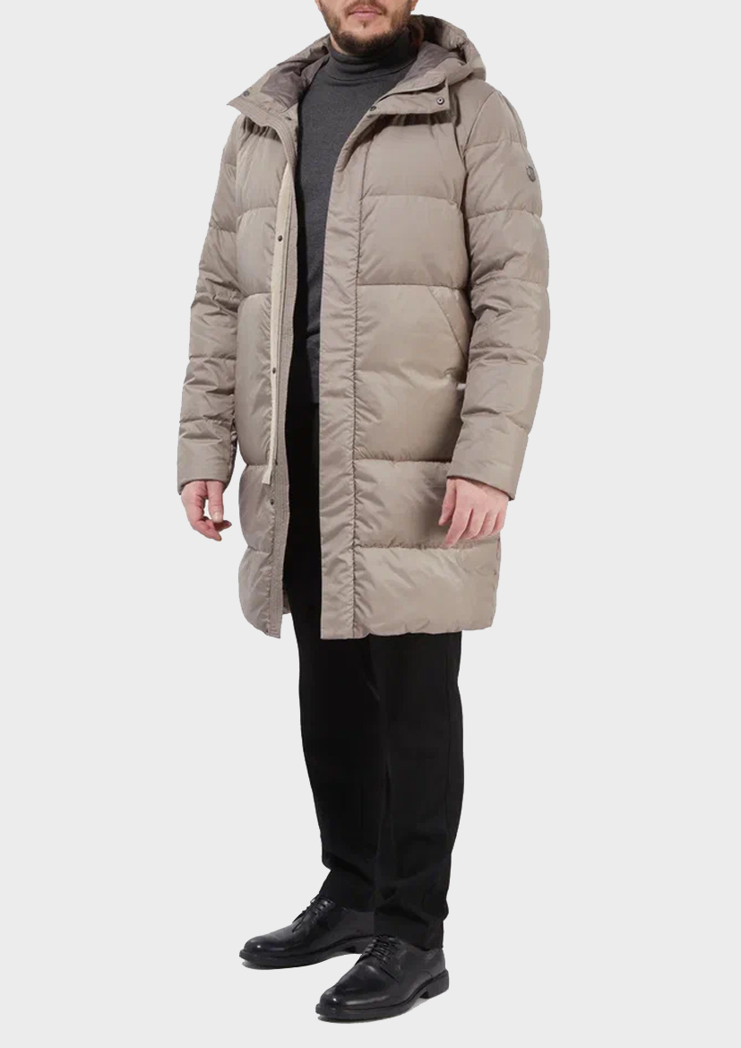Пальто мужское на натуральном пуху прямого силуэта из водооталкивающей ткани. Застежка по борту на молнии и потайные кнопки. Втачной капюшон, карманы листочки.