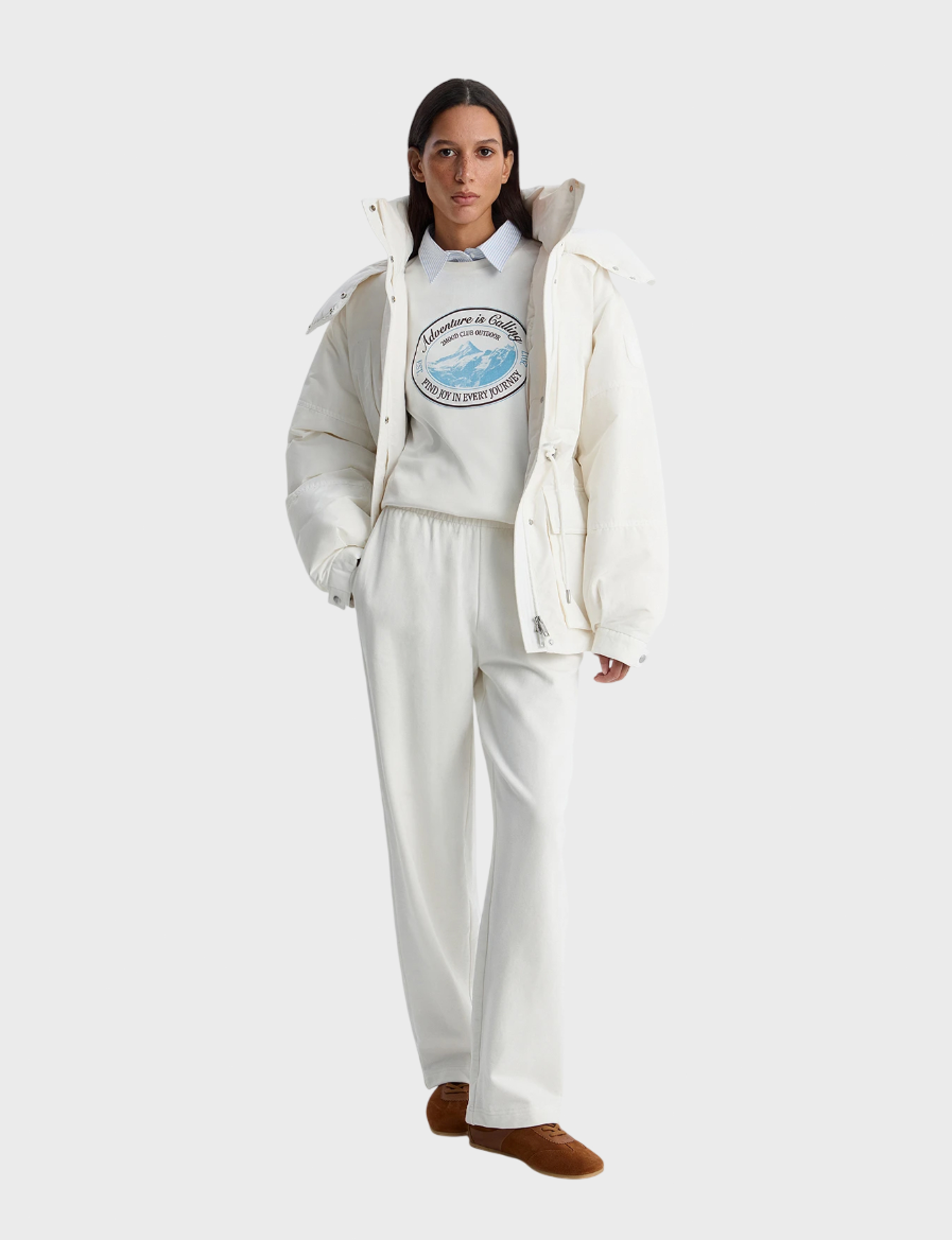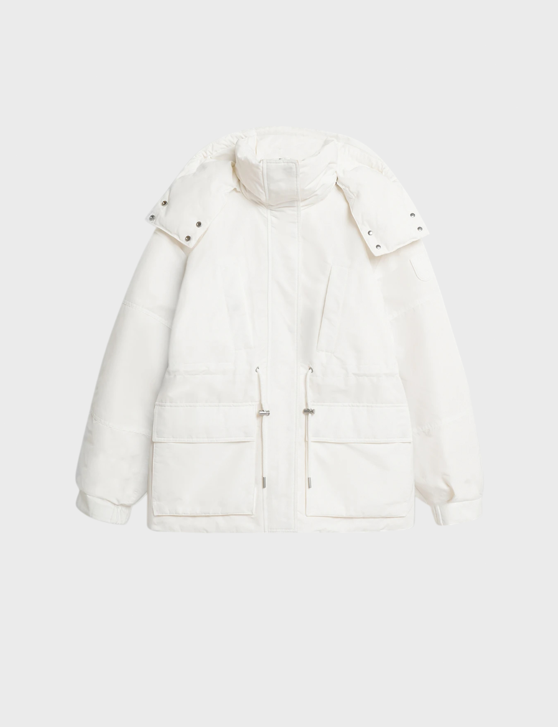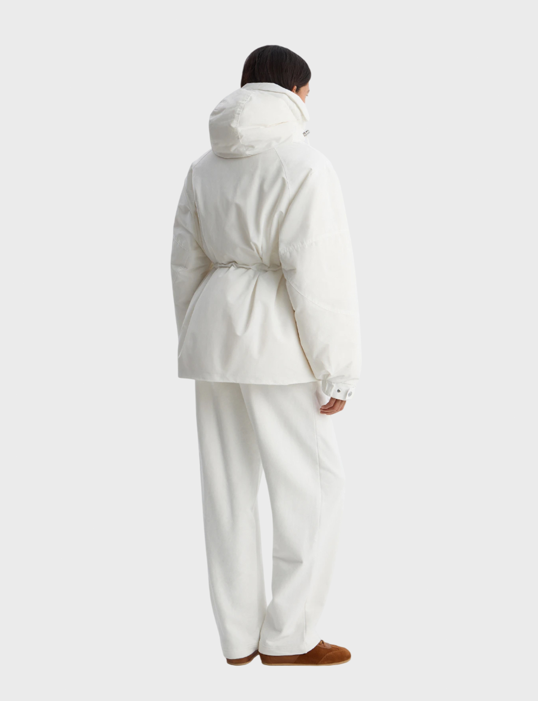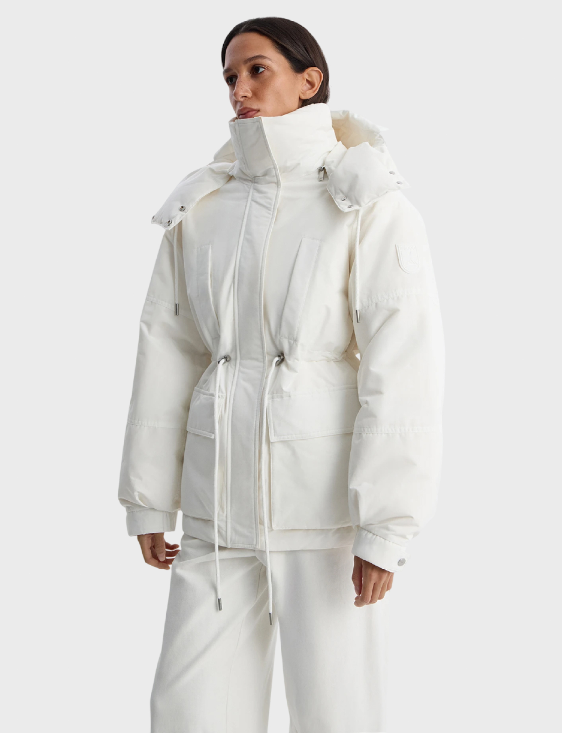 Пуховик-парка, вдохновленный горнолыжными моделями. Длина — до середины бедра. Изделие дополнено капюшоном с регулировкой, кулиской по талии с внешним шнуром и несколькими карманами — двумя накладными и двумя нагрудными. Застегивается на молнию и планку на кнопках. Детали: брендированные патч, подкладка и фурнитура.