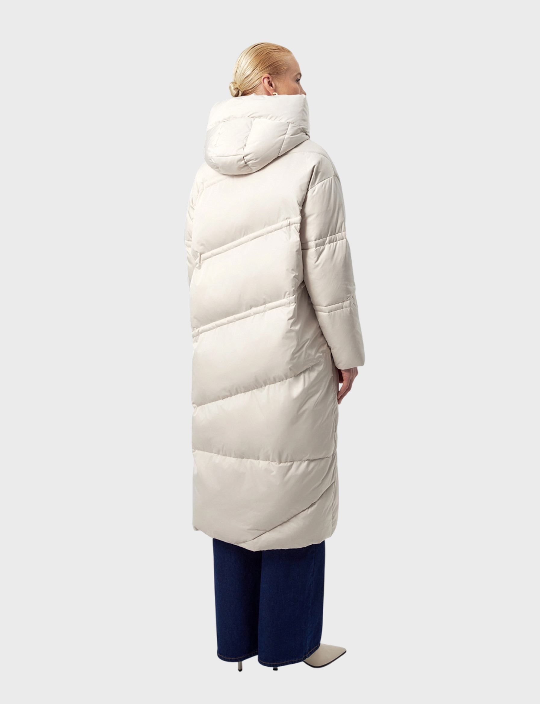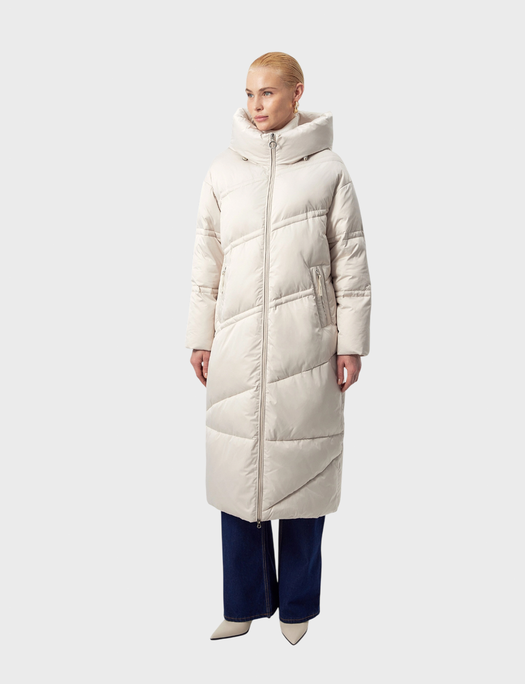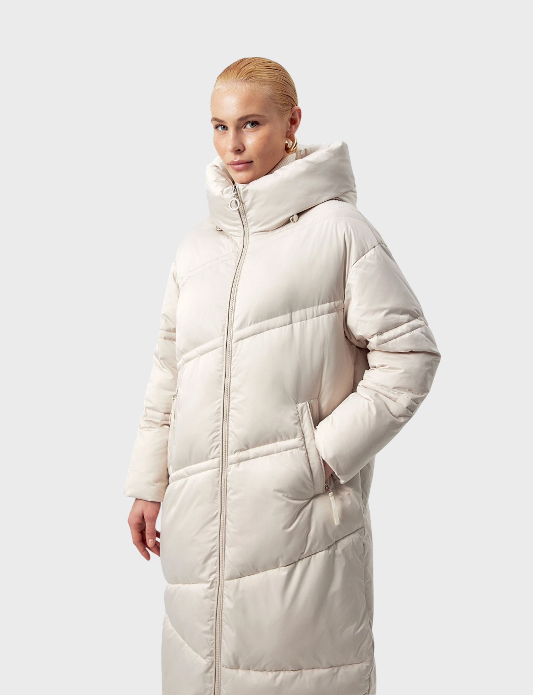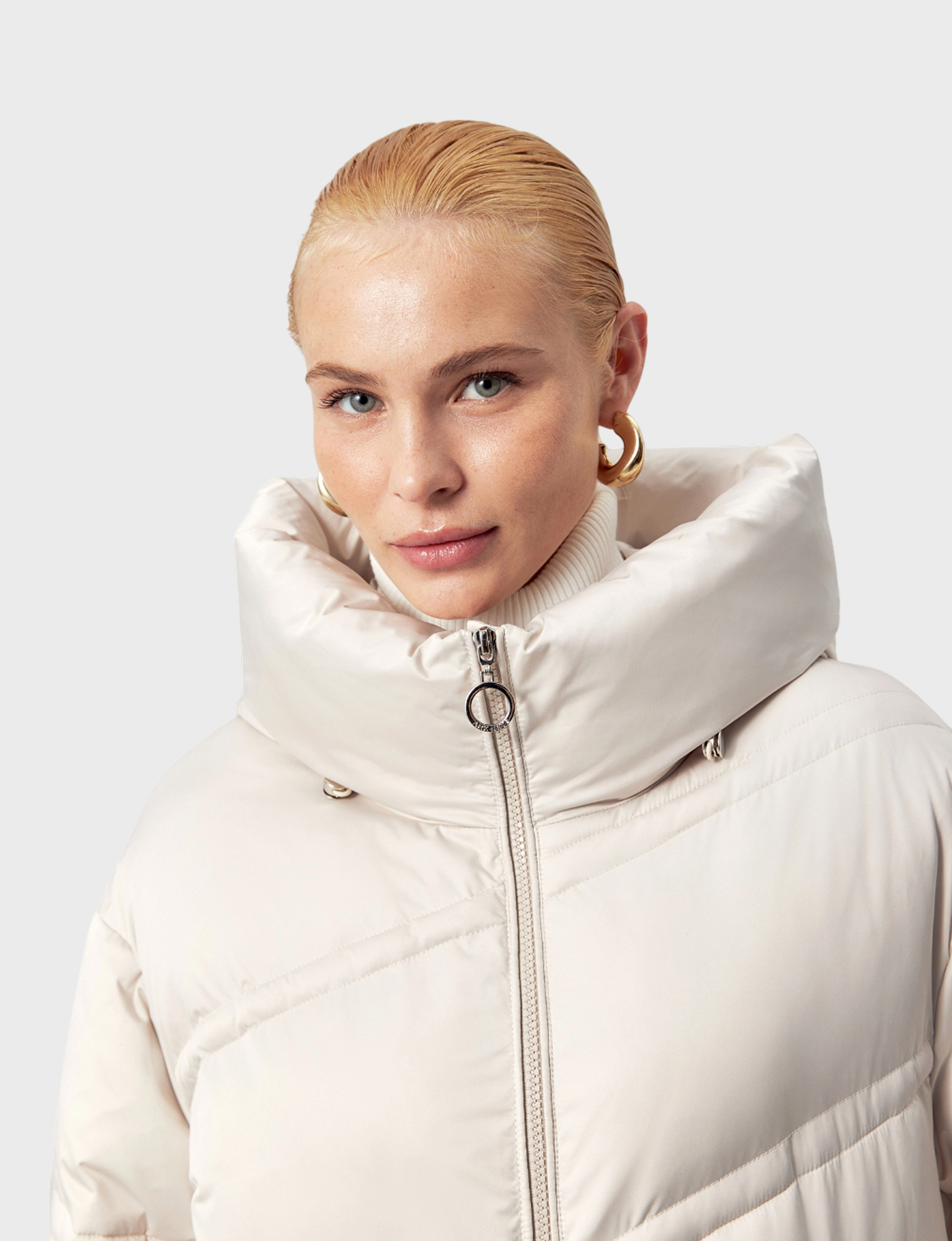 Женский пуховик Pompa молочного цвета – идеальный выбор для зимнего сезона! Верхняя ткань из 100%-го полиэстера надежно защищает от ветра и влаги, а наполнитель из 90% пуха и 10% пера обеспечивает мягкость, тепло и комфорт. Надев его, вы почувствуете себя уютно даже в самые морозные дни!