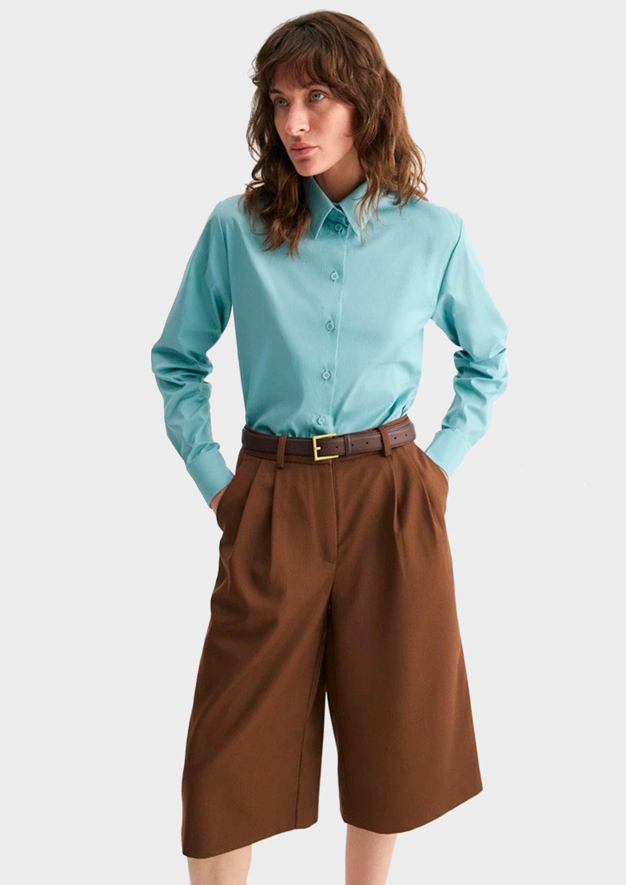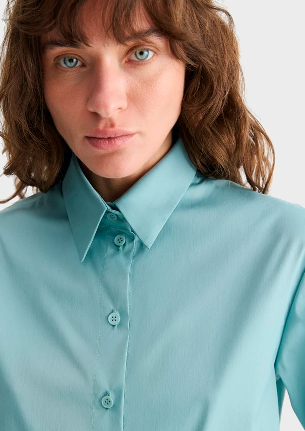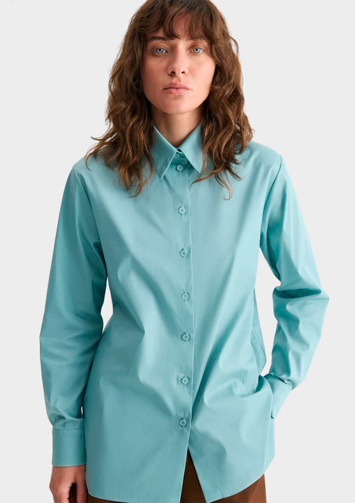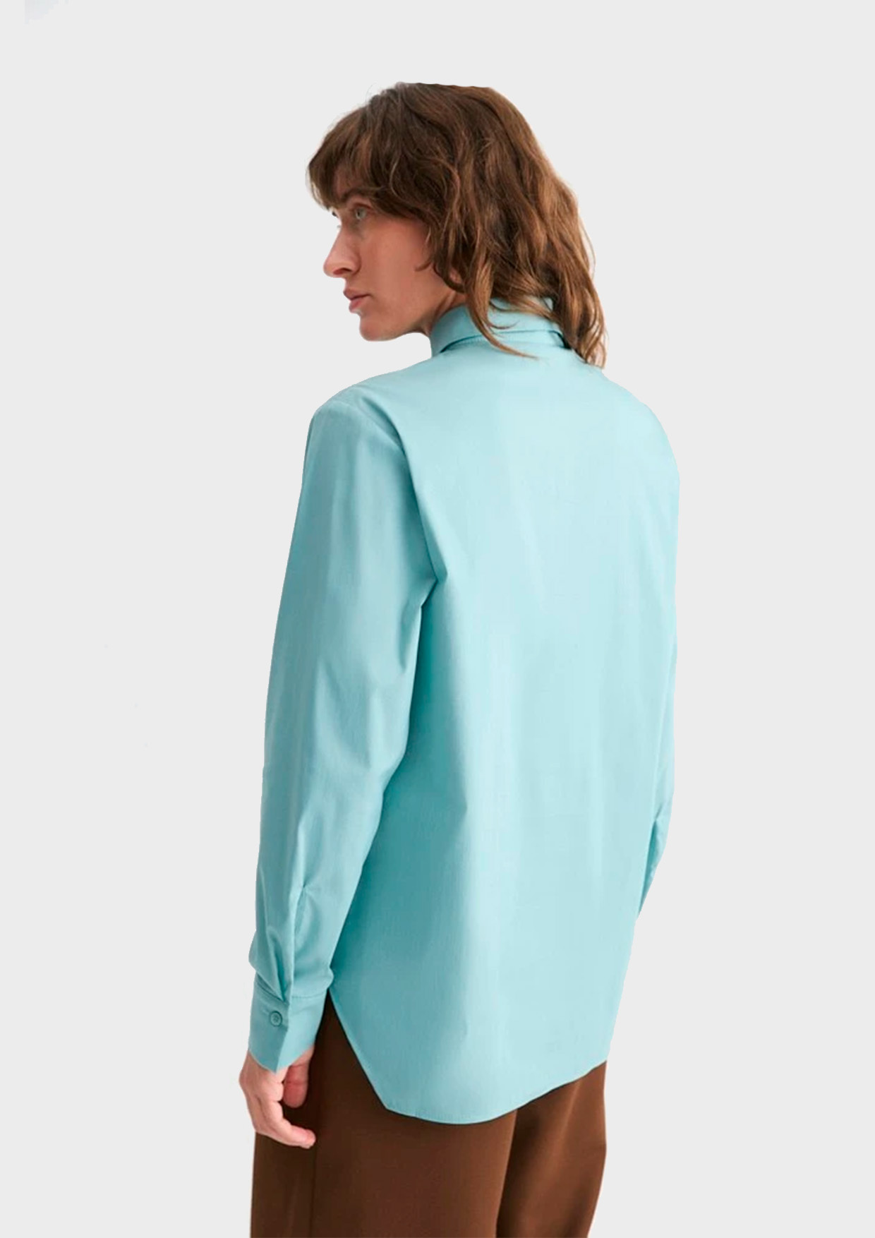 Классическая рубашка прямого силуэта с фигурным низом, который позволяет носить рубашку навыпуск, создавая более расслабленные комплекты.