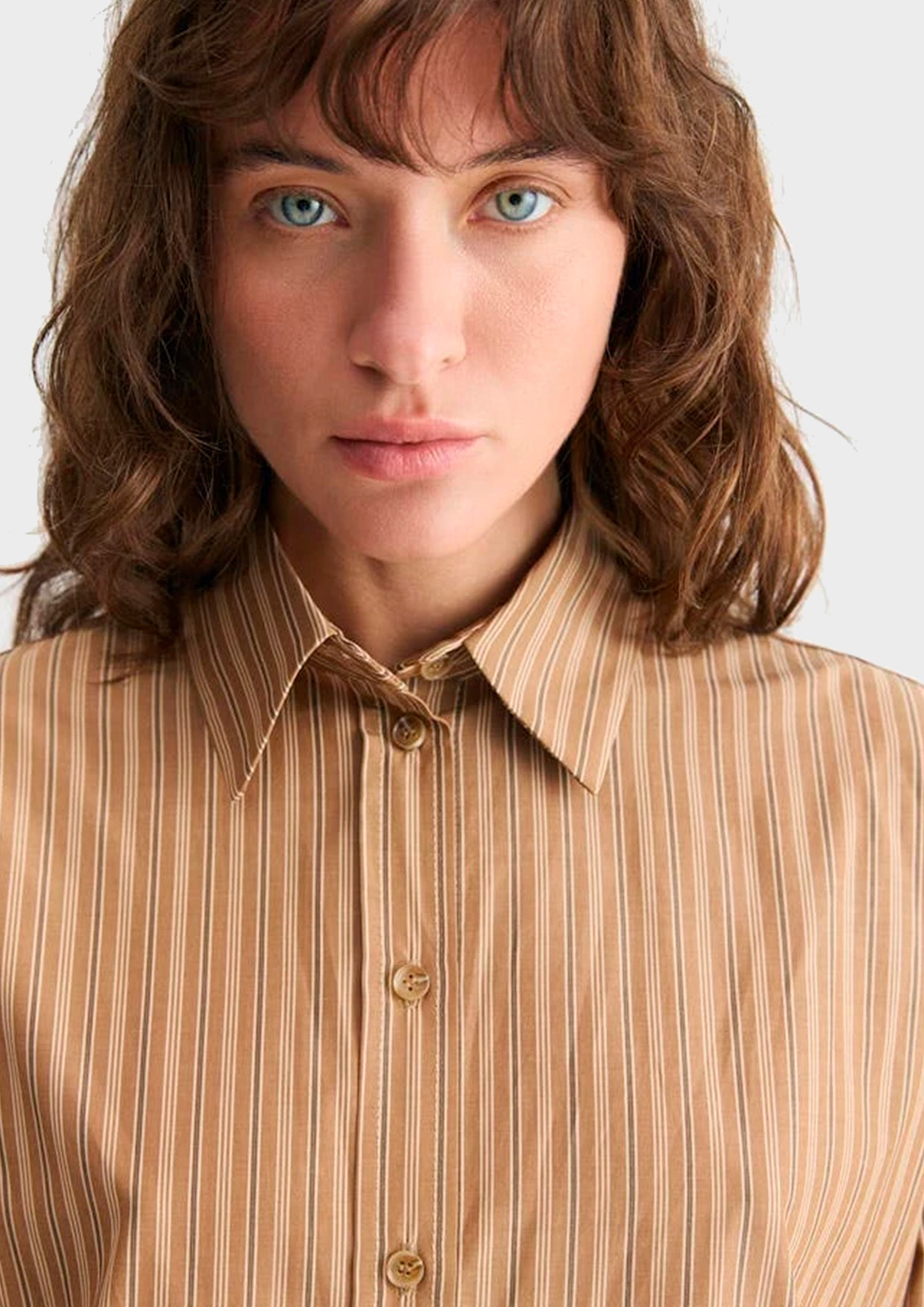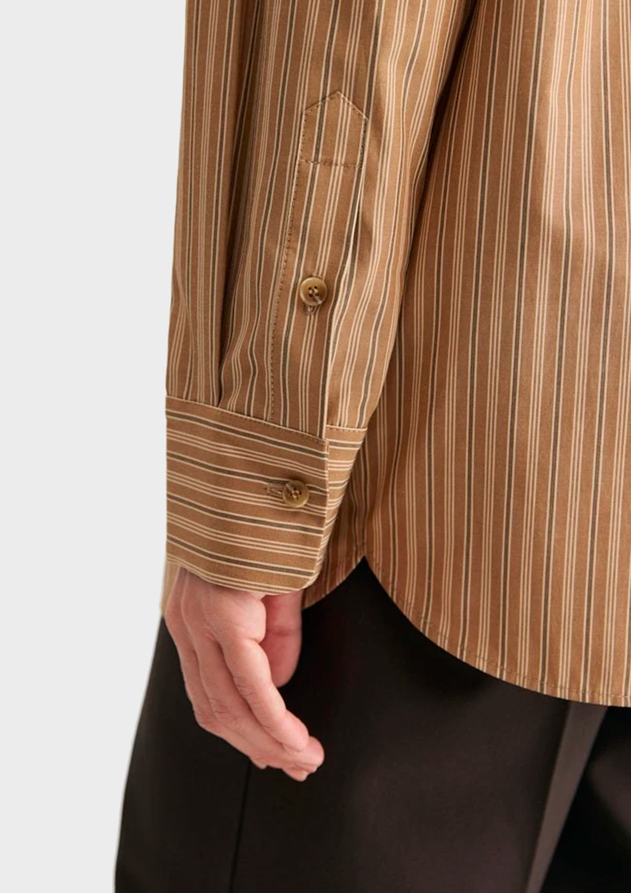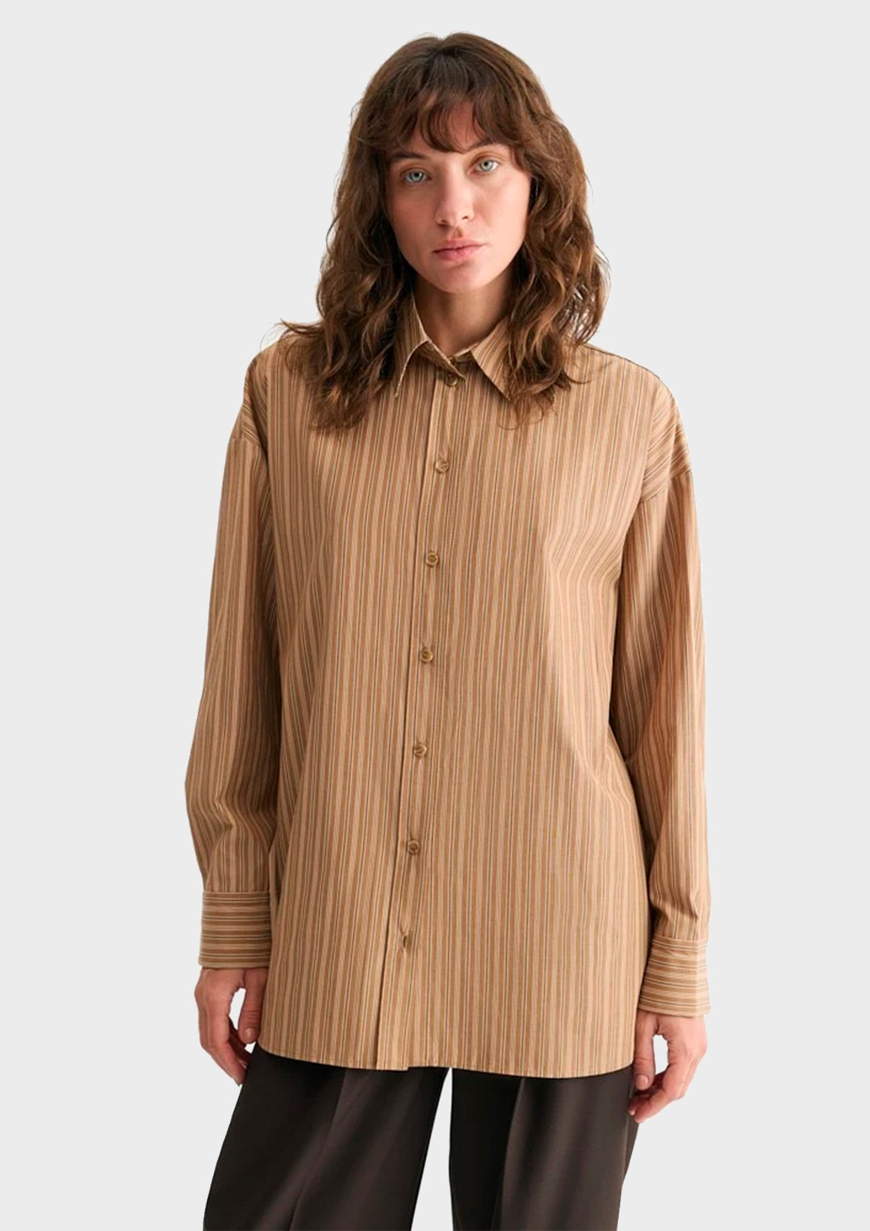 Рубашка свободного силуэта из хлопка. На спинке кокетка с двумя складками и разрезы с закругленными концами по бокам. Самодостаточная позиция для делового гардероба.
