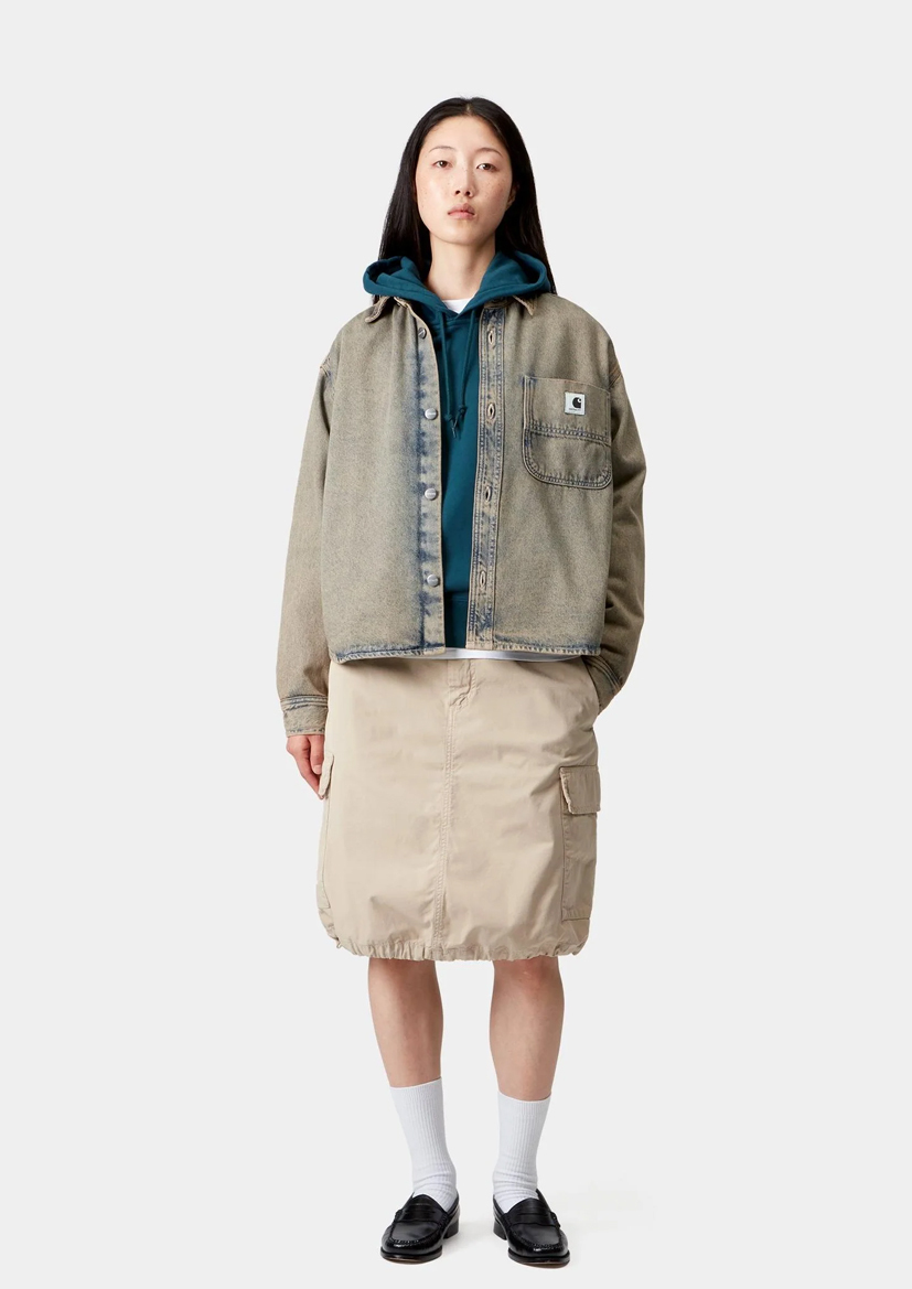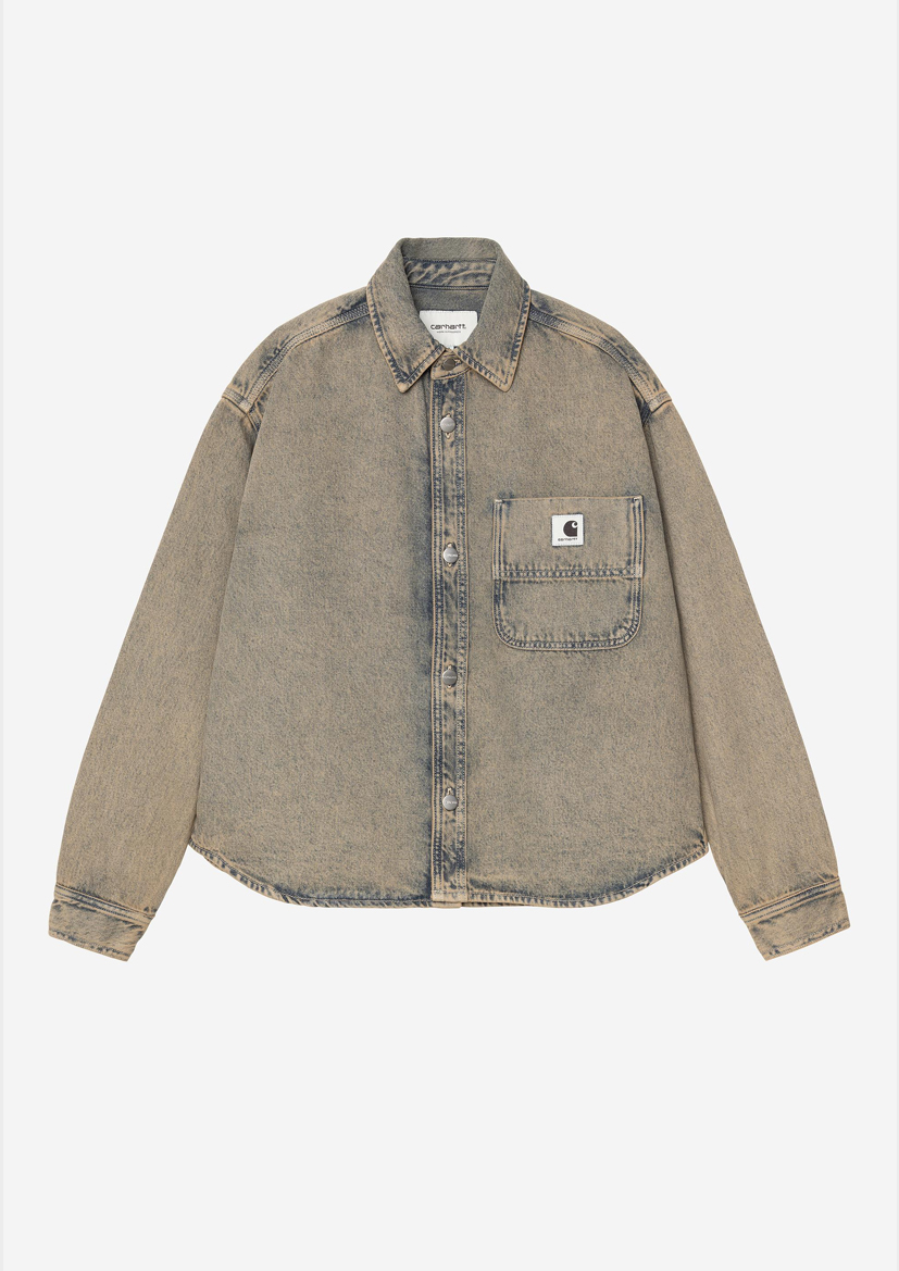 Женская куртка-рубашка Georgia изготовлена из плотного хлопкового денима без подкладки. Изделие украшено накладным карманом на груди, c квадратной этикеткой из ткани.
