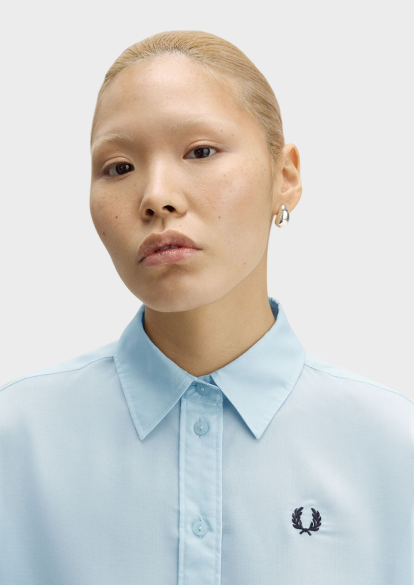 Легкая и универсальная рубашка с имитацией пуговиц-ракушек и элегантным отложным воротником. Ткань из лиоцелла и переработанного полиэстера. Свободный крой. Вышитый логотип в виде лаврового венка на левой стороне груди.