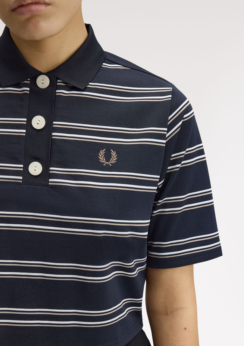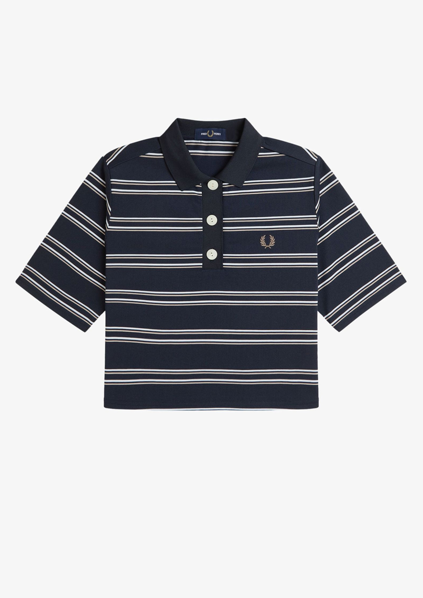 Укороченная рубашка поло в полоску с планкой из блестящего джерси и имитацией пуговиц-ракушек.
