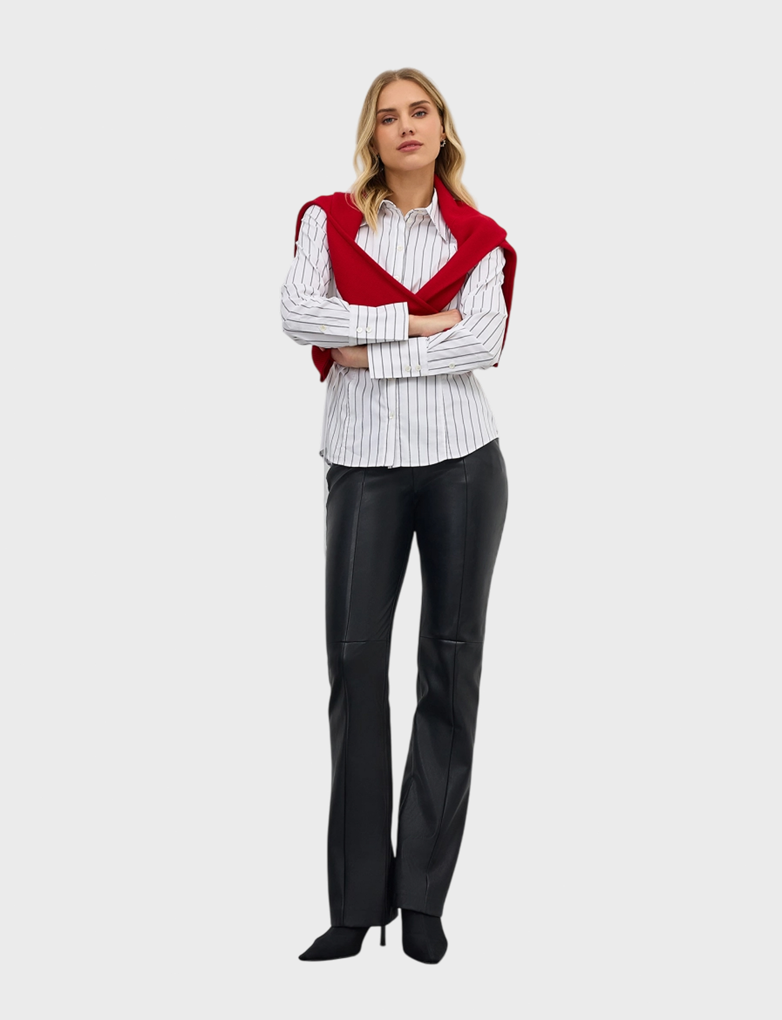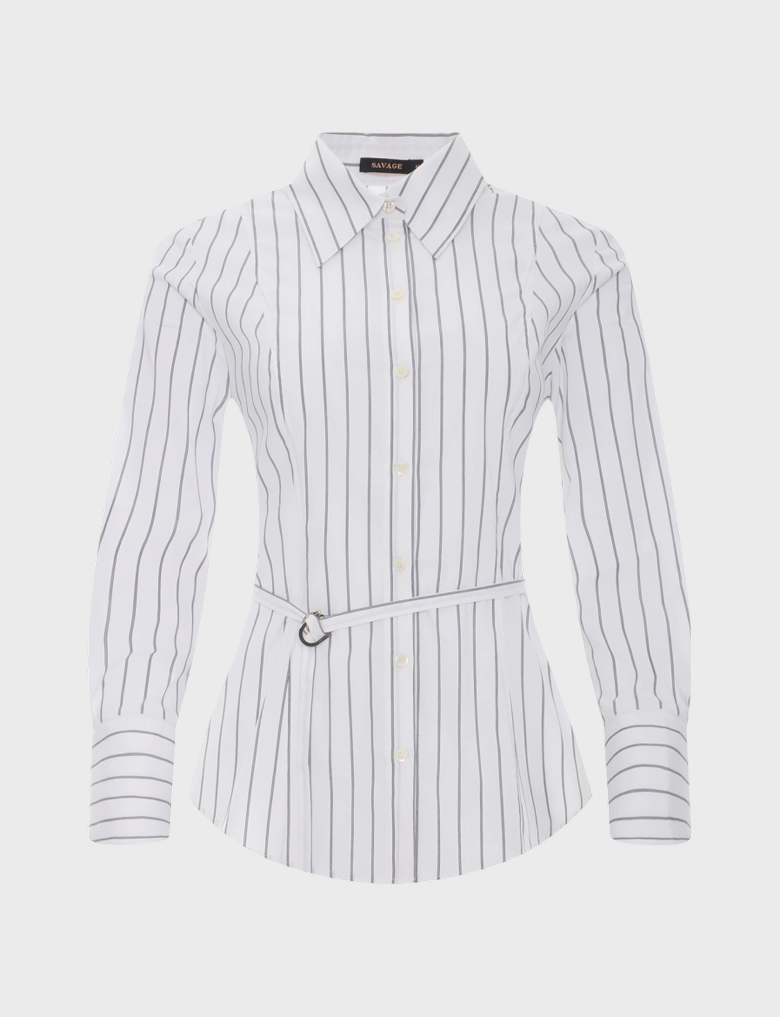 Рубашка приталенного силуэта в тонкую контрастную полоску. Отложной воротник. Застежка на пуговицы. Широкие манжеты по низу рукавов. Дополнена тонким съемным поясом с металлической пряжкой.
