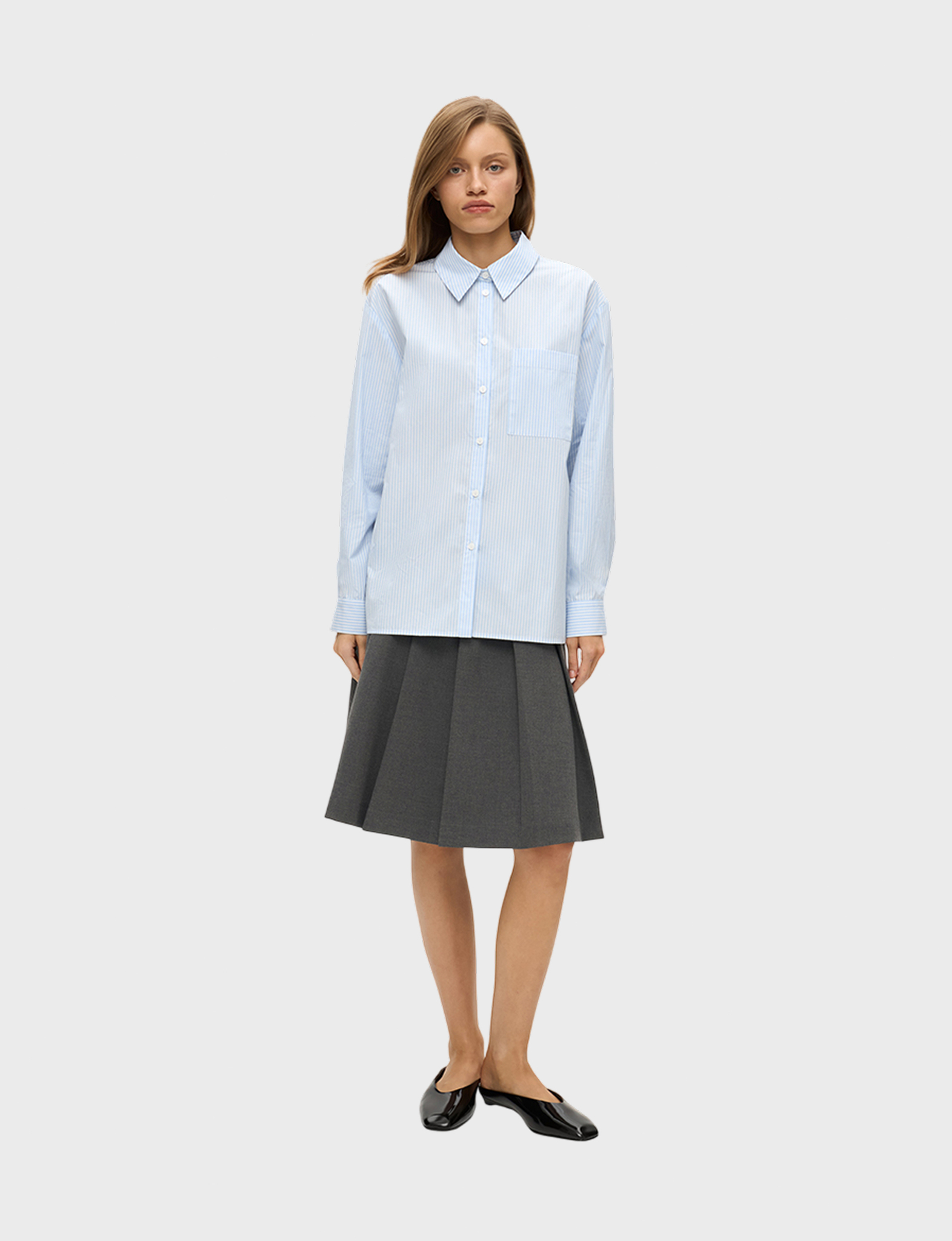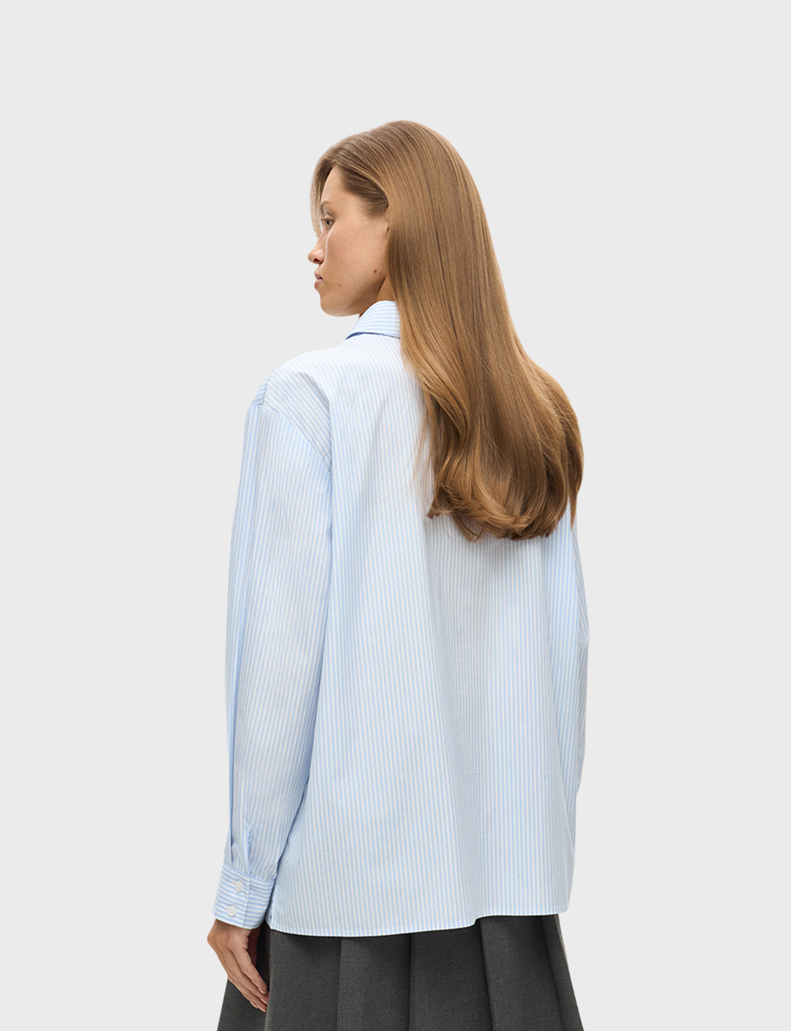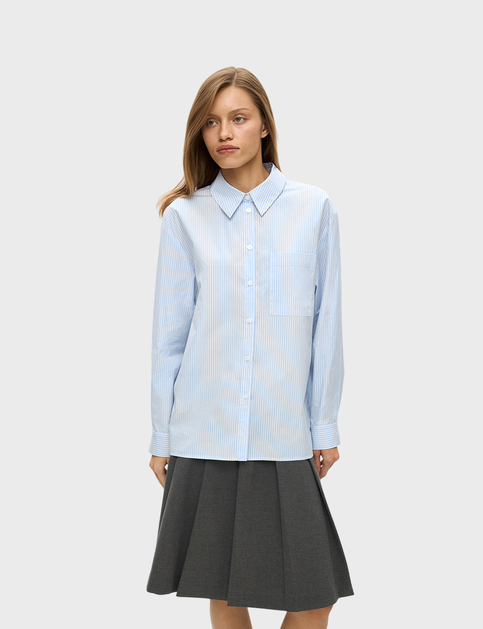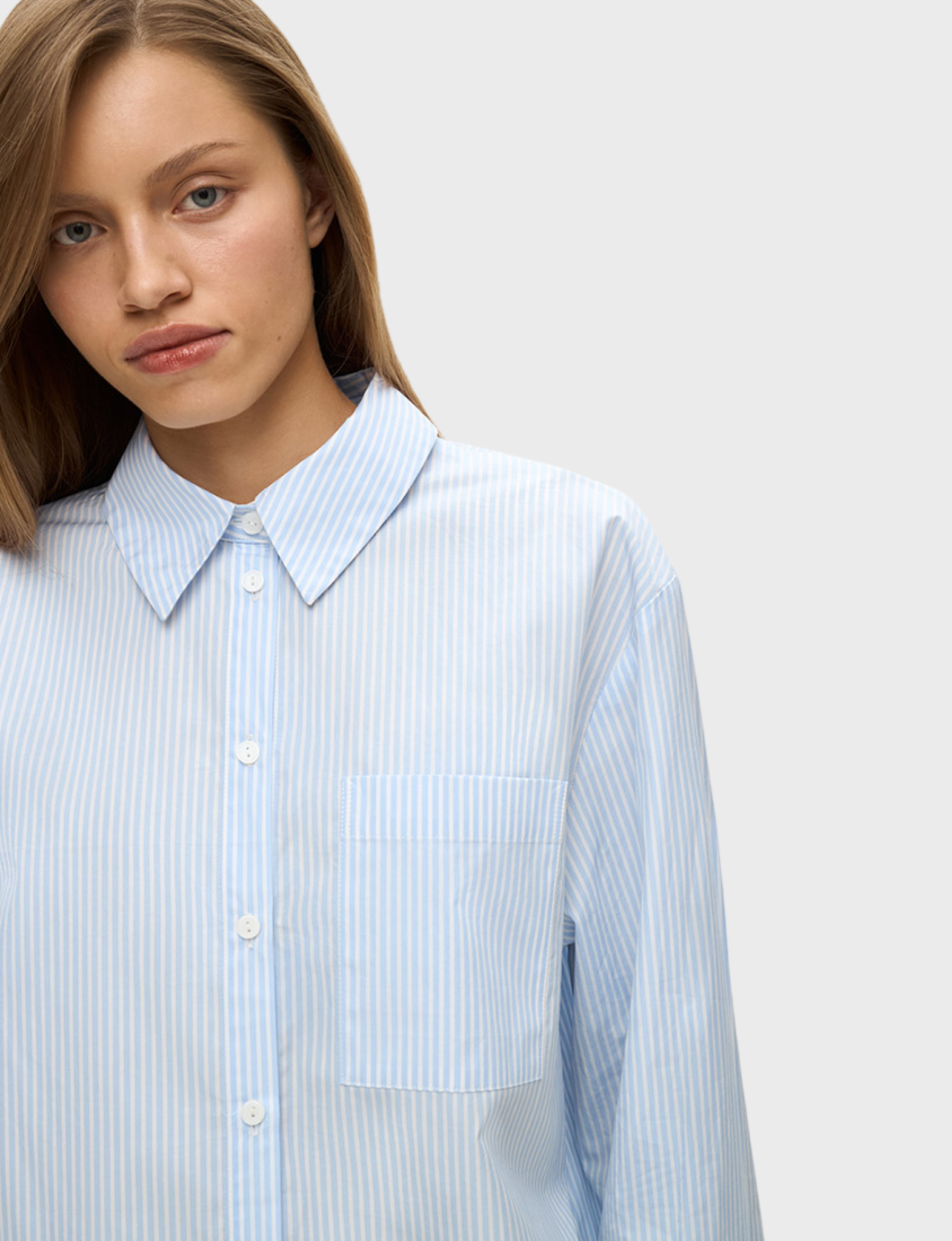 Рубашка прямого силуэта свободного кроя, комфортной средней длины. Модель выполнена из хлопковой ткани, которая мягко держит форму, пропускает воздух и почти не мнется. Воротник отложной со стойкой, застегивается на пуговицы. Рукава с манжетом на пуговицах, по переду – нагрудный карман. В боковых швах по низу – разрезы, низ рубашки прямой. Рубашка в полоску подойдет для повседневных и офисных образов, сочетайте ее с юбкой или брюками.