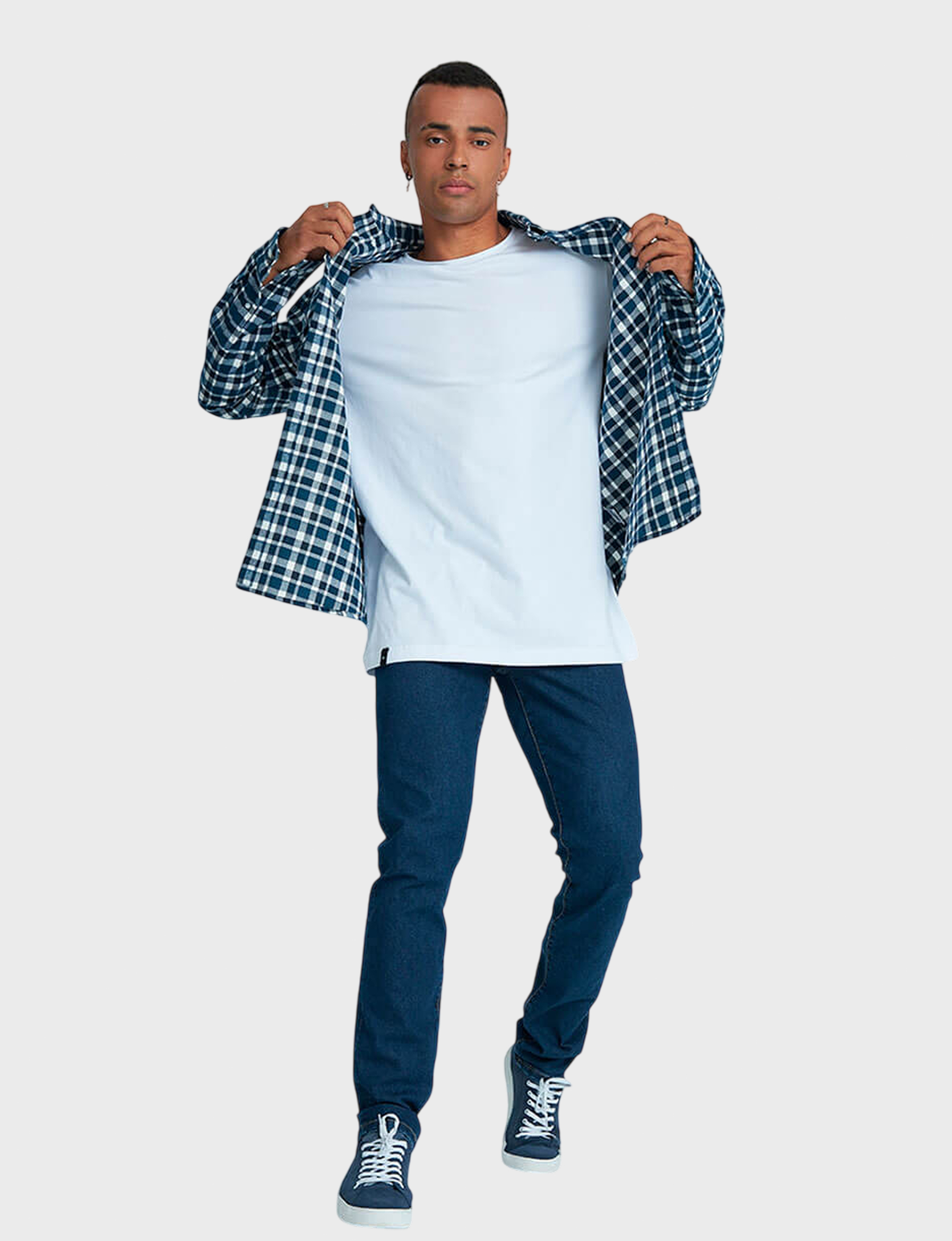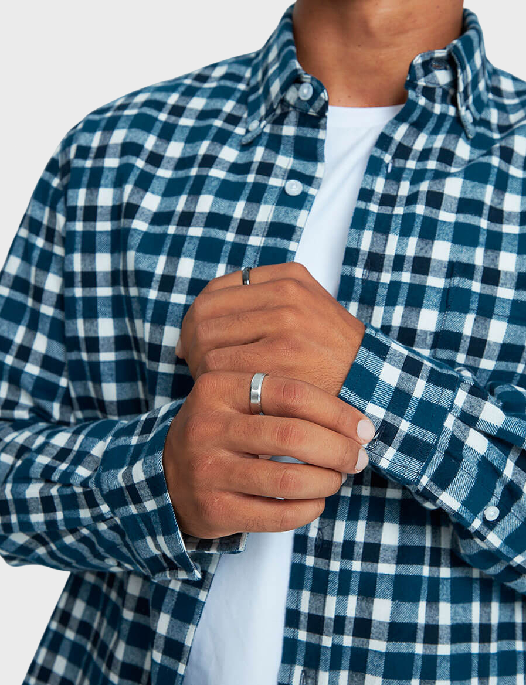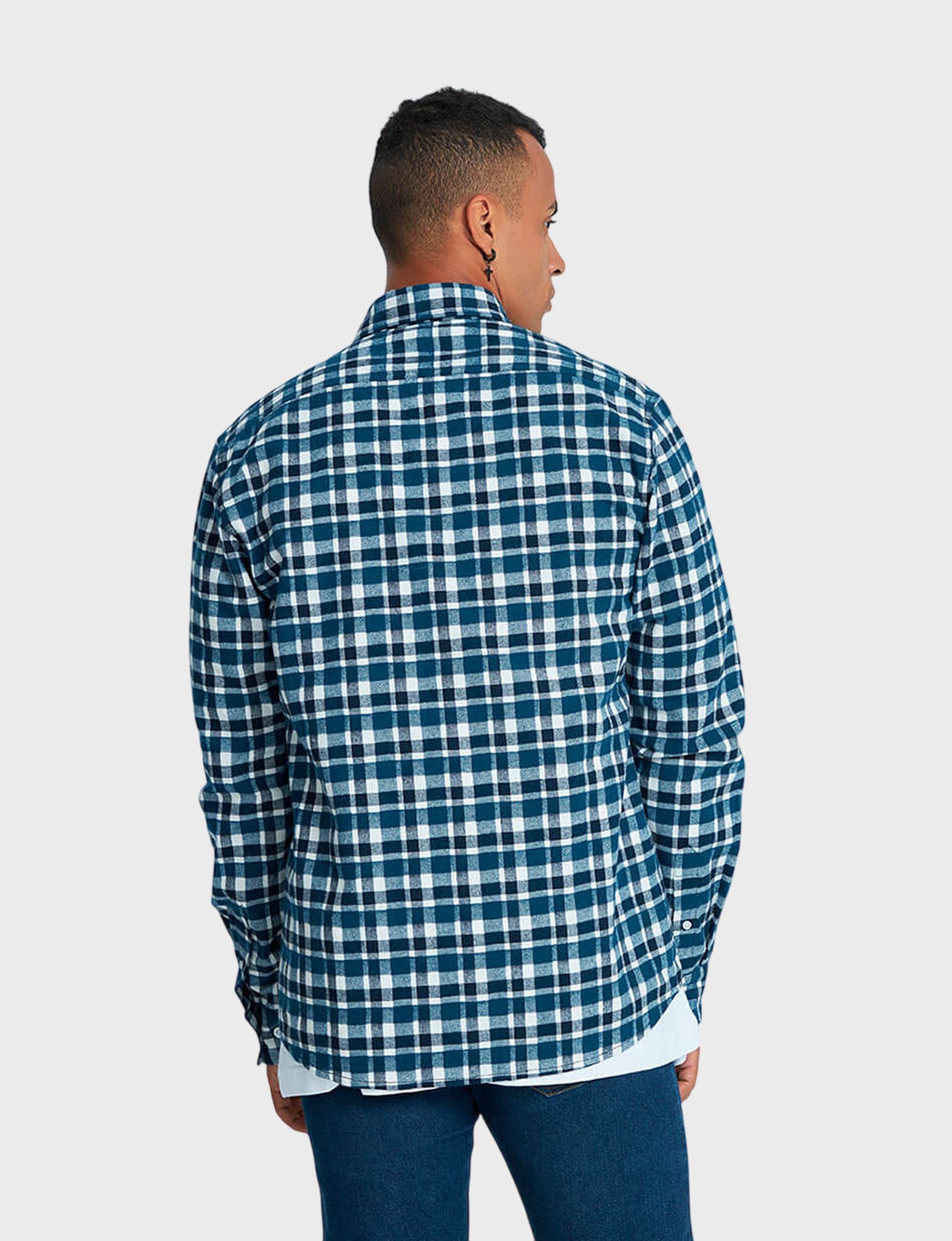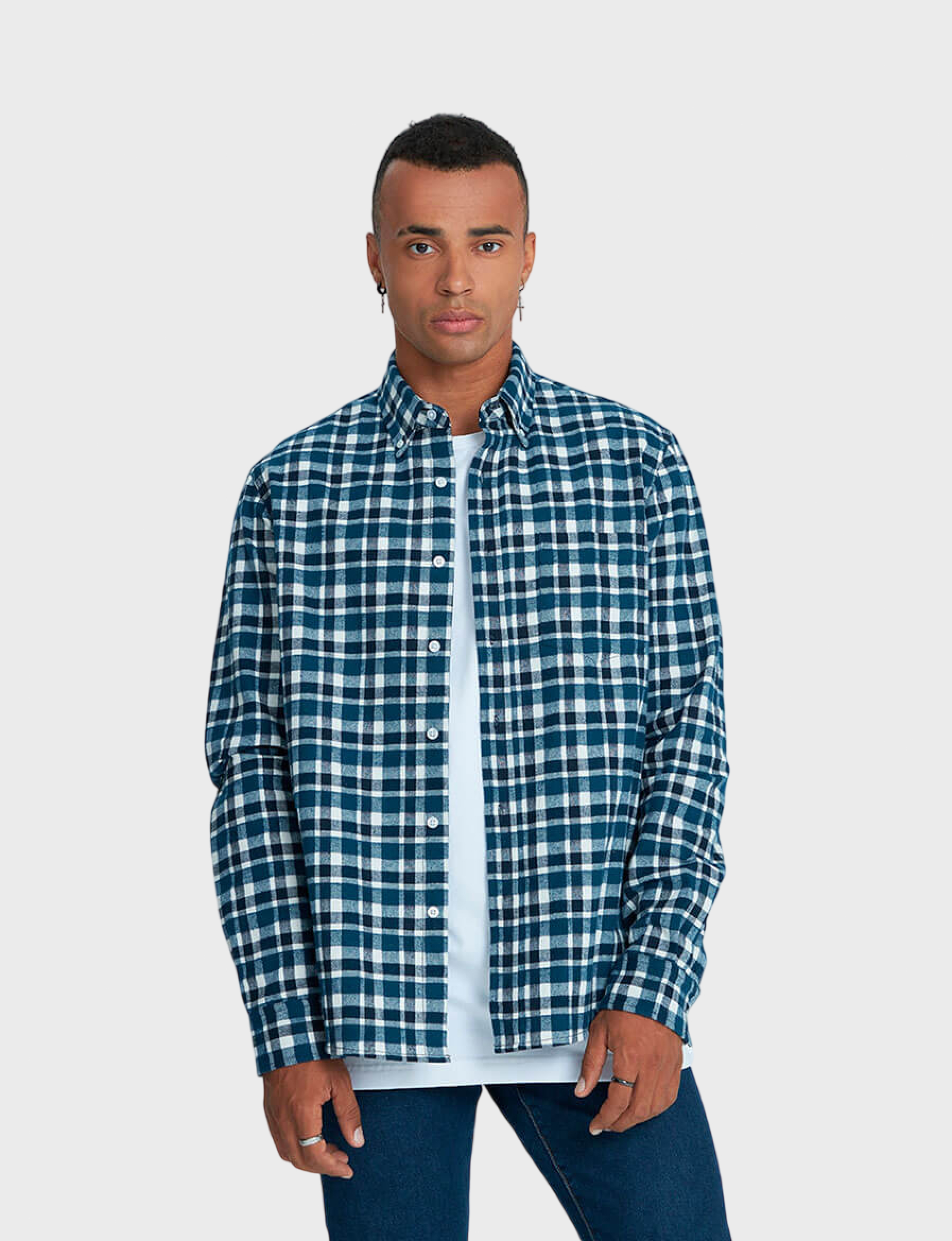 Рубашка прямого кроя с длинным рукавом и одним накладным карманом. Воротник баттен-даун (button-down) считается неофициальным и является характерной чертой неформальных рубашек. Застёжка — накладная планка на пуговицах. Кокетка придает рубашке нужную форму и позволяет добиться оптимальной посадки изделия на спинке. Все детали рубашки отстрочены двойной строчкой в тон ткани. Рубашка выполнена из высококачественной фланели, в составе которой 100% хлопок. Фланель — мягкая, приятная на ощупь, прочная ткань, способная сохранять тепло, что особенно важно в холодный период года. Контрастная клетка в сине-белом исполнении остаётся популярной на протяжении многих сезонов. Эта модель основа базового мужского гардероба и повседневных образов.