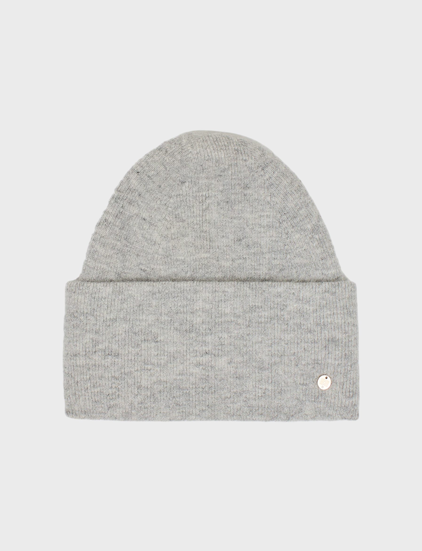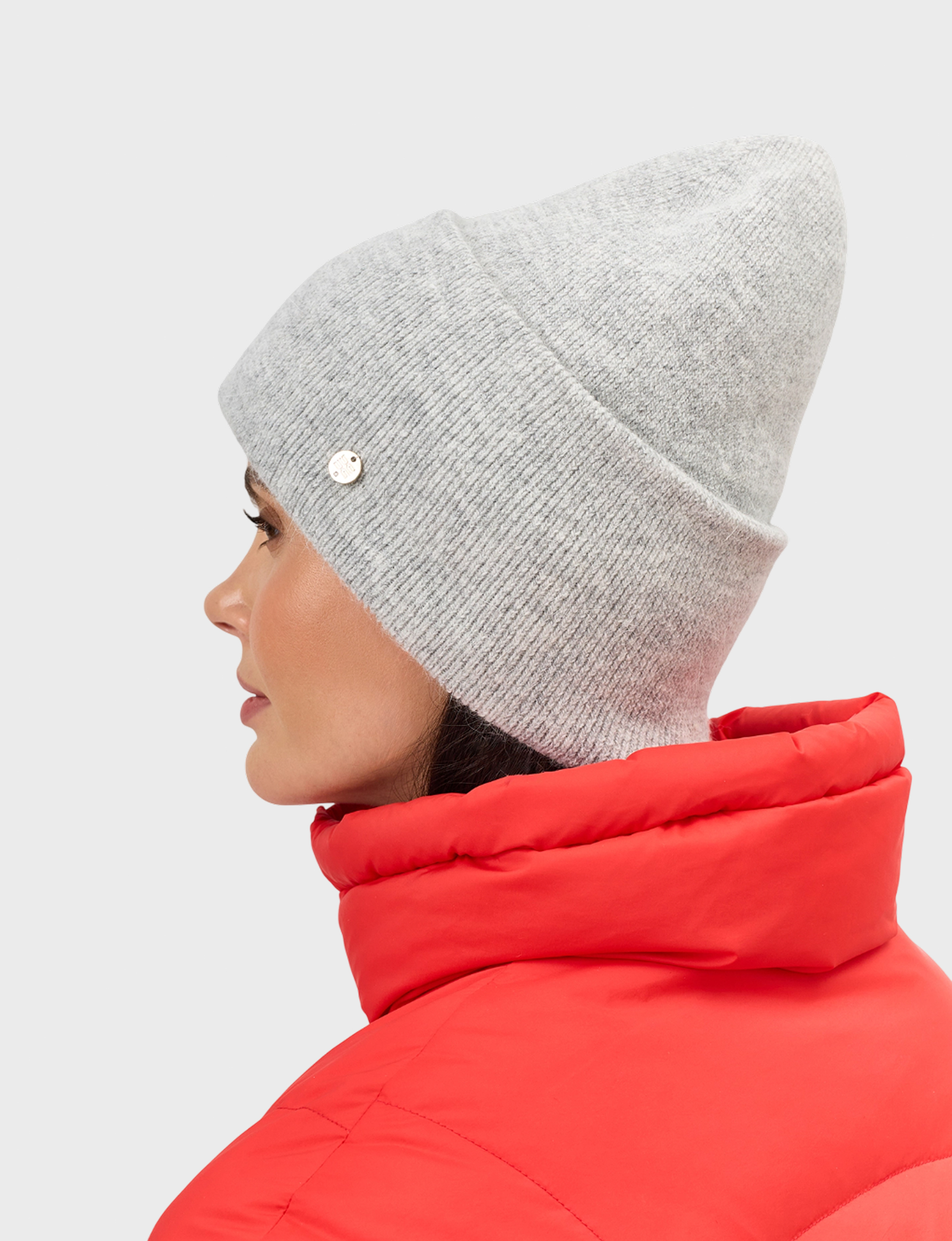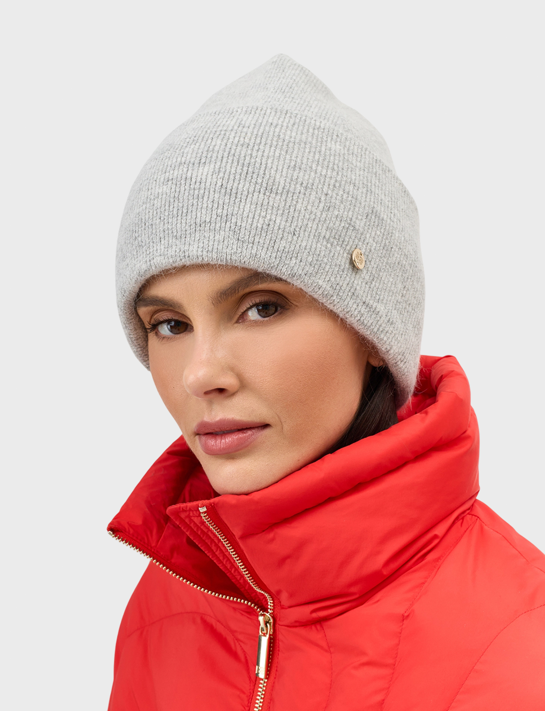 Шапка бини в рубчик. Дополнена декоративным металлическим декором на широком отвороте. В составе вискоза и ангора.