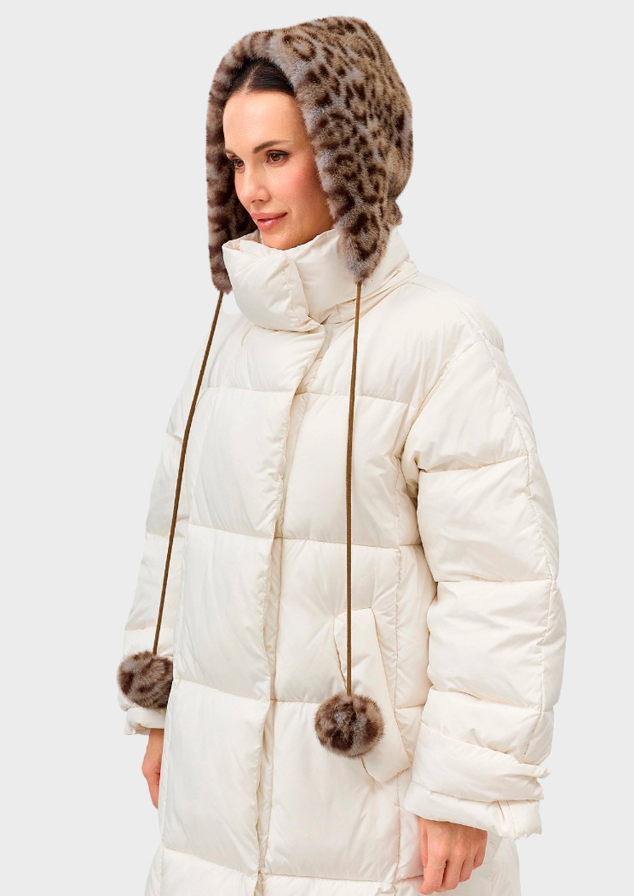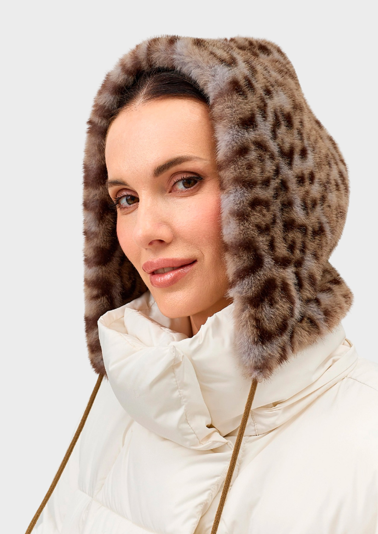 Капор из искусственного меха с анималистичным принтом. Тонкие завязки. Дополнена декоративными помпонами. Текстильная ворсистая подкладка.