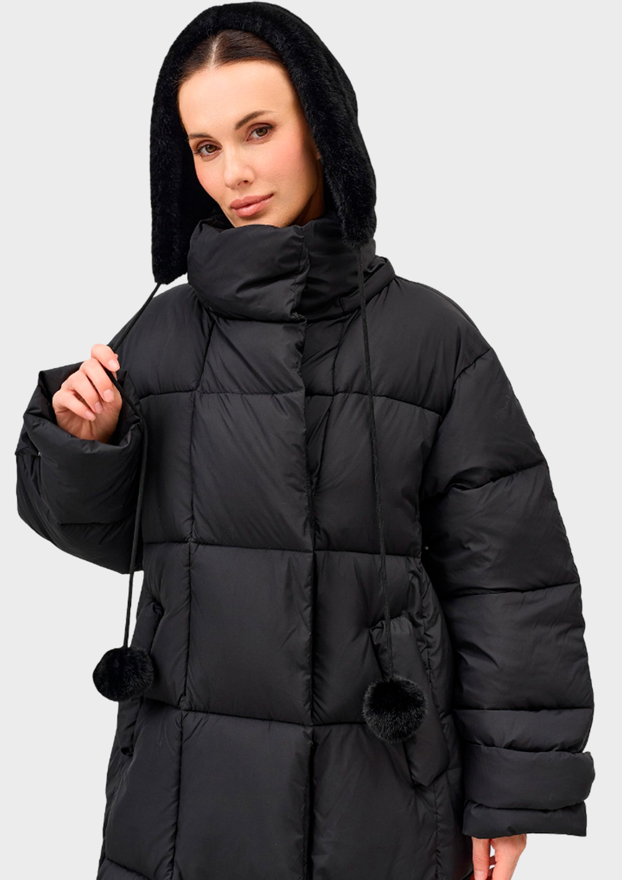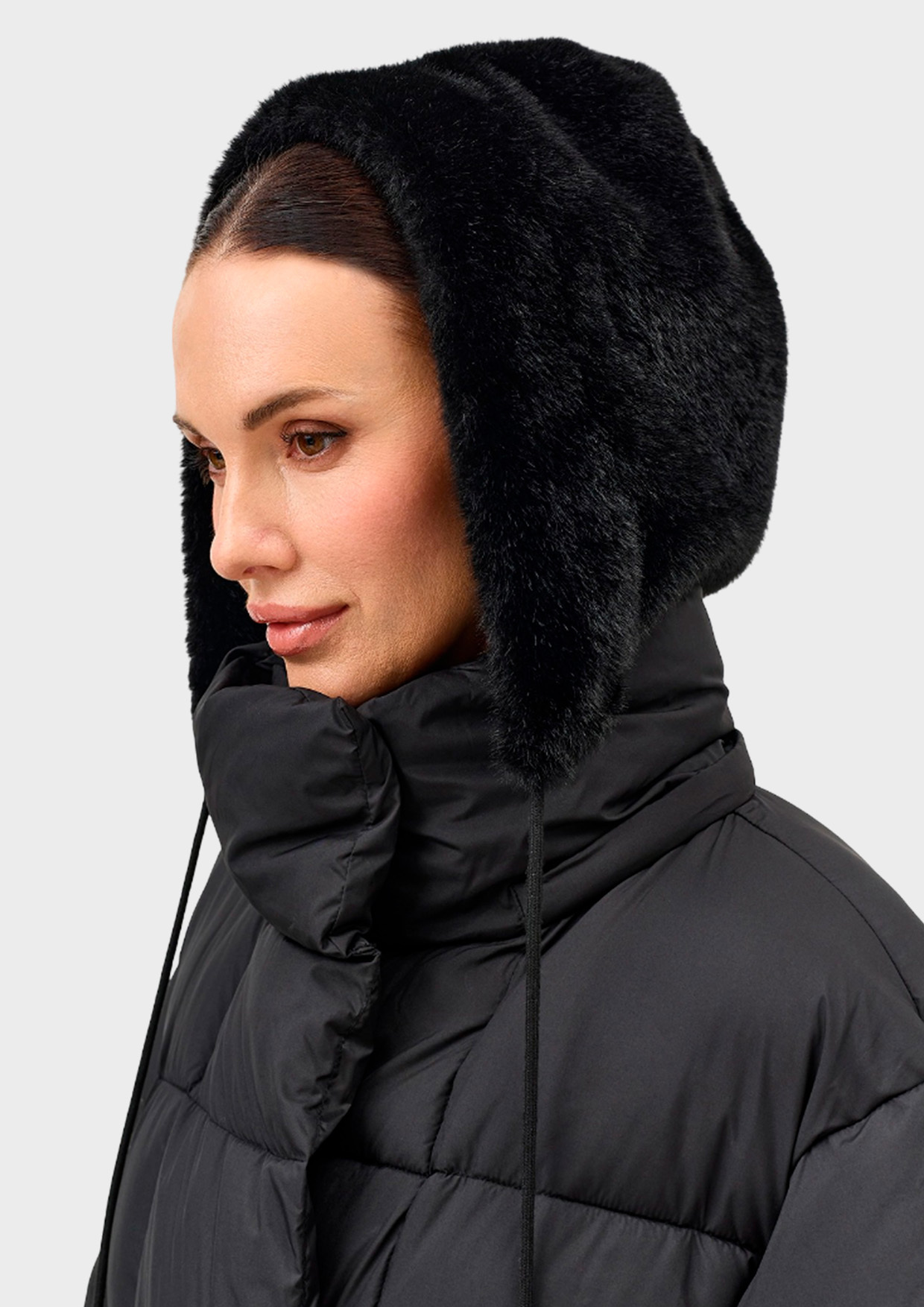 Капор из искусственного меха. Тонкие завязки. Дополнена декоративными помпонами. Текстильная ворсистая подкладка.