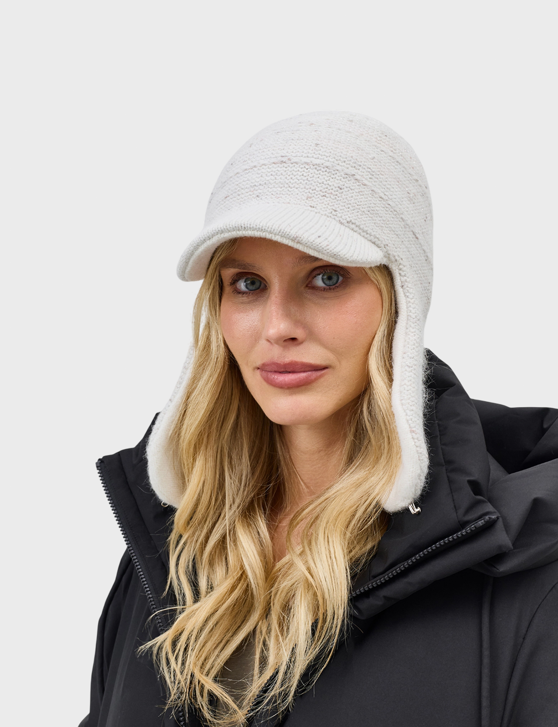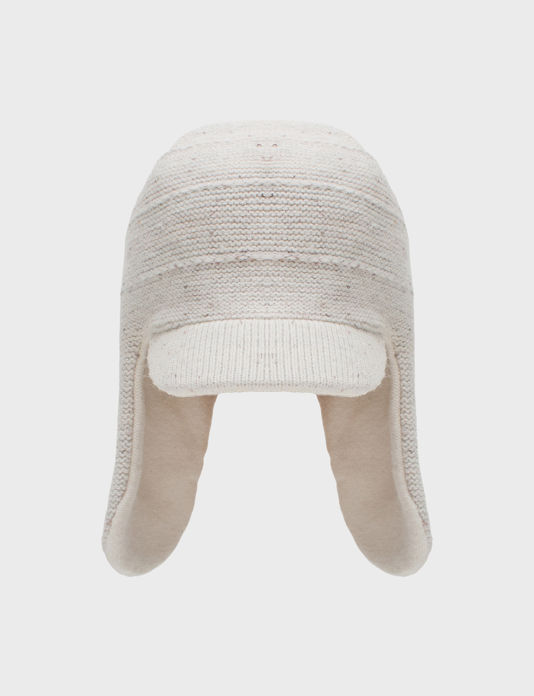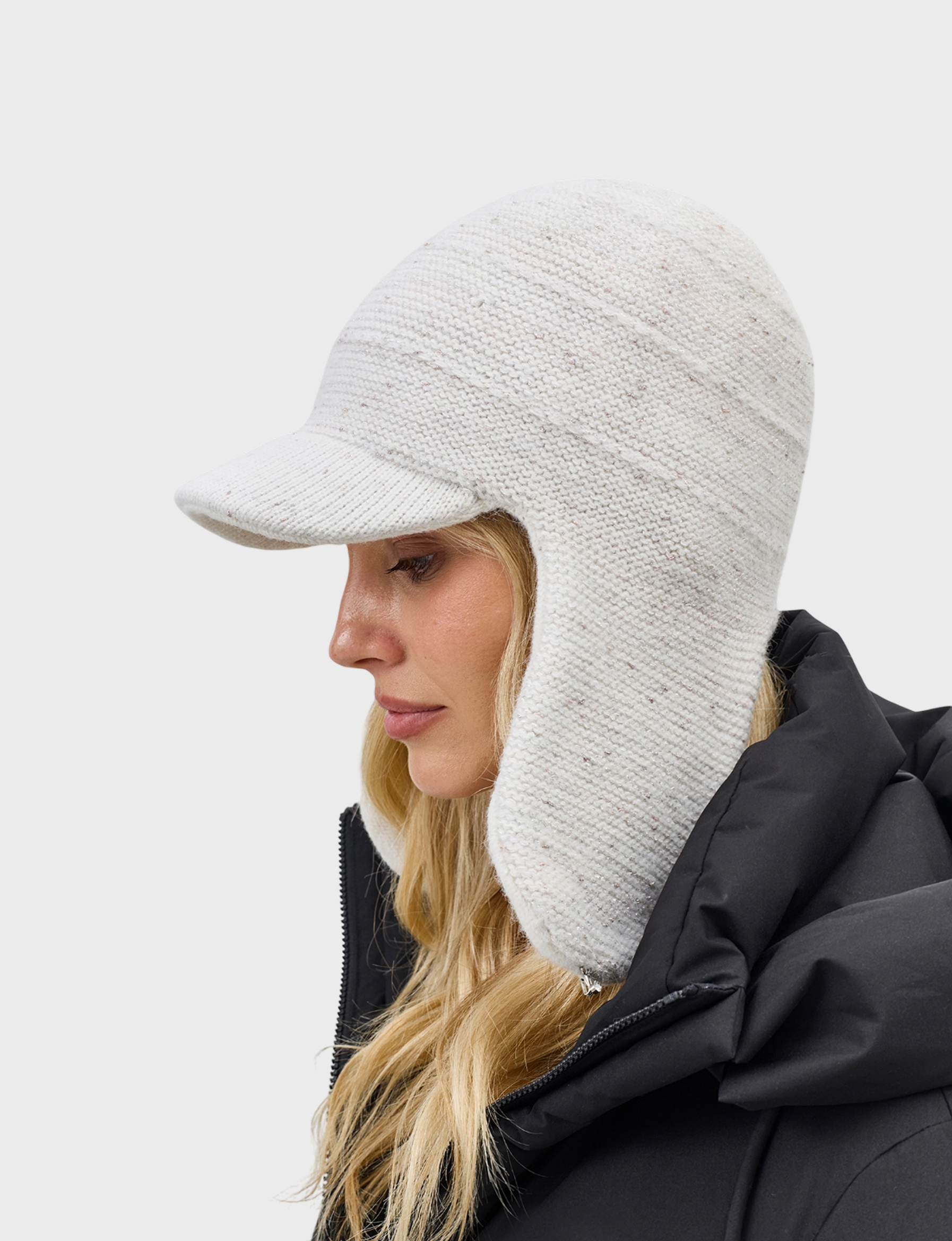 Шапка-ушанка с козырьком из пряжи с ангорой и люрексом. Отделка в рубчик. Широкий изогнутый козырек.