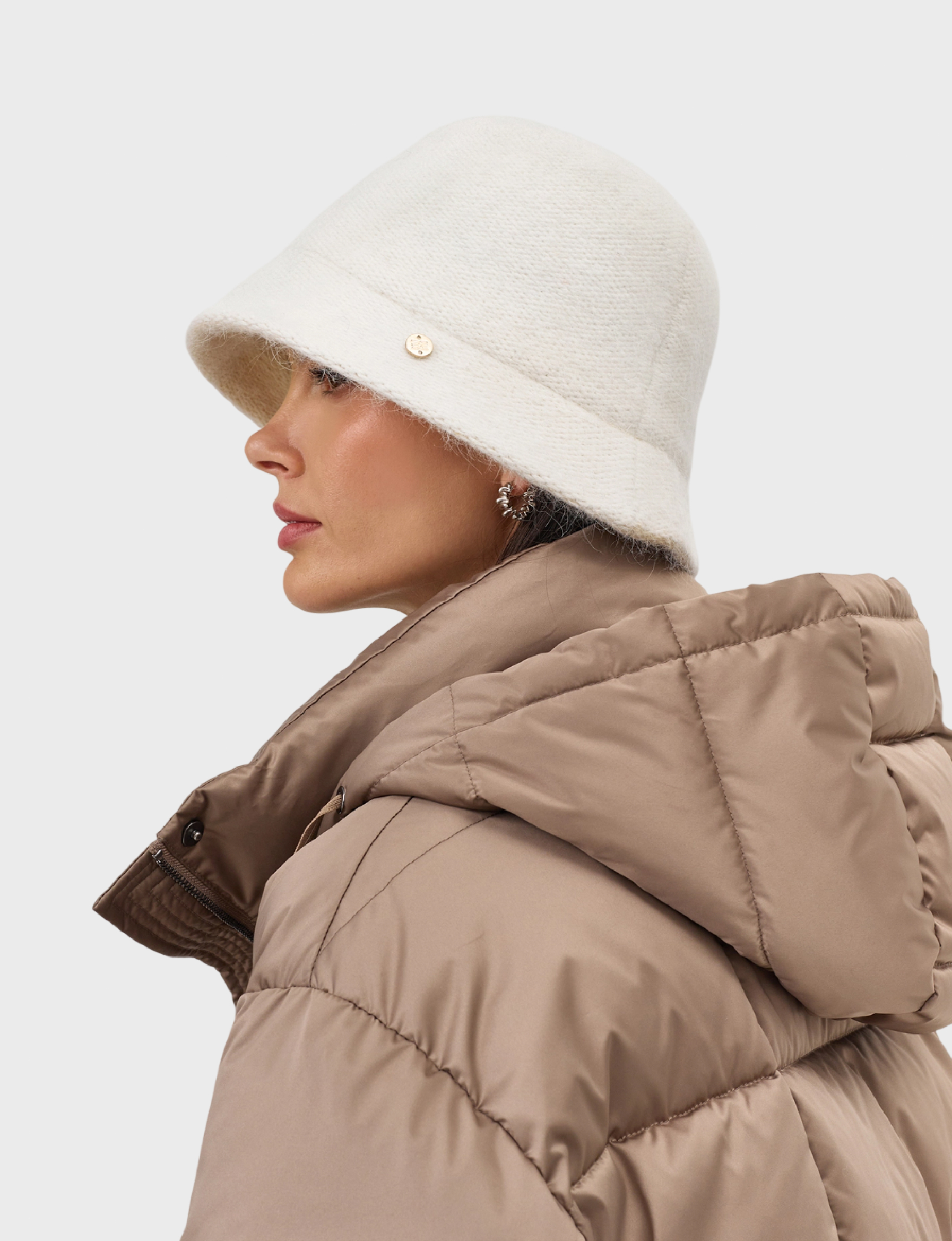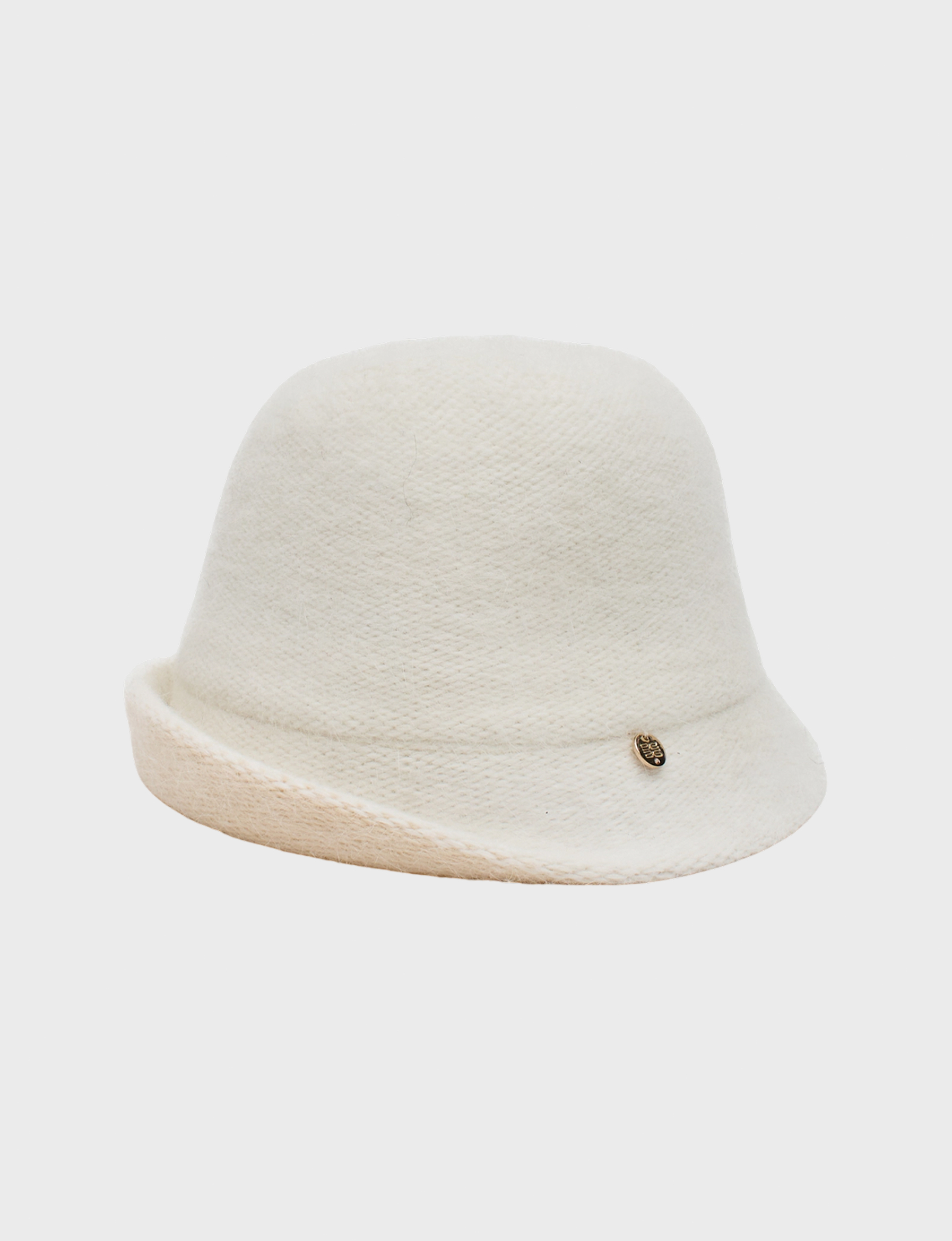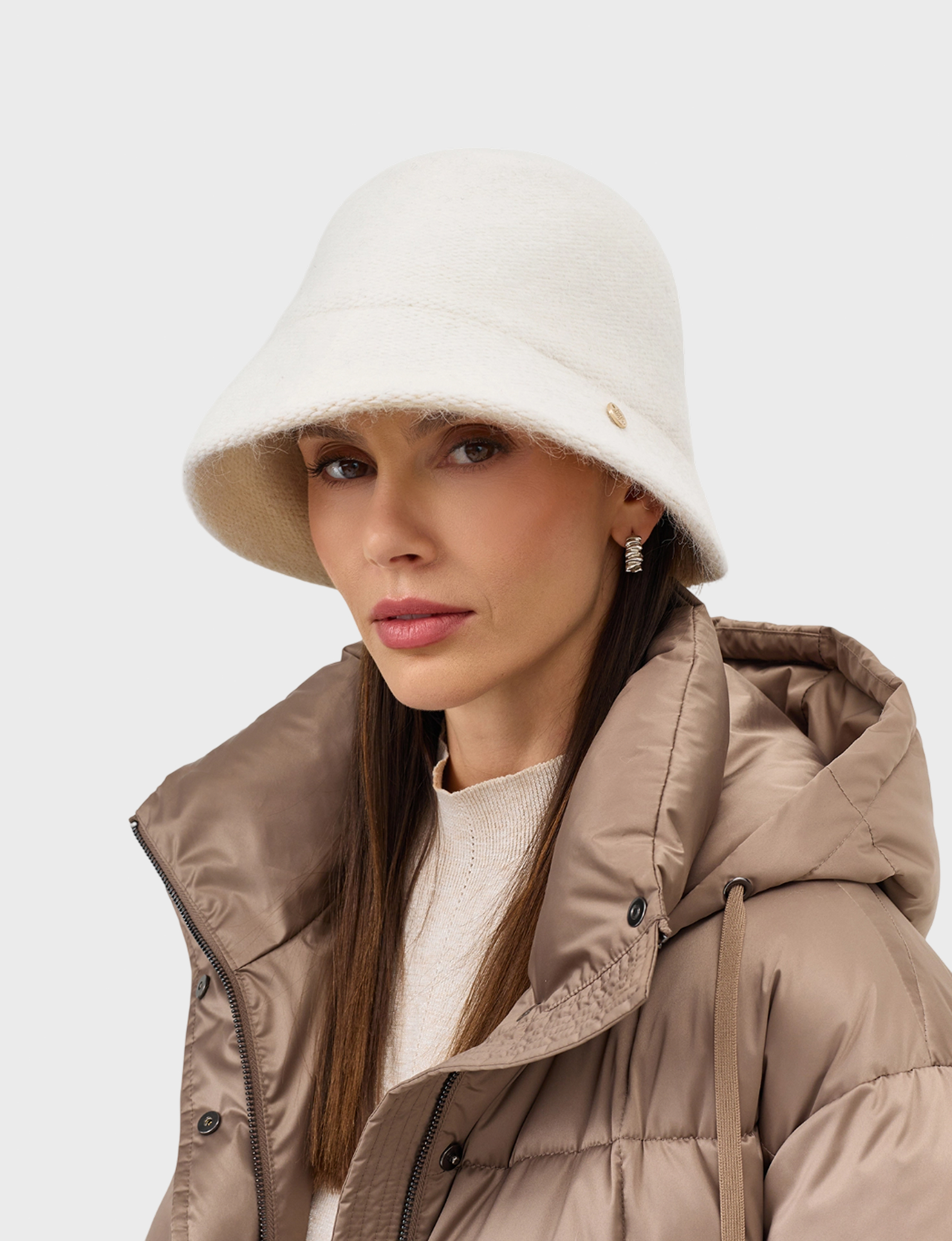 Вязаная шляпа с ангорой в составе. Риб по внутренней стороне для лучшей фиксации и регулировки размера. Узкие асимметричные поля с контрастным отворотом. Дополнена минималистичным металлическим брендированным шильдом.