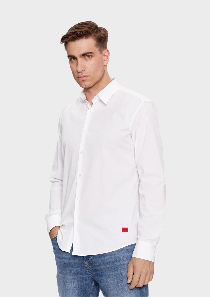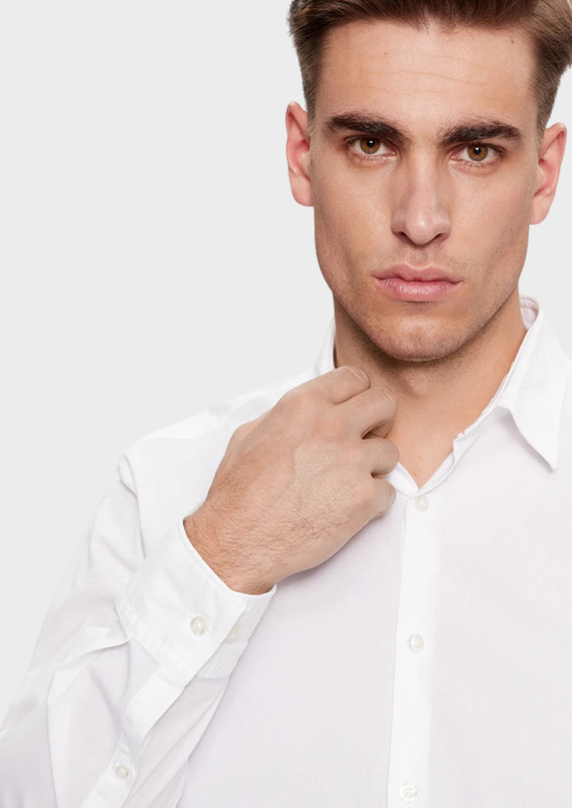 Сорочка с воротником «акула» и фигурной линией низа из слегка эластичного хлопка. Принадлежность модели бренду обозначена небольшим патчем фирменного алого оттенка.