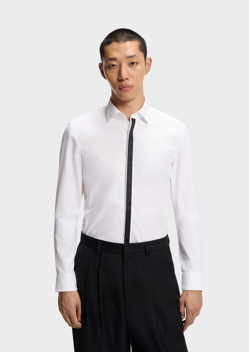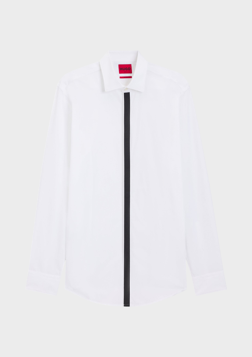 Рубашка HUGO из хлопкового поплина. Универсальная модель, которая органично впишется как в деловой гардероб, так и в вечерние образы. Отличается практичностью материала и продуманным дизайном.