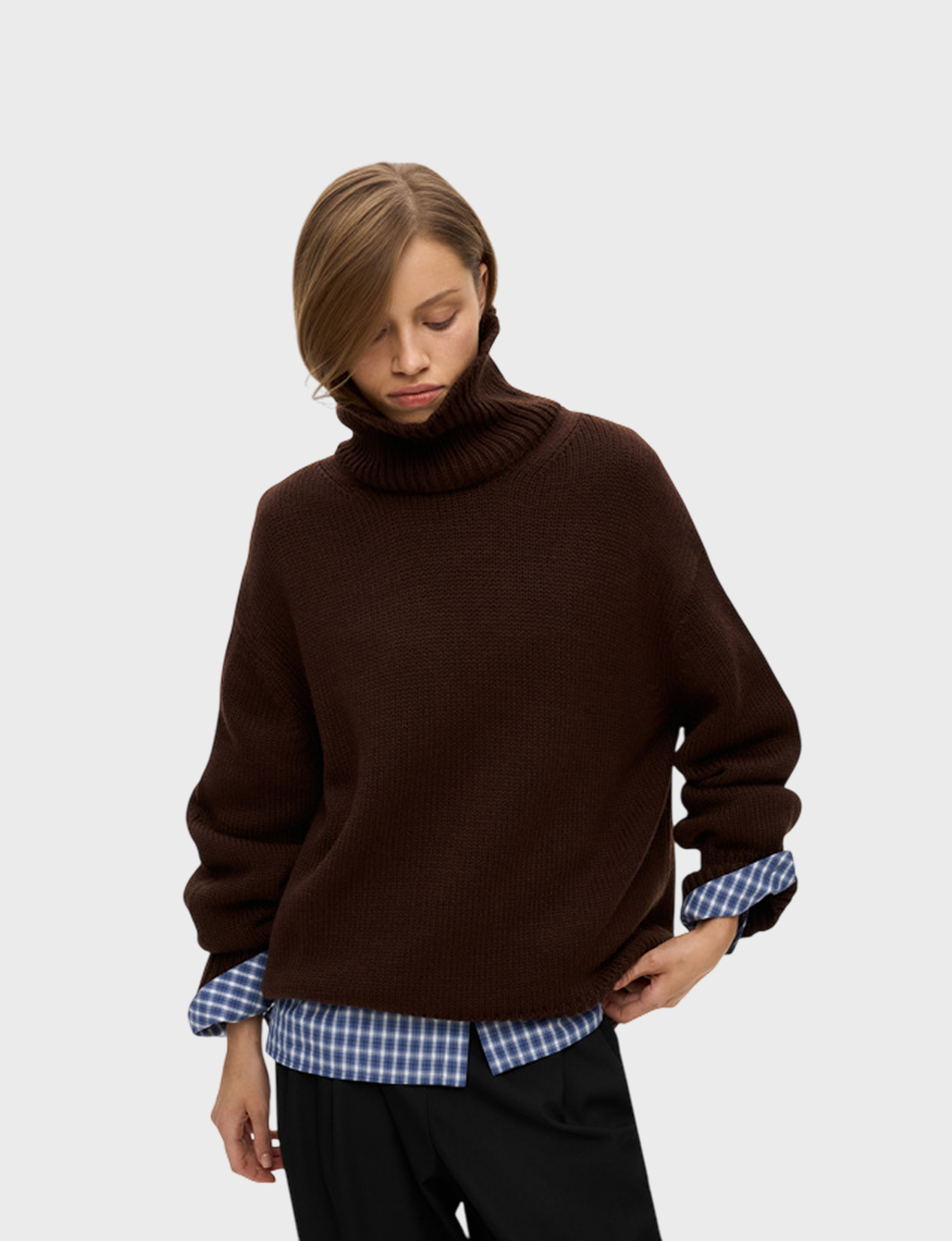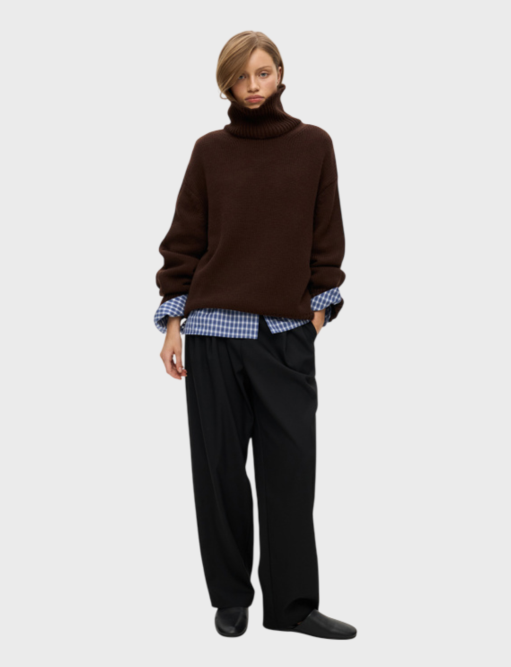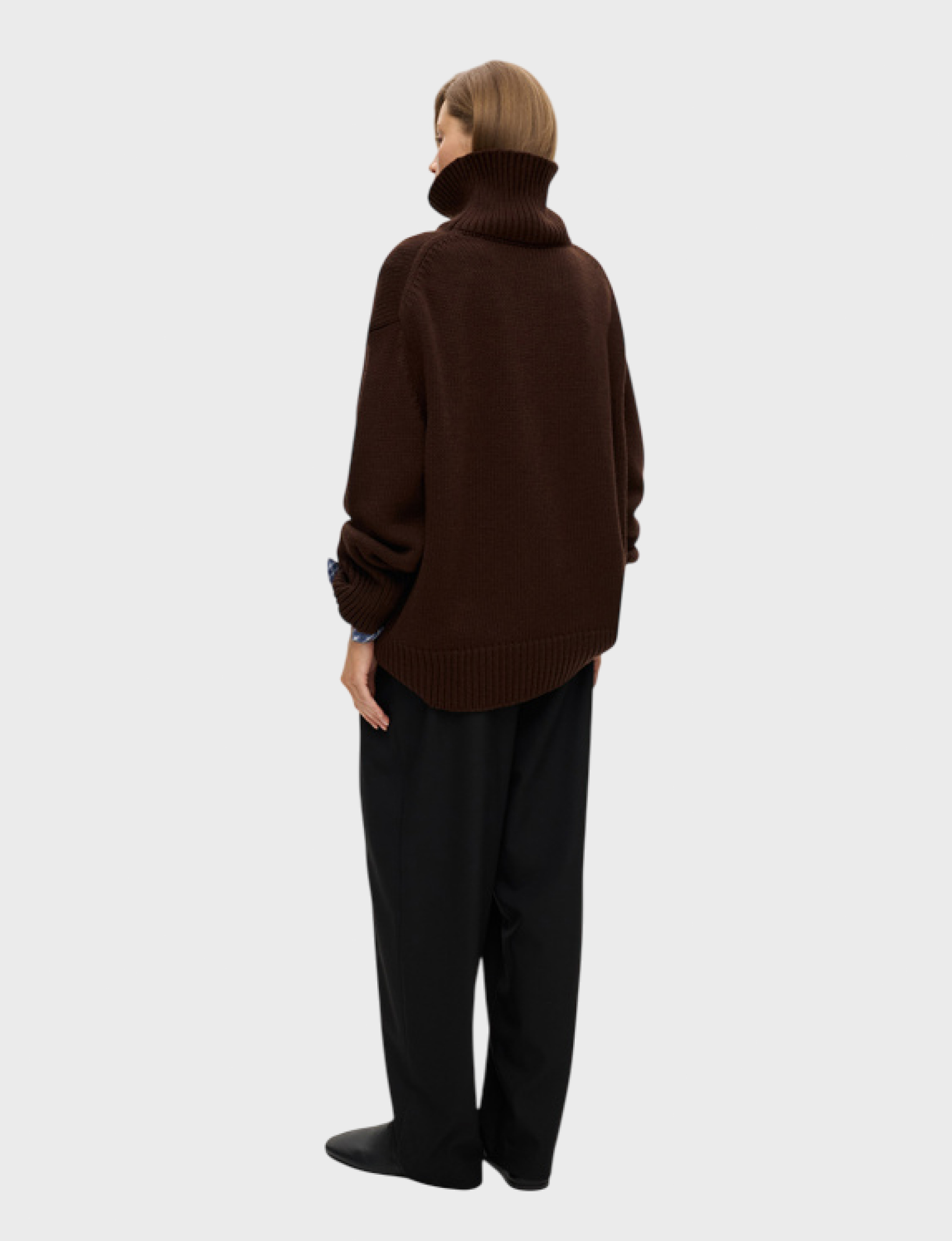 Свитер расслабленного силуэта из смесовой шерсти. Состав пряжи комфортен в носке и практичен в уходе. Благодаря составу изделие долго сохраняет первоначальный вид и цвет, свитер приятный и мягкий на ощупь. Модель свободного кроя, рукава длинные умеренного объема. Высокая мягкая горловина не сдавливает, её можно подворачивать. Низ рукавов и низ изделия оформлены манжетом-рибом. Свитер подойдет для повседневных образов, сочетайте его с брюками и юбками.
