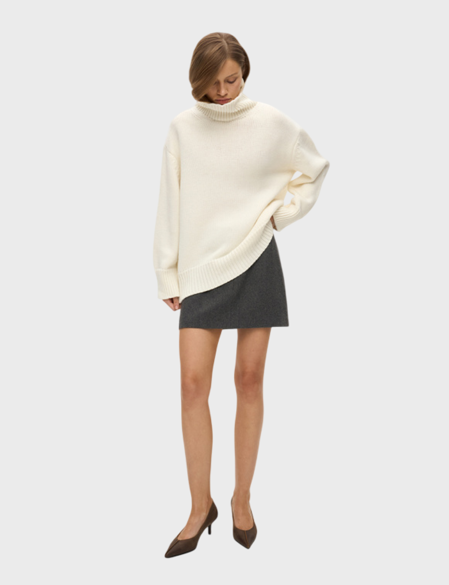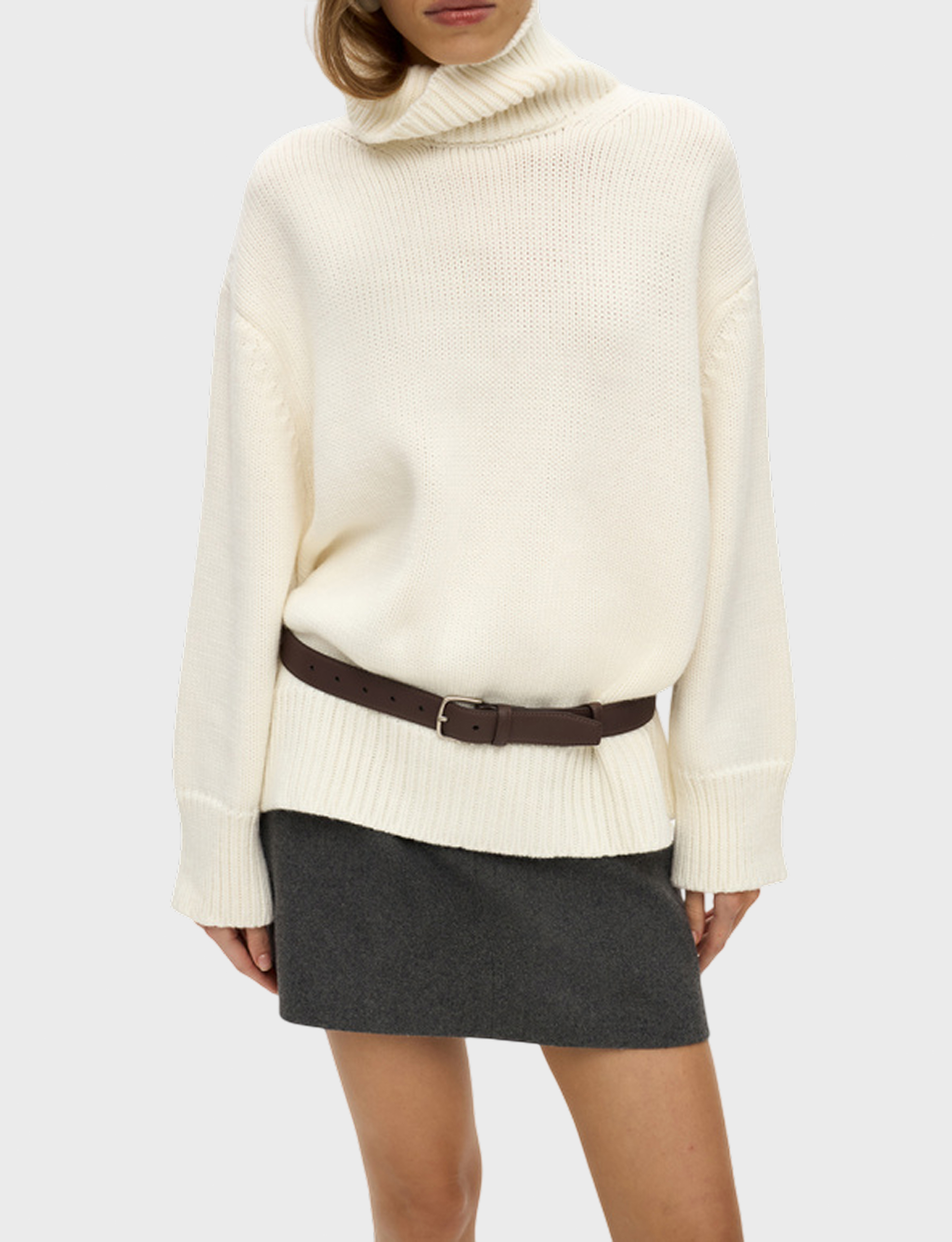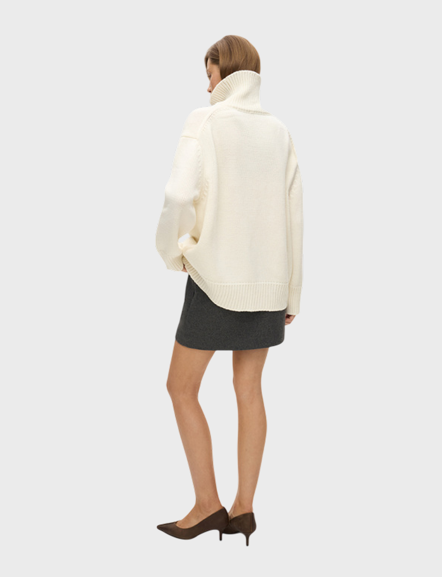 Свитер расслабленного силуэта из смесовой шерсти. Состав пряжи комфортен в носке и практичен в уходе. Благодаря составу изделие долго сохраняет первоначальный вид и цвет, свитер приятный и мягкий на ощупь. Модель свободного кроя, рукава длинные умеренного объема. Высокая мягкая горловина не сдавливает, её можно подворачивать. Низ рукавов и низ изделия оформлены манжетом-рибом. Свитер подойдет для повседневных образов, сочетайте его с брюками и юбками.