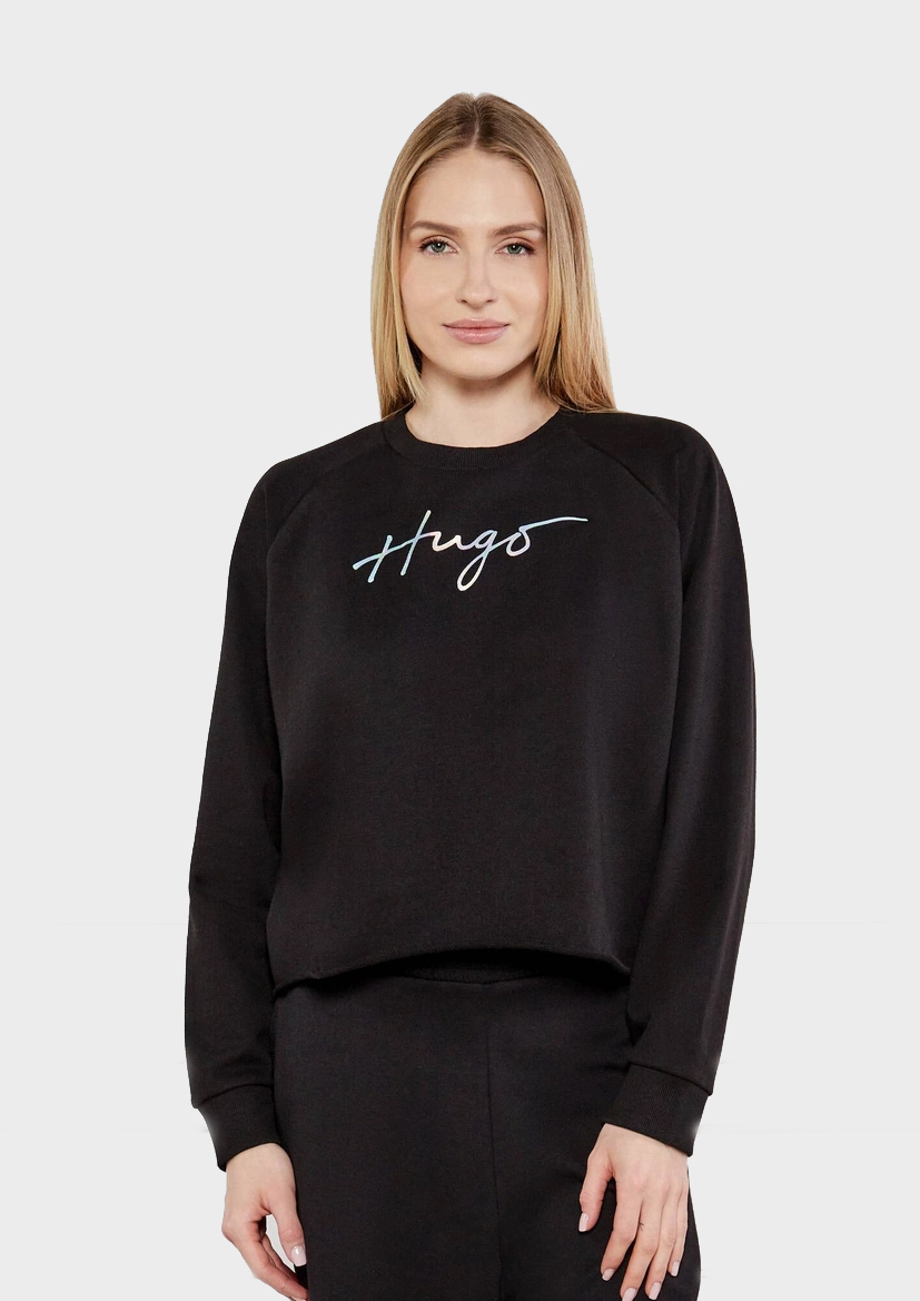Женский свитшот HUGO черного цвета из 100%-го хлопка – это сочетание комфорта и стильного внешнего вида. Идеально подходит как для повседневных образов, так и в качестве базового элемента гардероба.