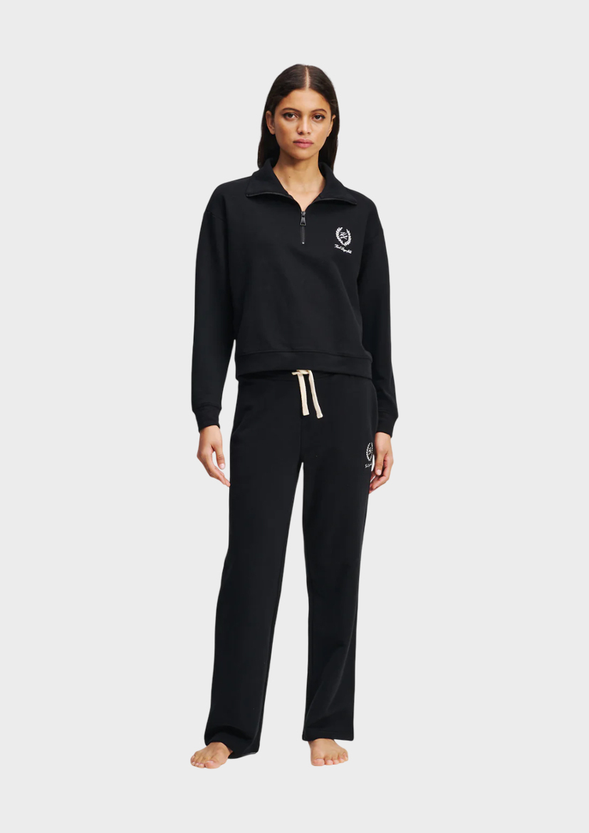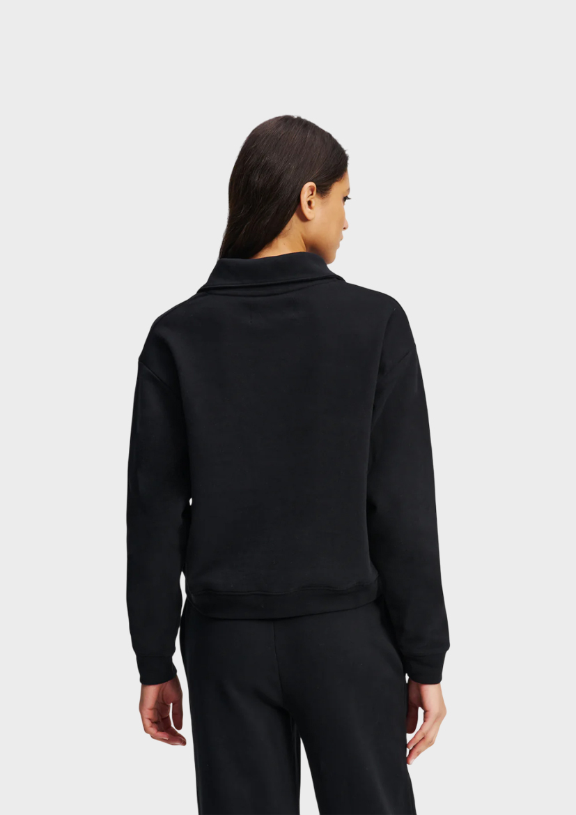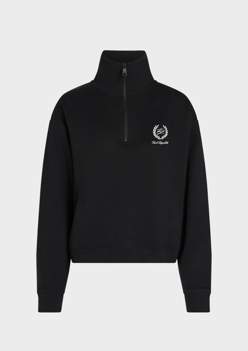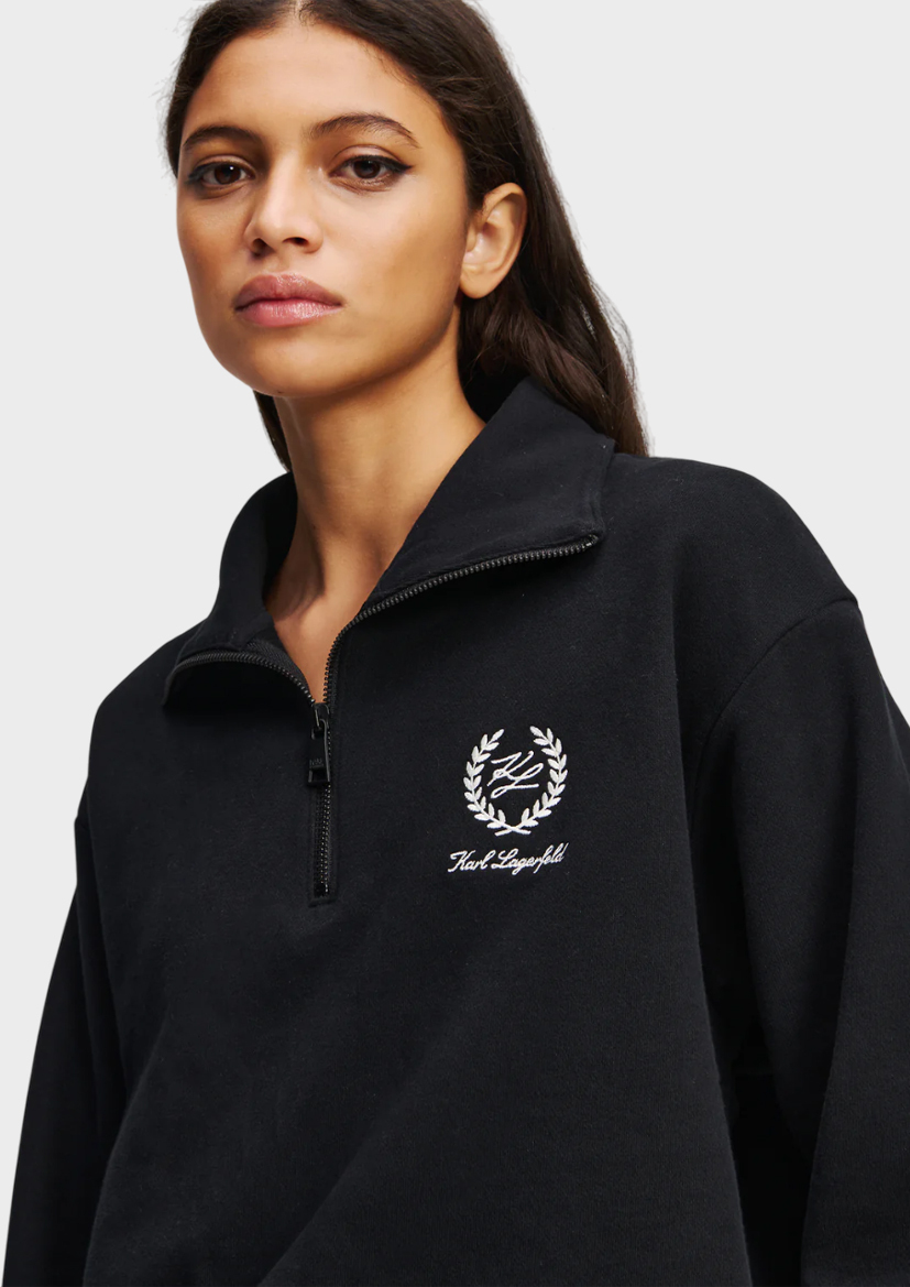 Свитшот Karl Lagerfeld из 100% хлопка — комфортная и стильная базовая вещь на каждый день. Модель с воротником на молнии оформлена вышивкой в виде логотипа бренда, обрамлённого лавровым венком, что придаёт образу спортивную элегантность. Прямой крой и мягкий трикотаж делают изделие удобным как для активного отдыха, так и для городского casual-лука.