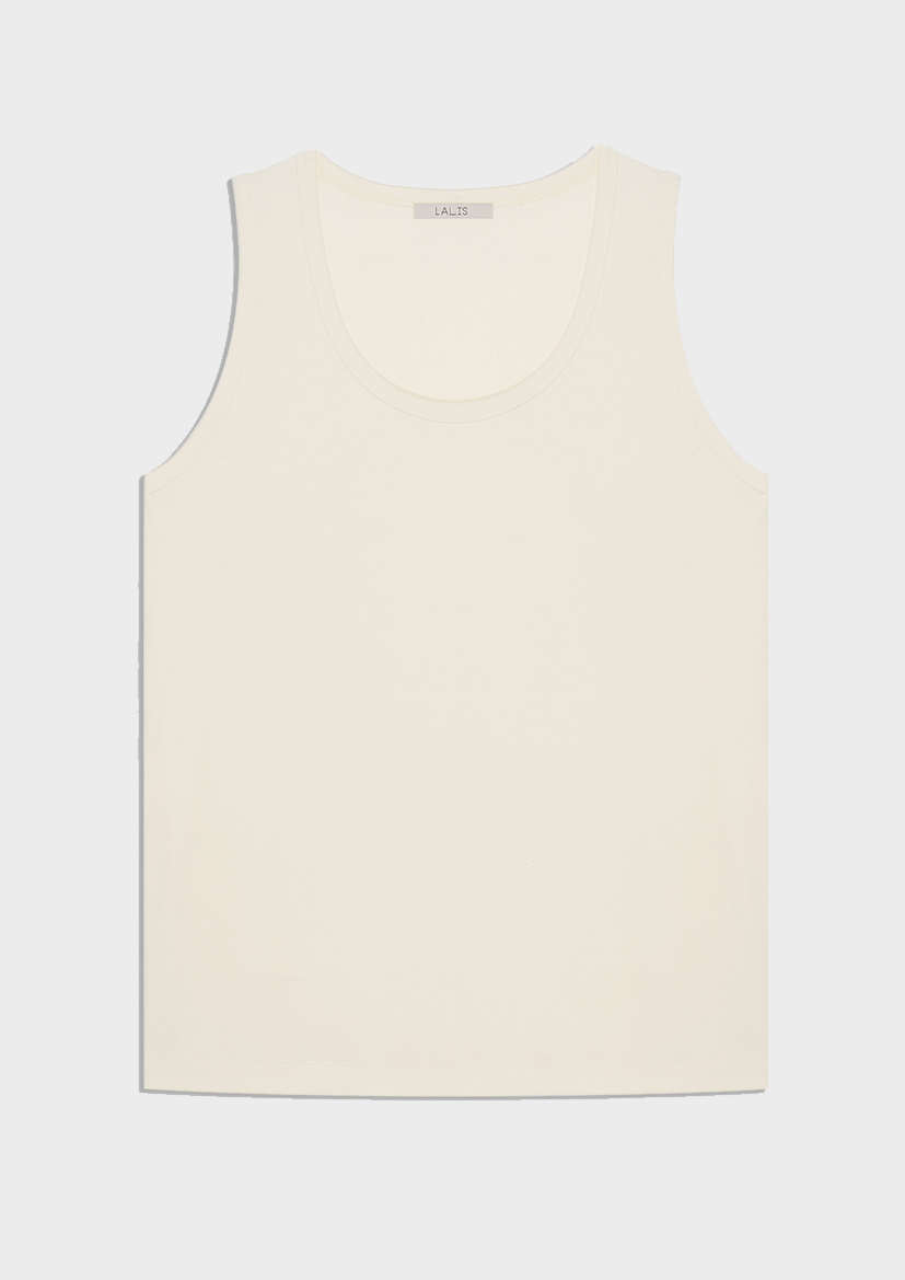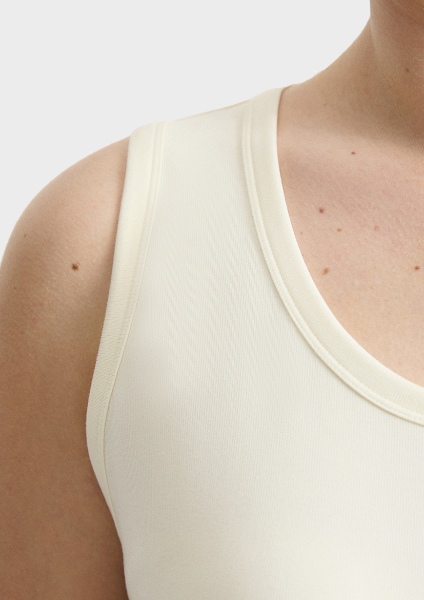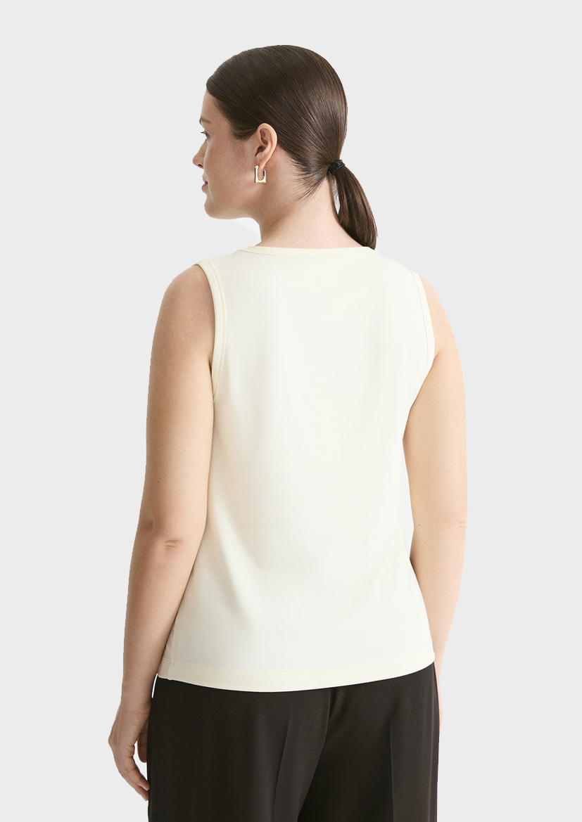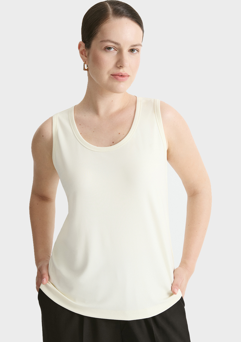 Базовый топ - незаменимая вещь для каждого сезона. Модель с круглым вырезом, без рукава, комфортного облегания, длиной до середины бедра.