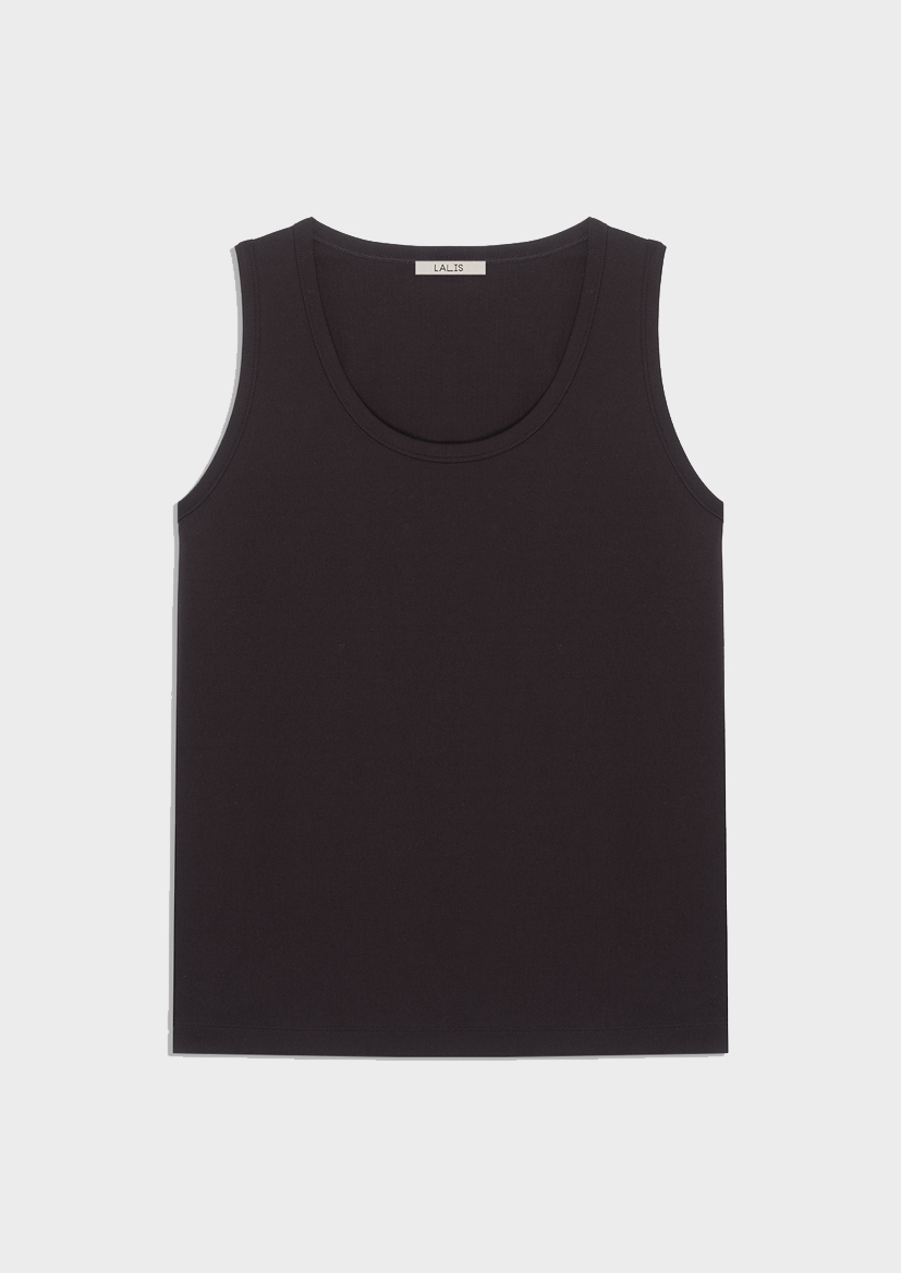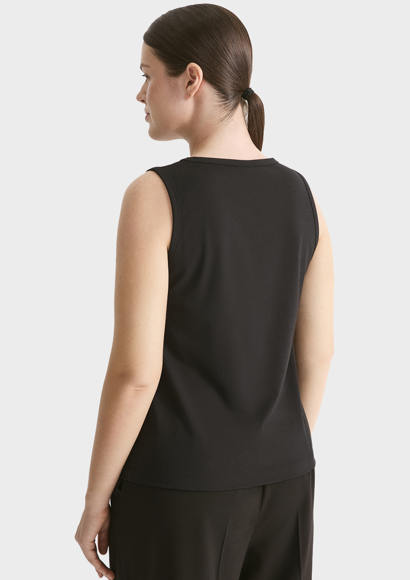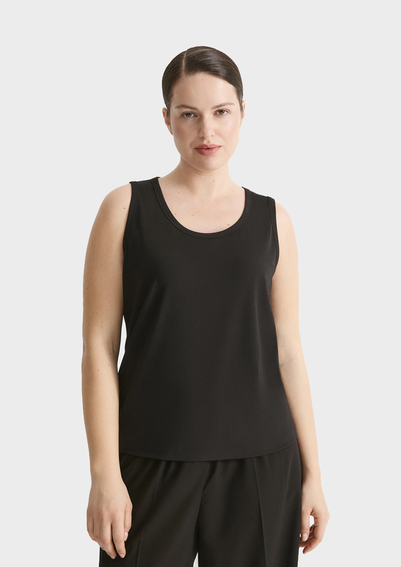 Базовый топ - незаменимая вещь для каждого сезона. Модель с круглым вырезом, без рукава, комфортного облегания, длиной до середины бедра.