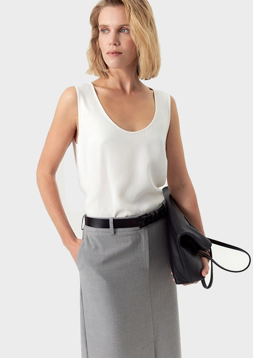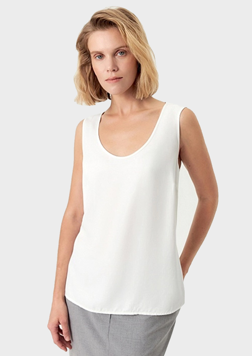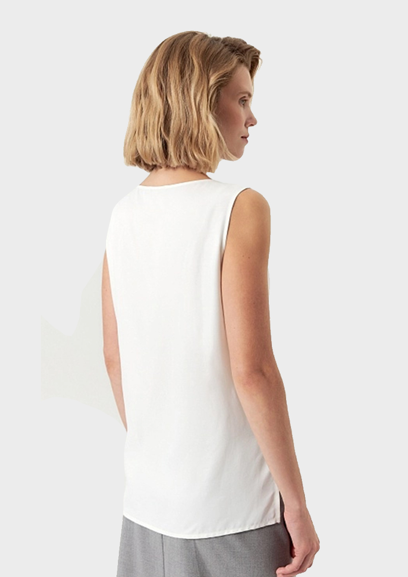 Лаконичный белый топ - универсальная база для стильных образов в любое время года. Изделие выполнено из 100% итальянской вискозы — мягкой, дышащей ткани с деликатным блеском. Аккуратные бретели и глубокий круглый вырез мягко подчеркивает линию плеч и декольте, придавая образу женственности. Минималистичный крой дополнен аккуратными разрезами по бокам для комфортной посадки и свободы движений.