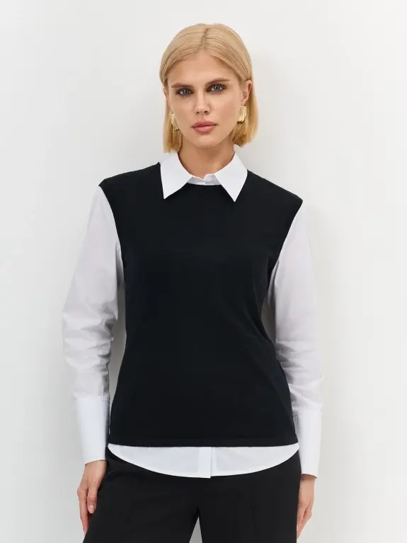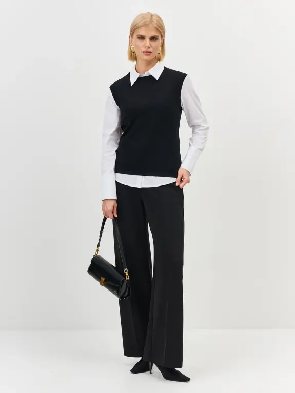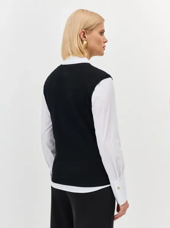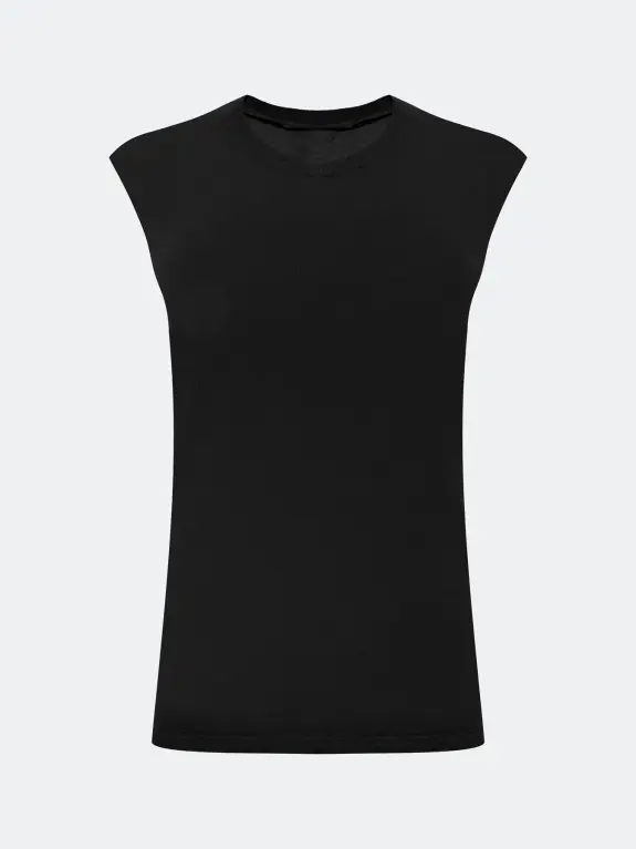 Вязаный топ из нежной пряжи с тенселем и шелком в составе. Прямой силуэт. Круглый вырез. Спущенная линия плеч. Деликатная вышивка на спинке.