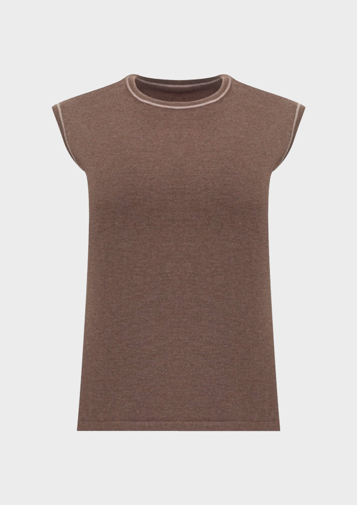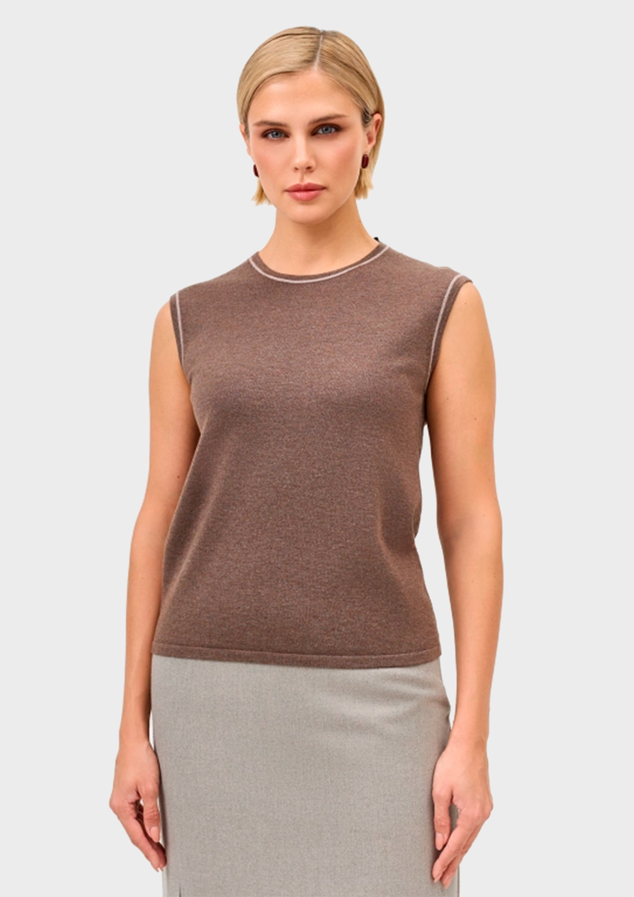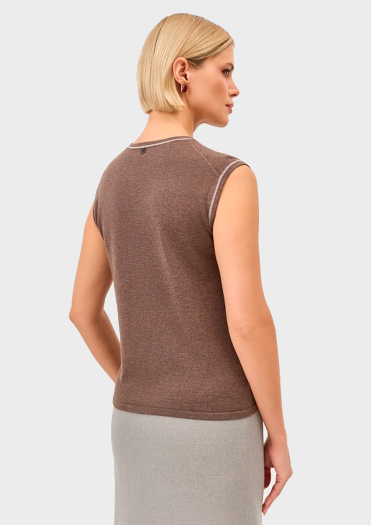 Вязаный топ с контрастной отделкой по краю рукавов и горловине. Прямой силуэт. Круглый вырез. Спущенное плечо. В составе тенсель, шерсть и шелк.