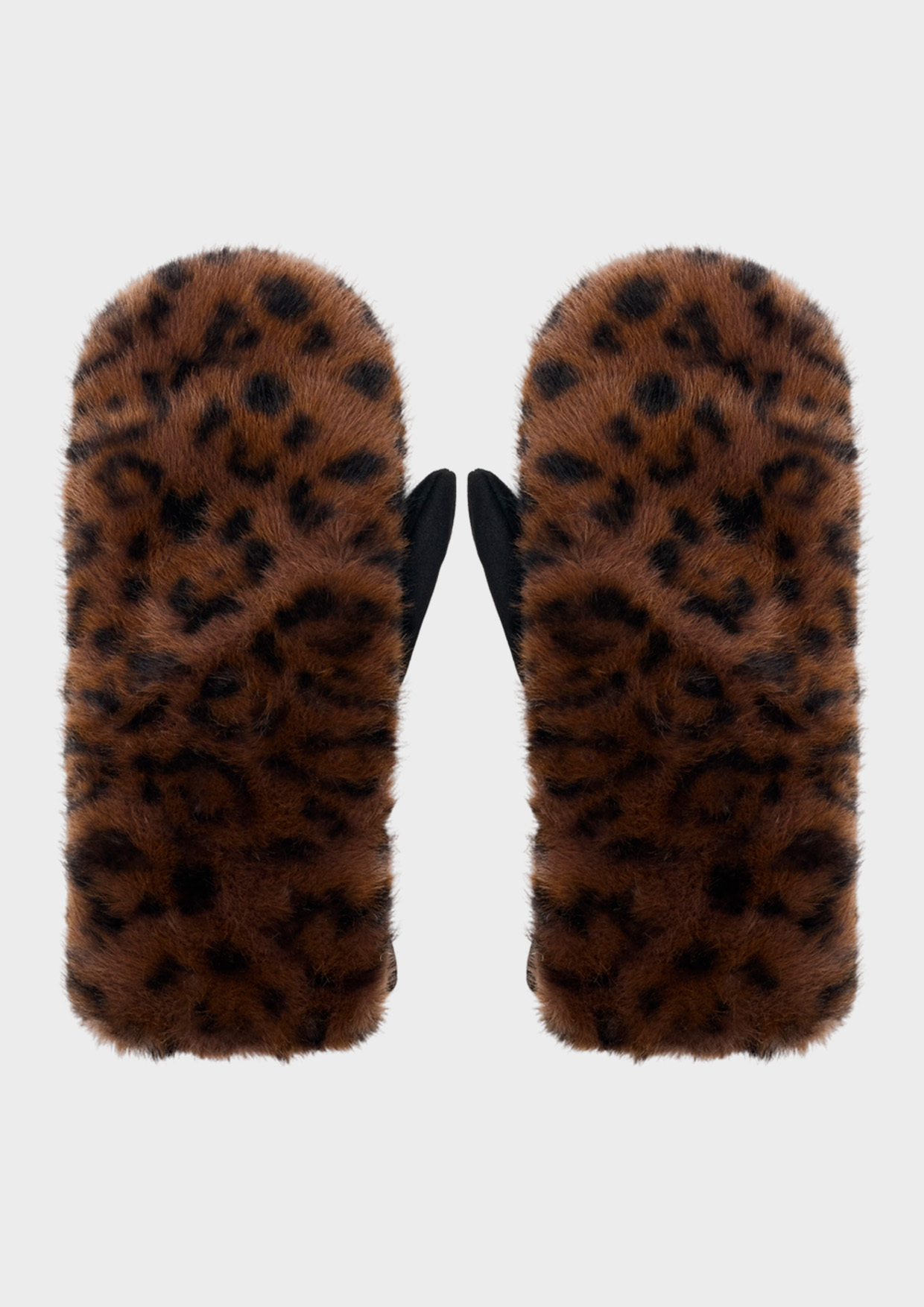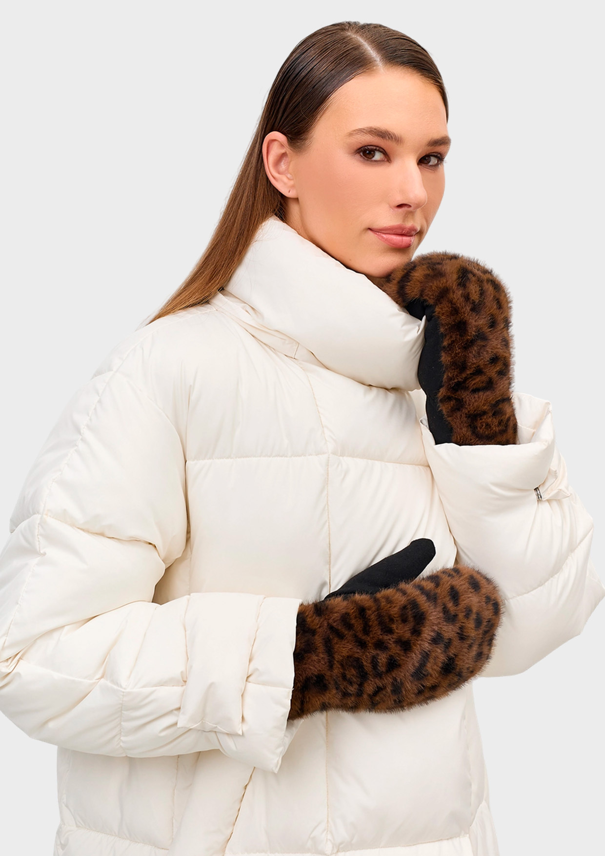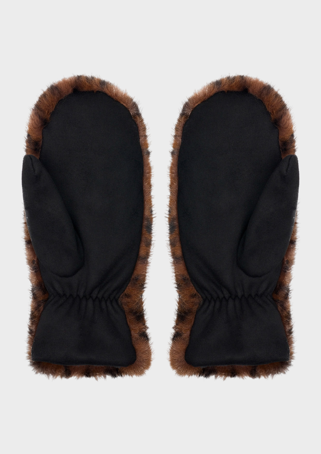 Меховые варежки с анималистичным принтом. Тыльная сторона из меха, ладонь- из текстильной замши. Теплая ворсовая текстильная подкладка. Плотно держатся на руке благодаря резинке с внутренней стороны.