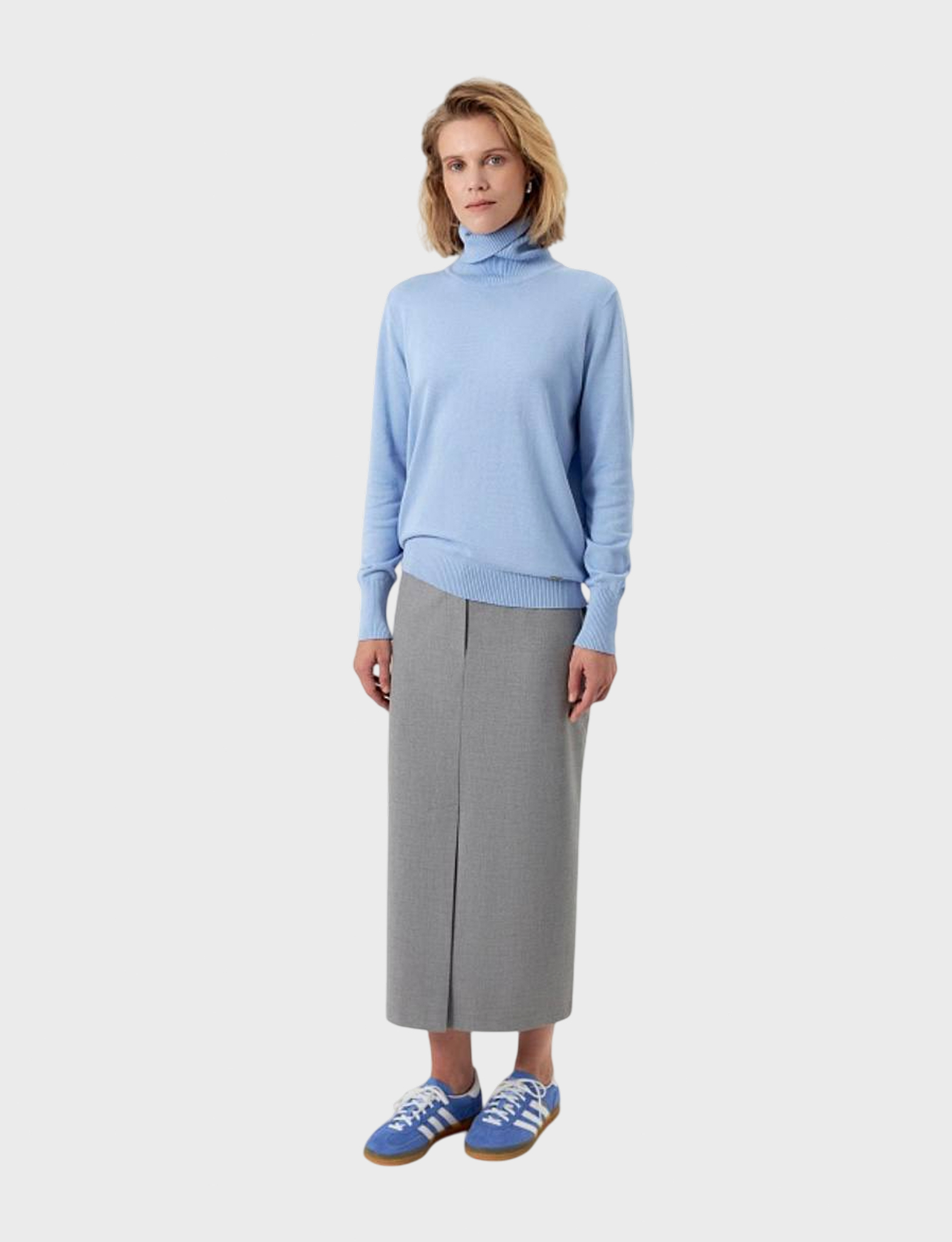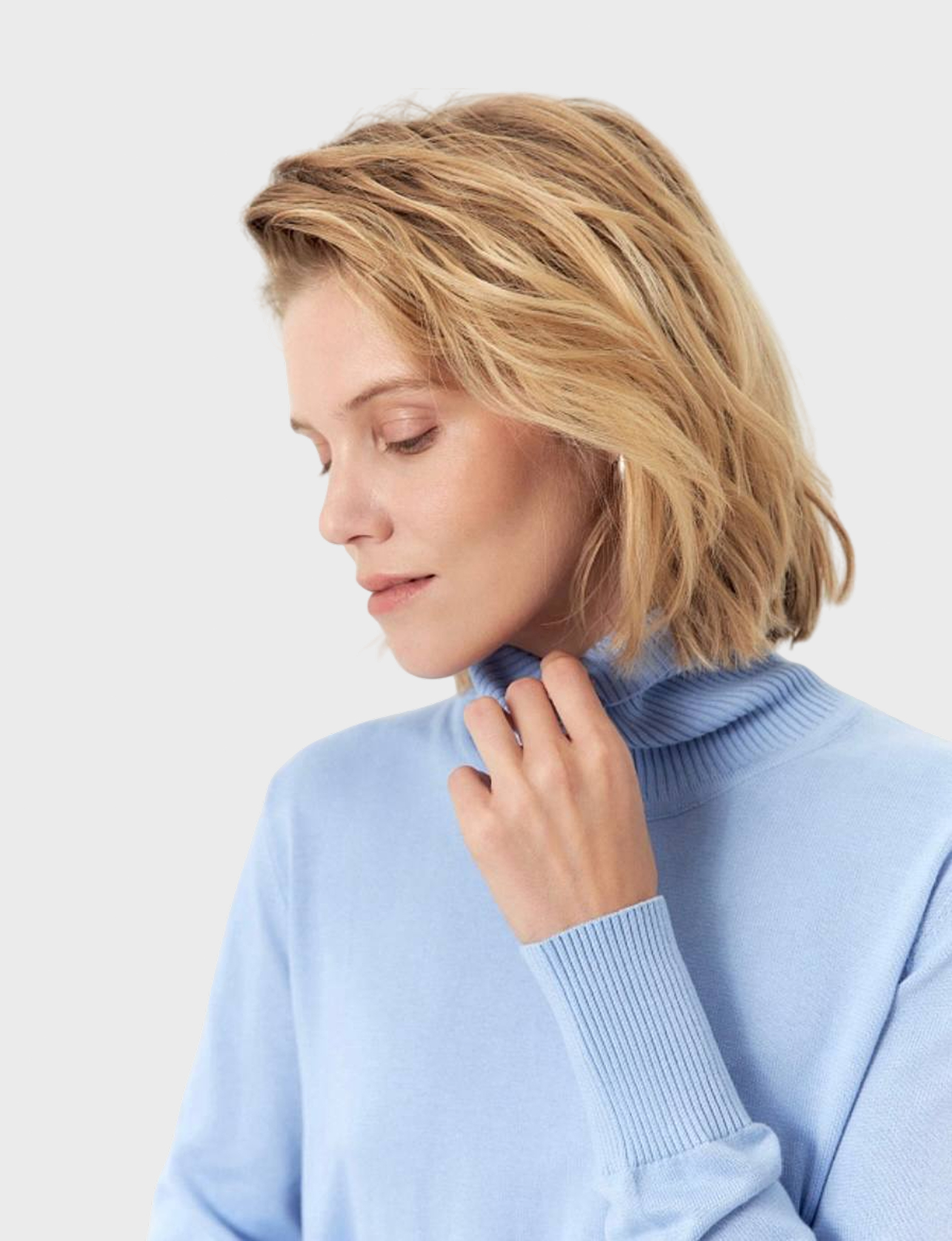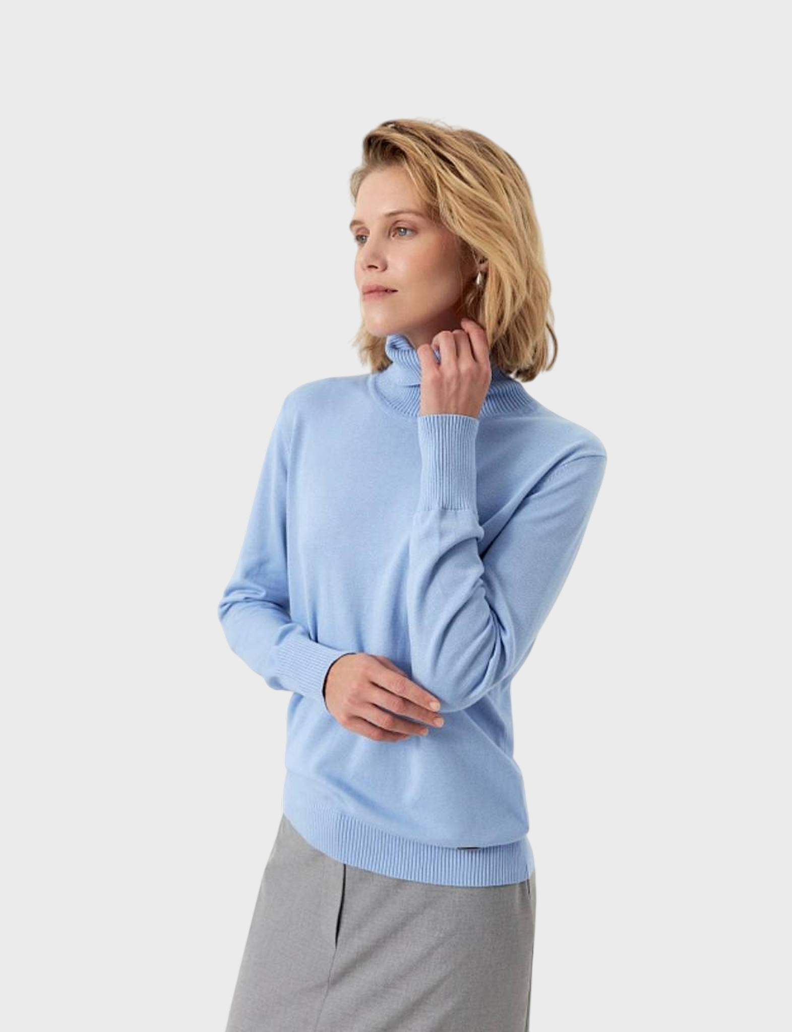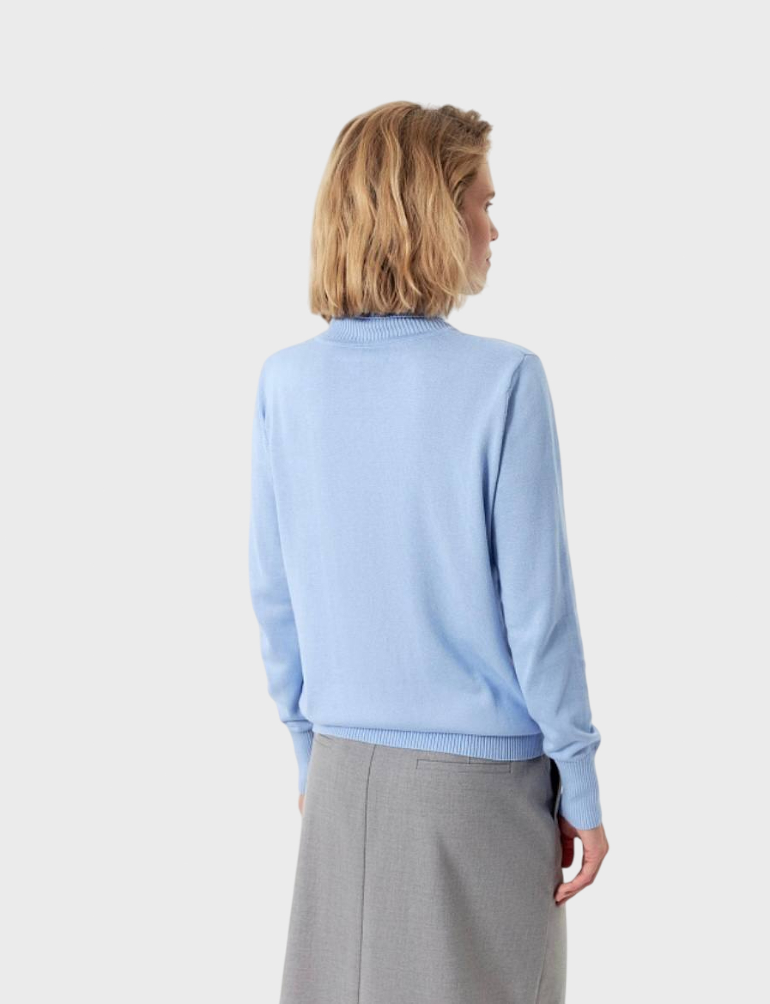 Базовый джемпер голубого цвета свободного кроя. Отлично сочетается с кардиганами, рубашками, жакетами.