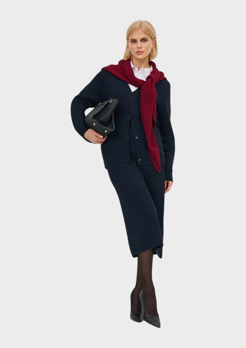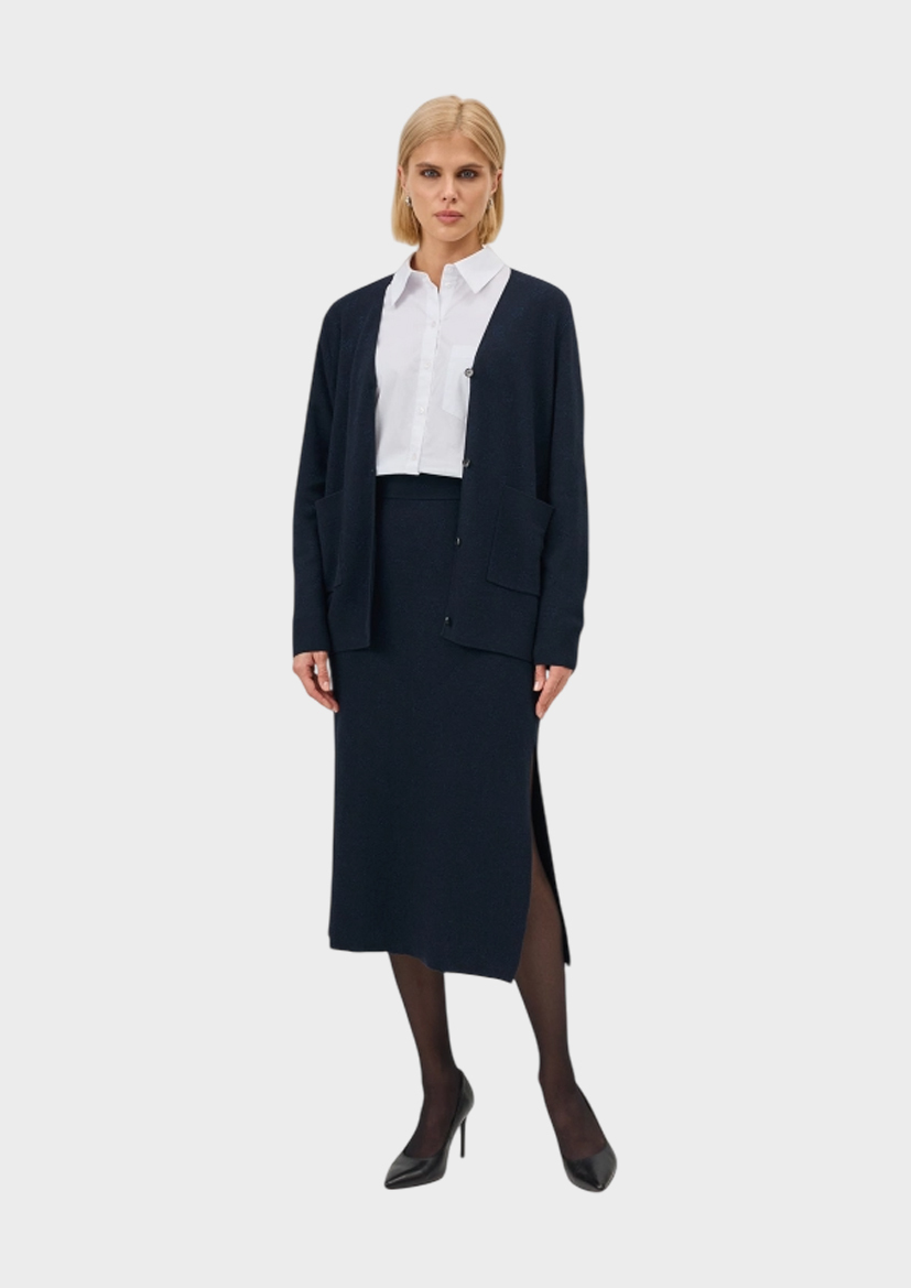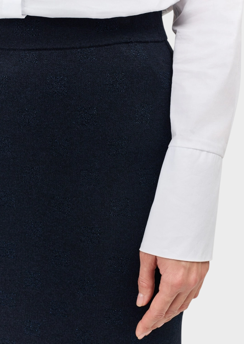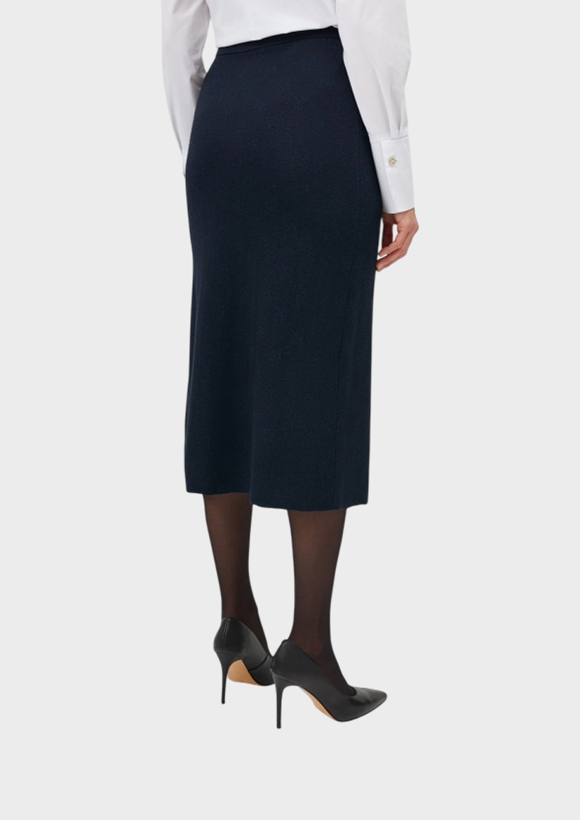 Жакардовая вязаная юбка с блеском. Прямой силуэт. Длина миди. Резинка по линии талии. Высокий разрез в боковом шве. В составе вискоза и шерсть.