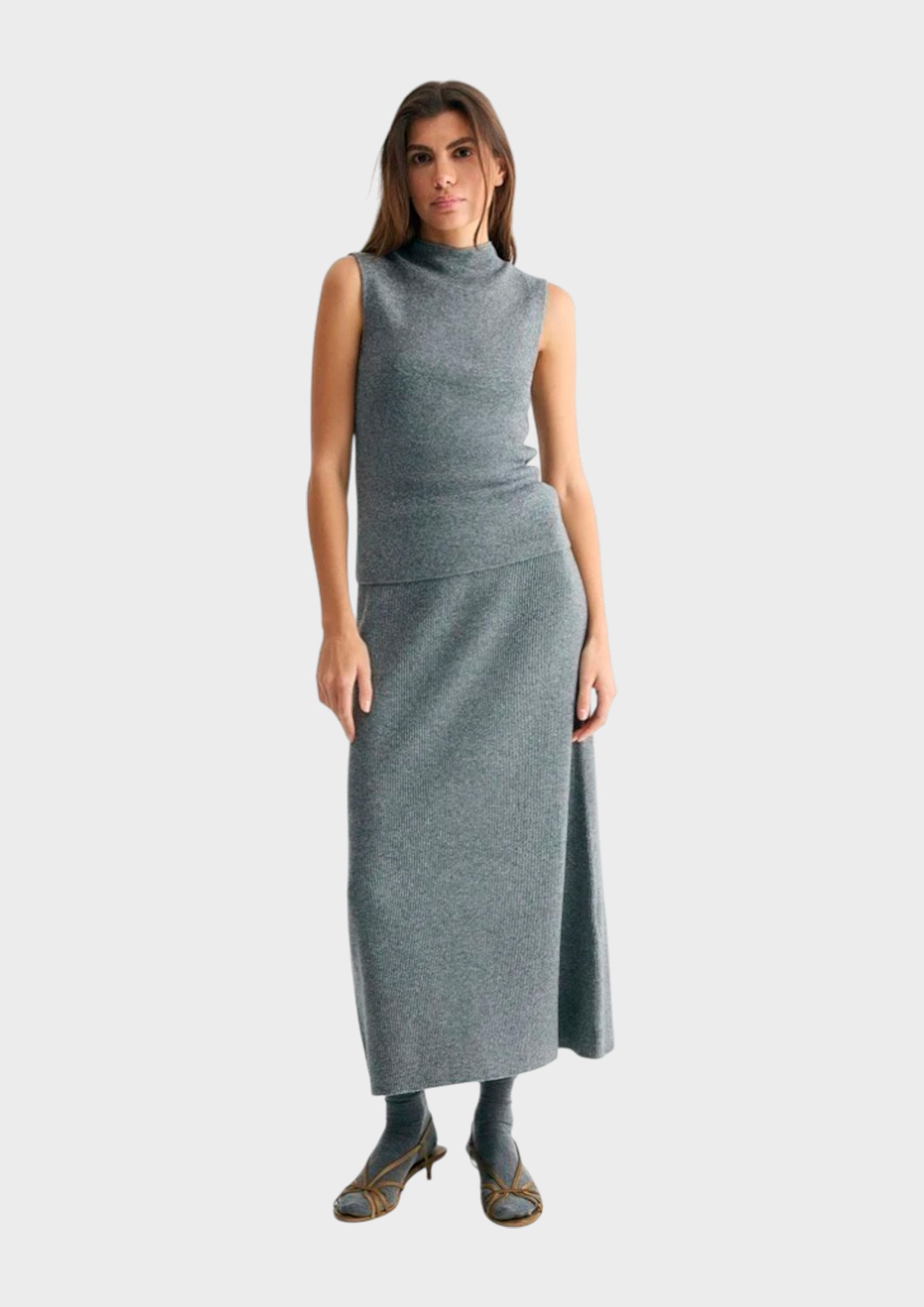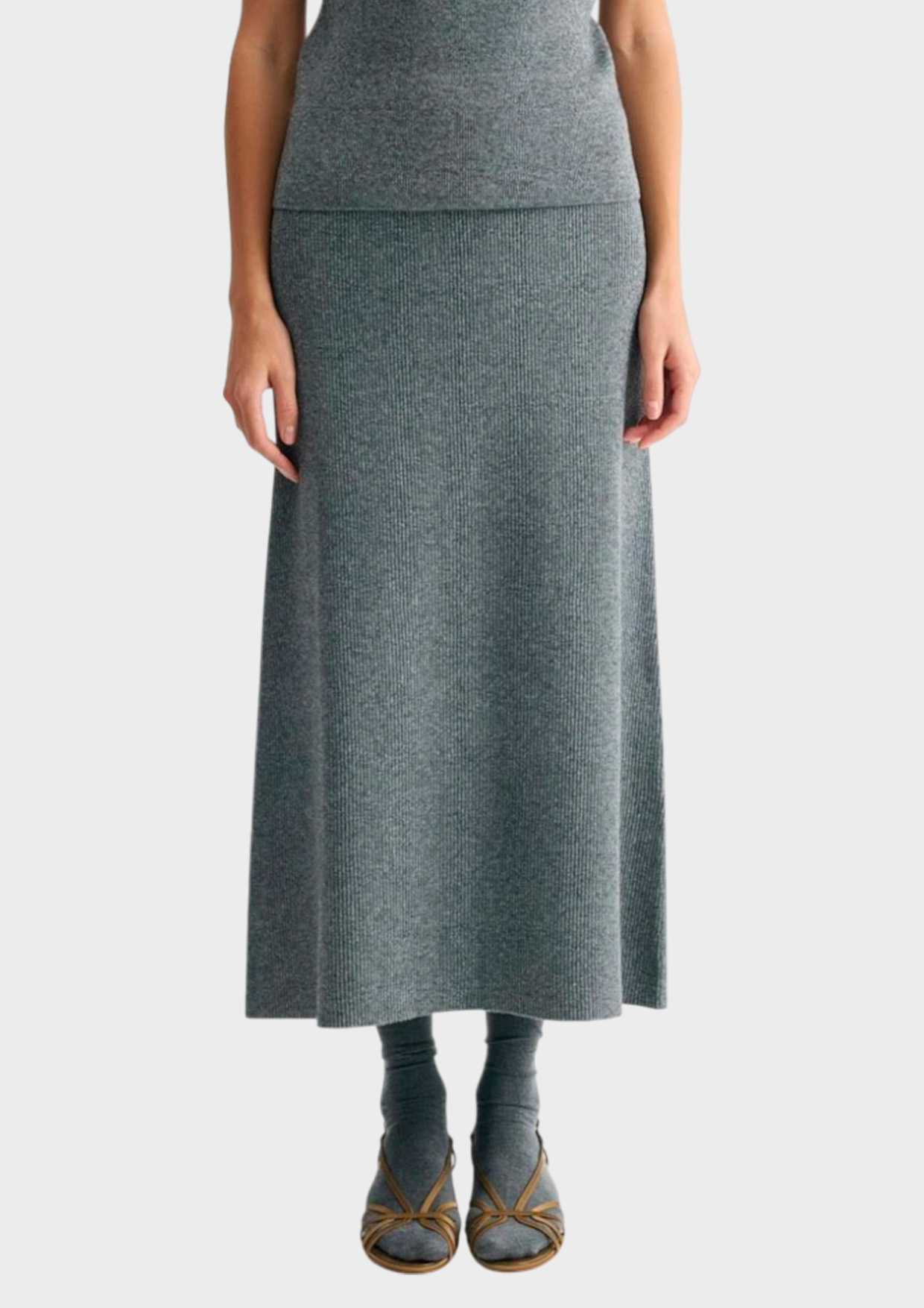 Юбка силуэта трапеция с посадкой на линии талии. Модель делает образ визуально легким, но при этом комфортным для непогоды.
