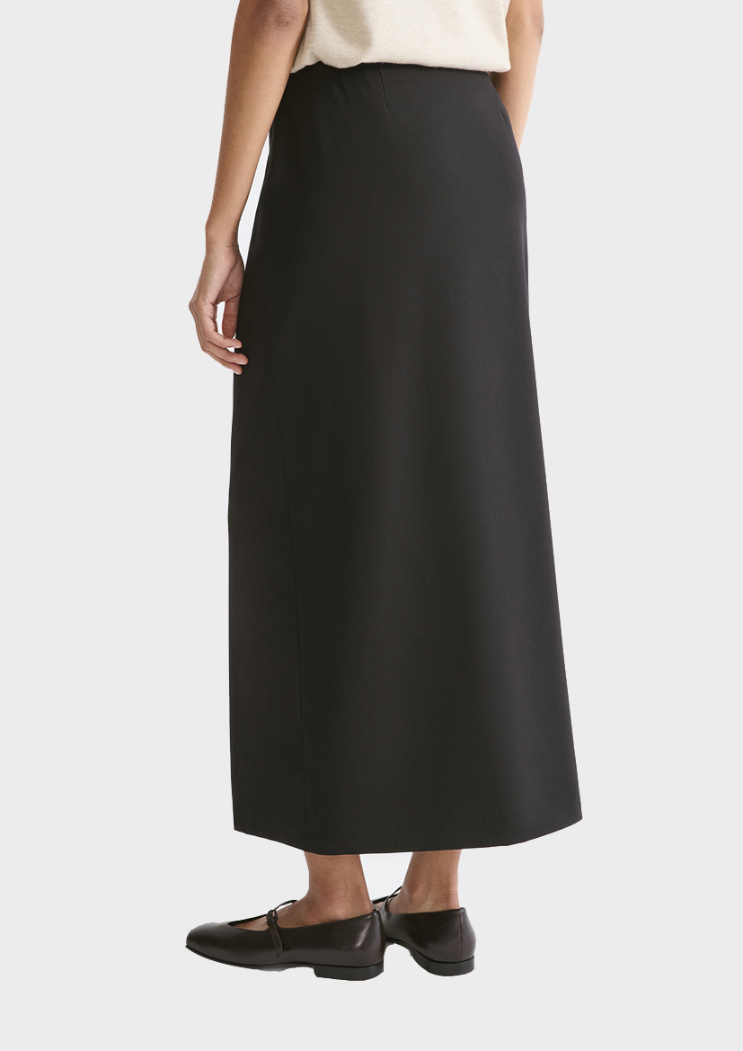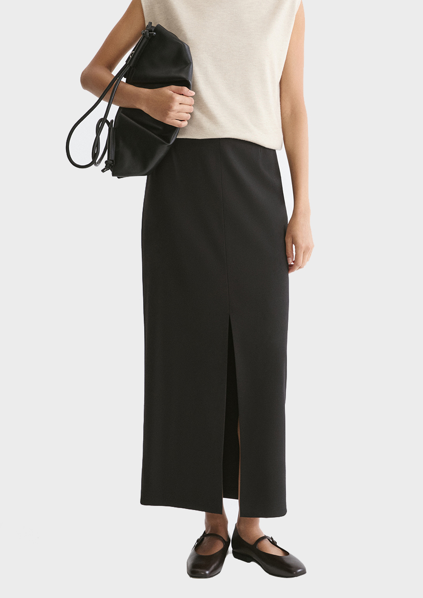 Черная юбка с эффектным разрезом - удобная модель для повседневных и вечерних выходов. Минималистичный силуэт и длина миди делают ее идеальным компаньоном для верха в любом стиле.