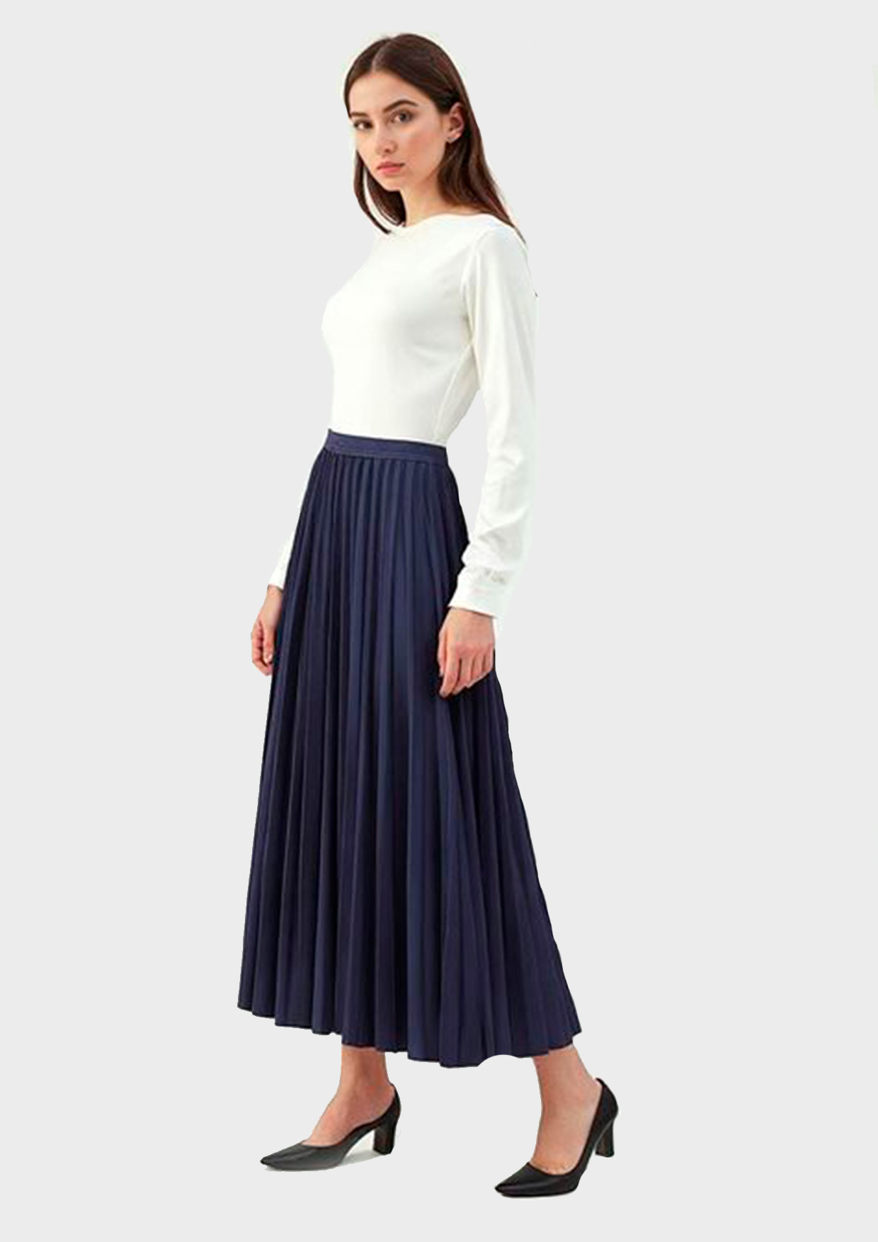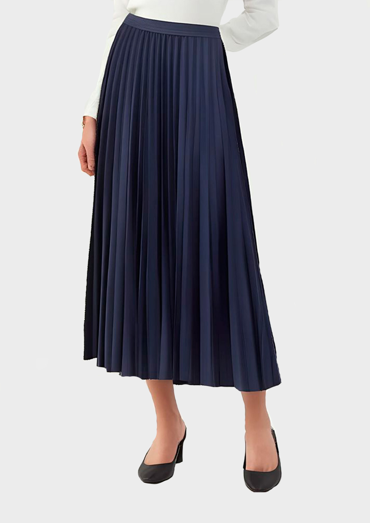 Юбка длины миди со свободным силуэтом и нежными складками подчеркивает фигуру, даря свободу движений и уверенность в себе. Темно-синяя гамма подходит к любому верху, превращая образ в стильное завершение вашего гардероба.