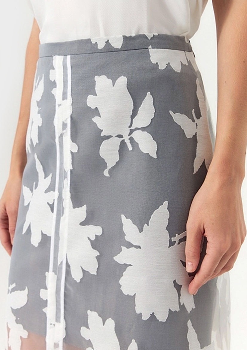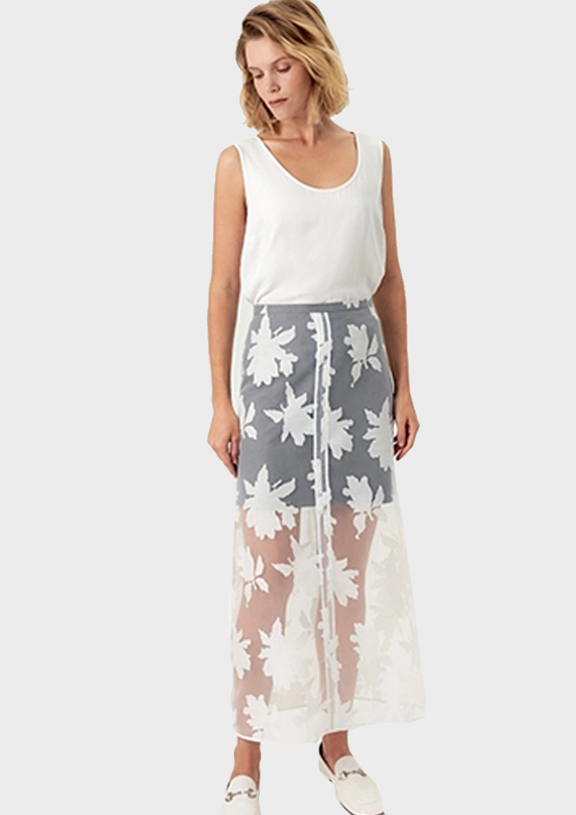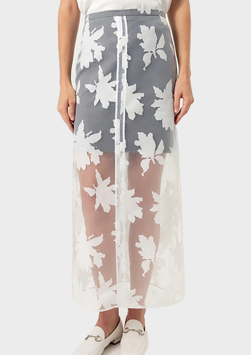Двуслойная юбка с цветочным узором тонко воплощает ключевые тренды сезона — многослойность и игру с прозрачностью. Контраст фактур и длины придаёт модели современное звучание и подчёркивает изысканность образа.