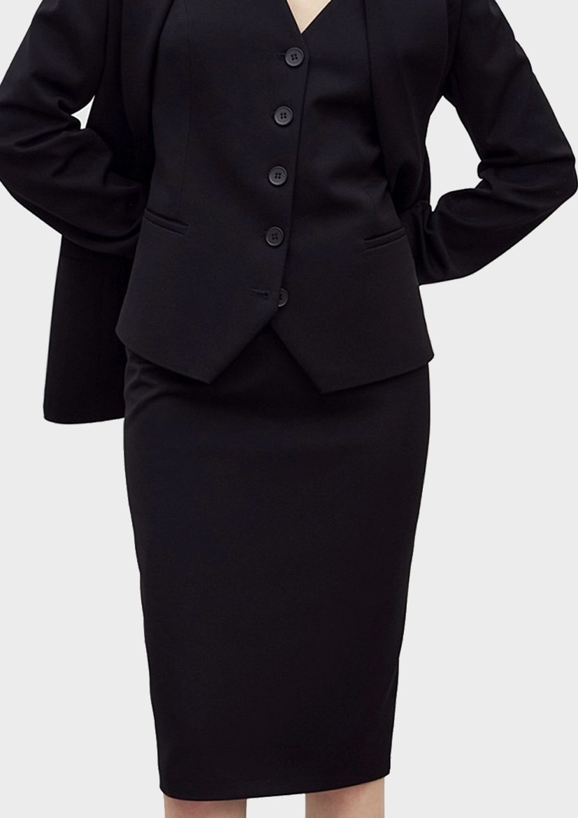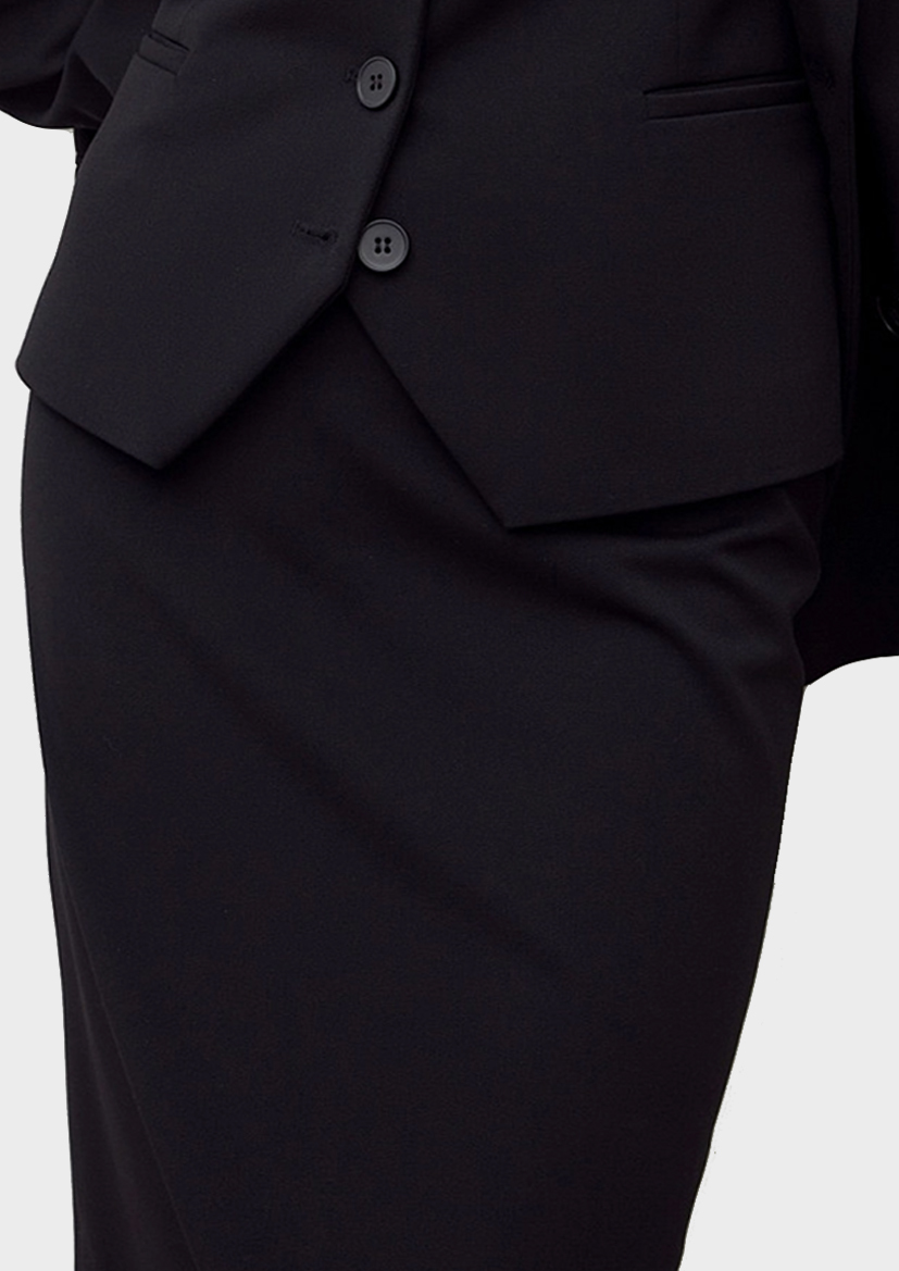 Юбка на притачном поясе полуприлегающего силуэта из костюмной ткани в черном цвете, очень элегантной длины, прикрывающей колено. Застежка сзади на потайную молнию.