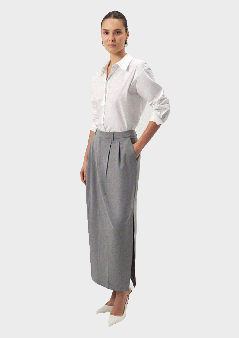 Пояс со шлёвками аккуратно акцентирует талию и позволяет дополнять образ ремнём. Талиевые вытачки формируют безупречную посадку, а высокие разрезы по бокам добавляют динамичности и свободы движения. Функциональные боковые карманы добавляют практичности, а декоративные карманы-листочки на спинке отсылают к эстетике классических брюк, завершая общий дизайн изделия.