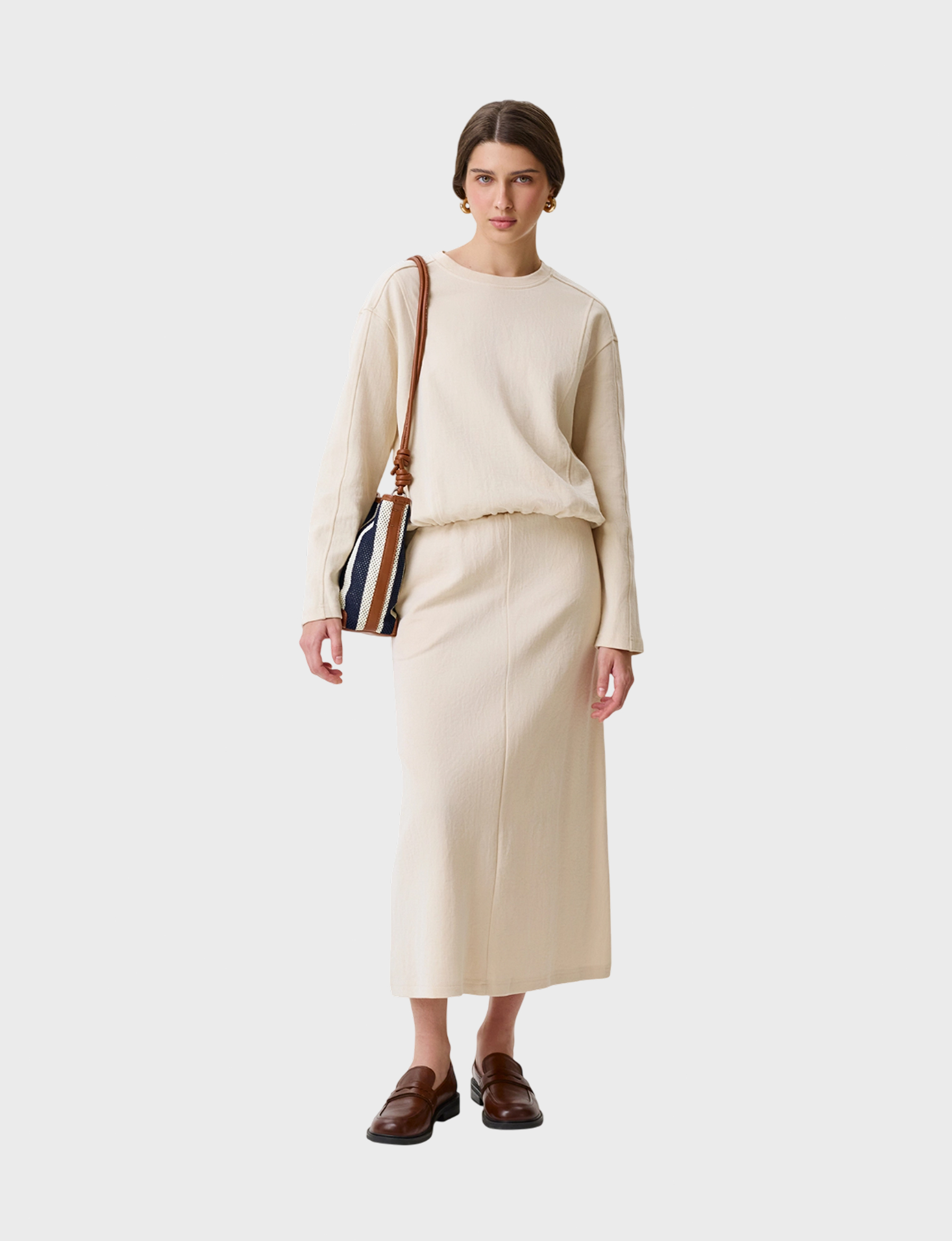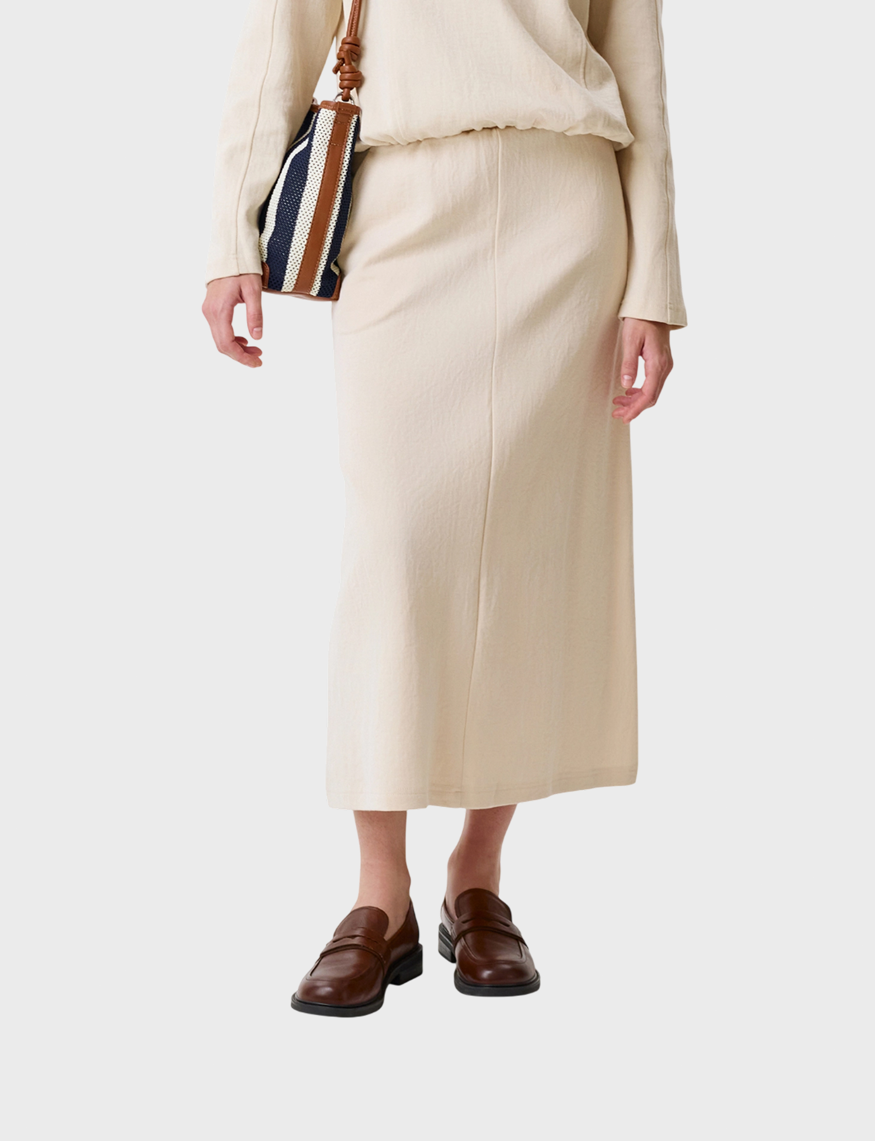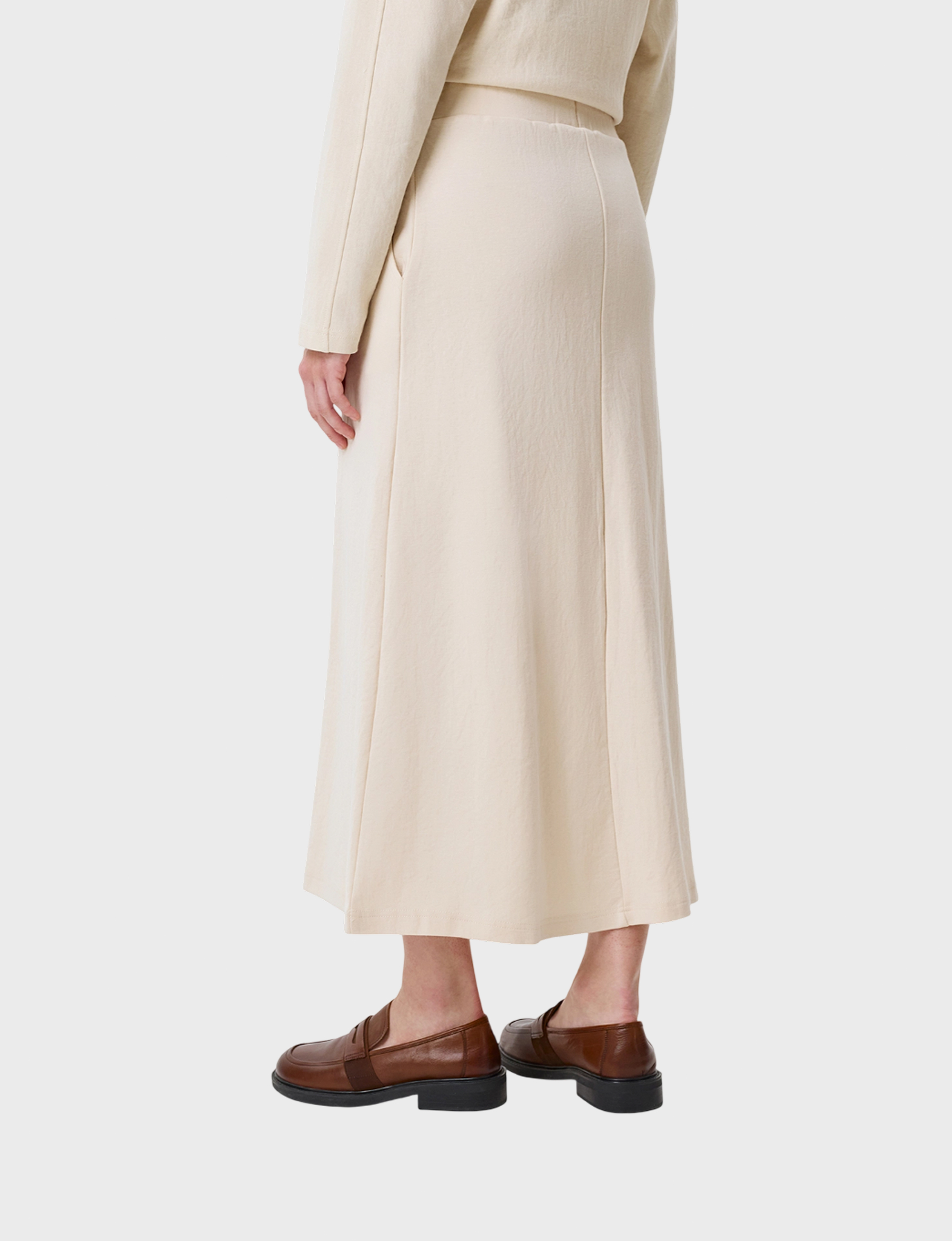 Трикотажная юбка А-силуэта. Длина миди. Боковые карманы в швах. Резинка по линии талии. В составе хлопок и нейлон